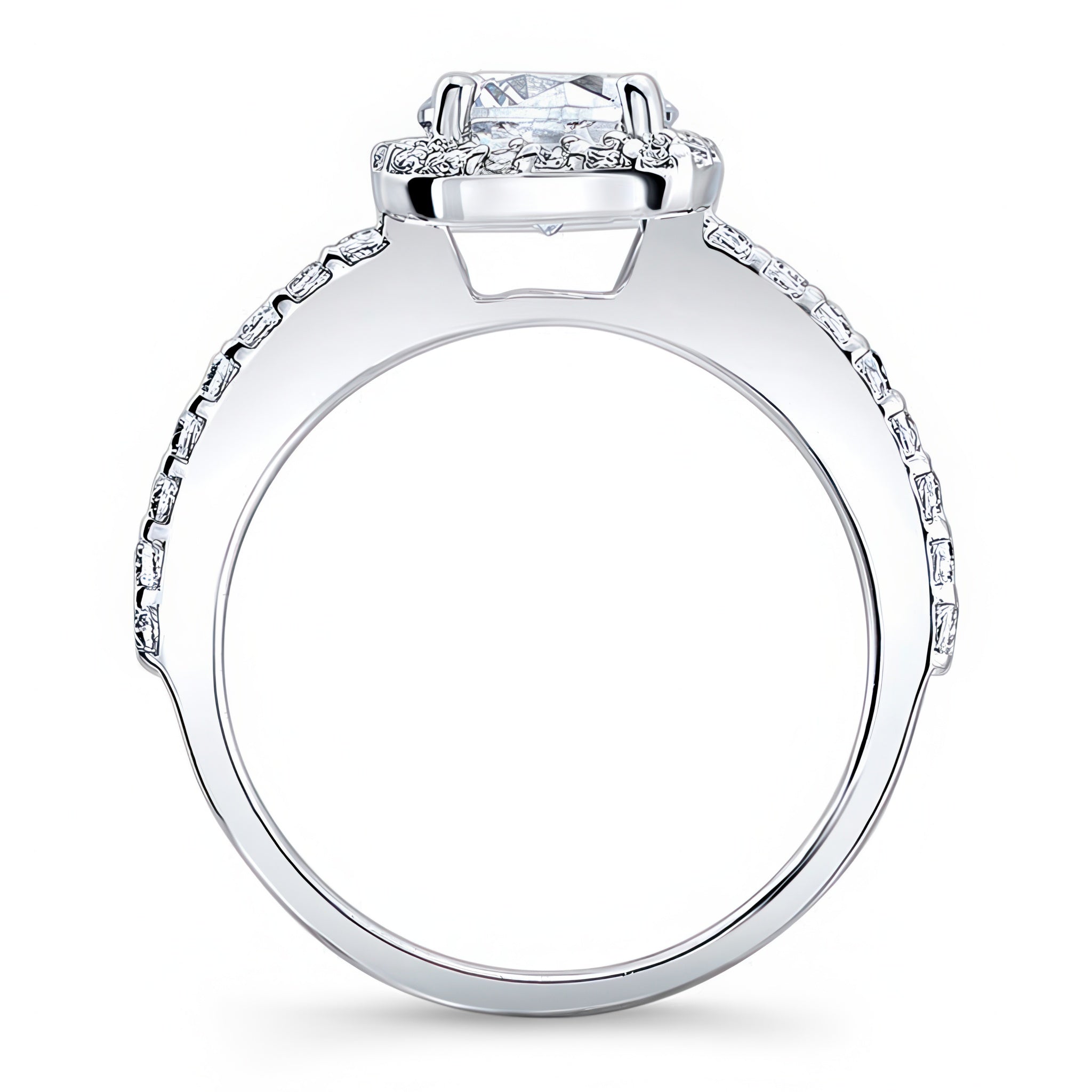 This halo moissanite wedding set features micro pave diamonds encircling the round center and cascading down the shank with two matching diamond wedding bands on the sides for a look of sheer elegance.
