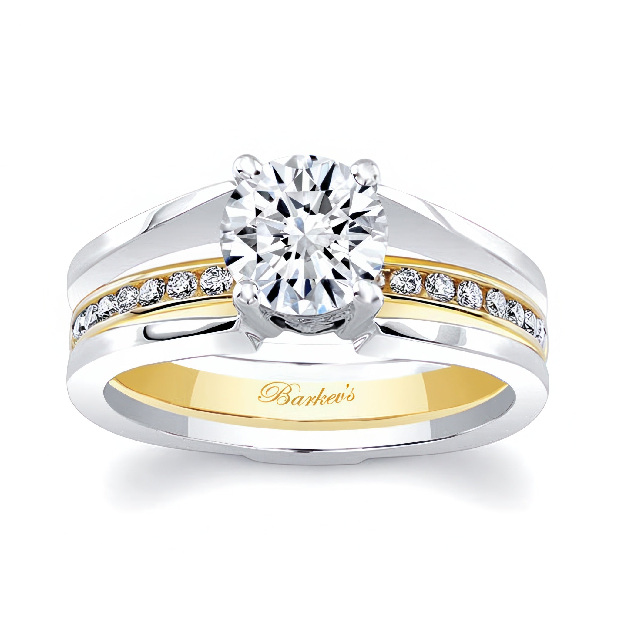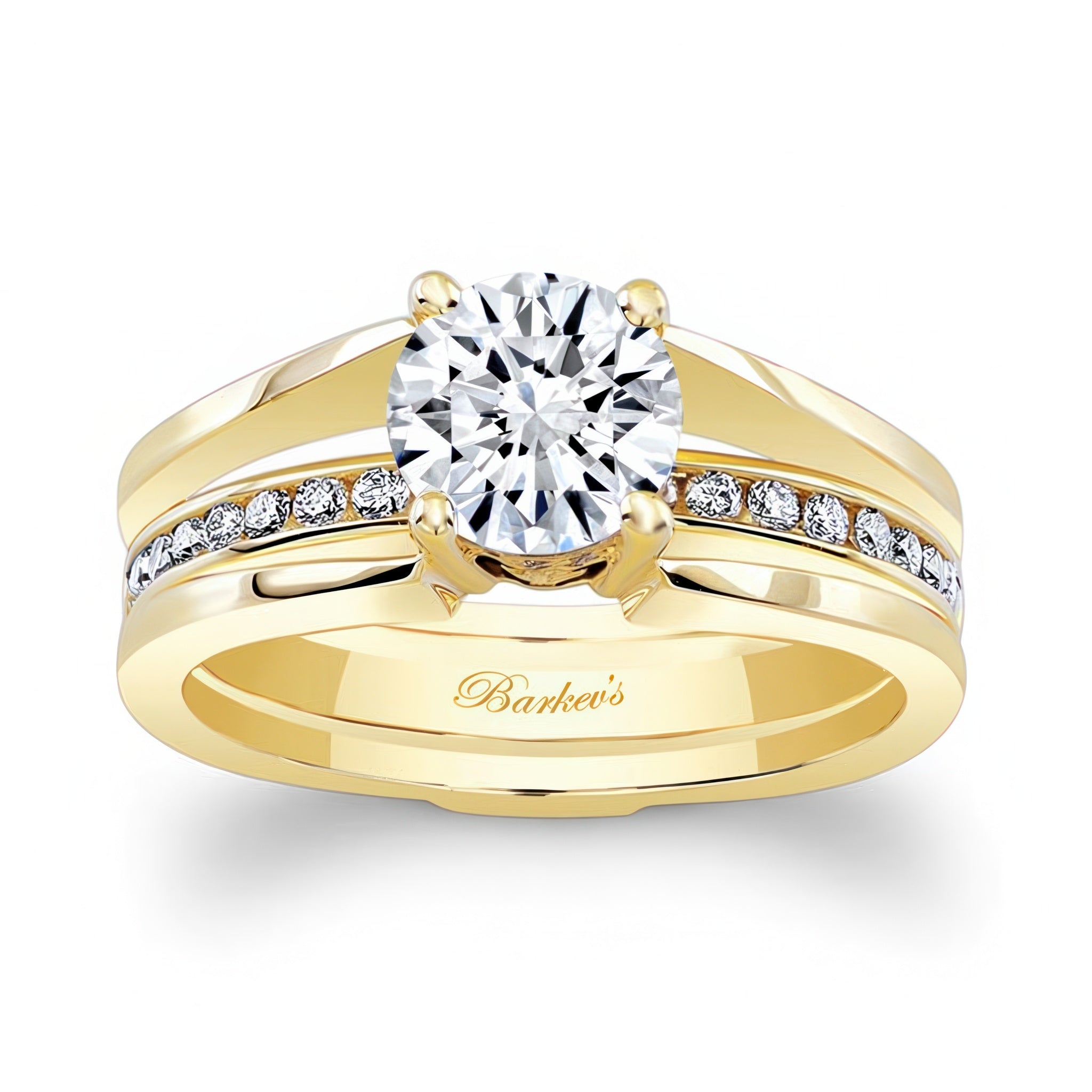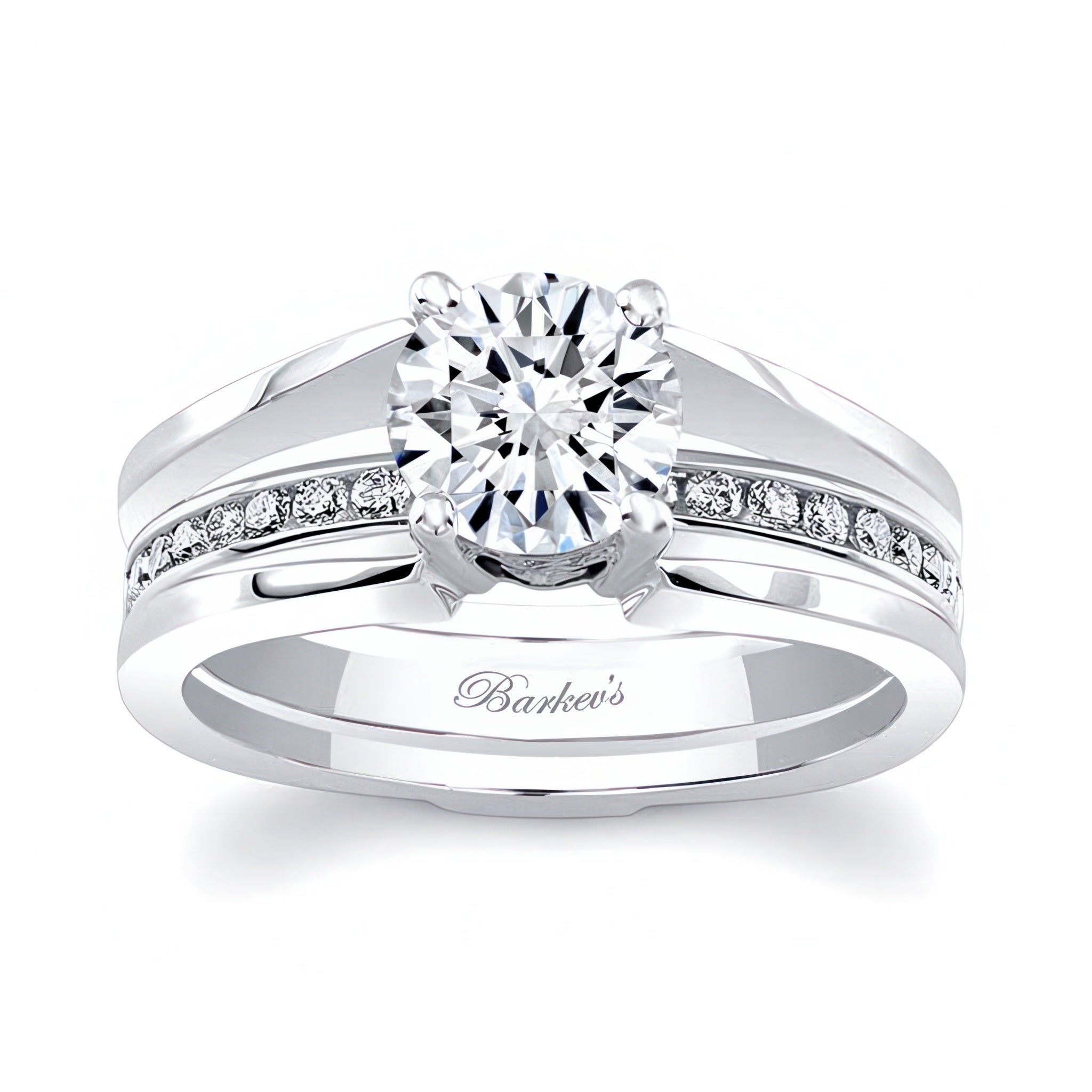 This interlock moissanite bridal set features a prong set round center with diamond accents on the sides and a split shank designed to lock the channel set diamond wedding band in place.