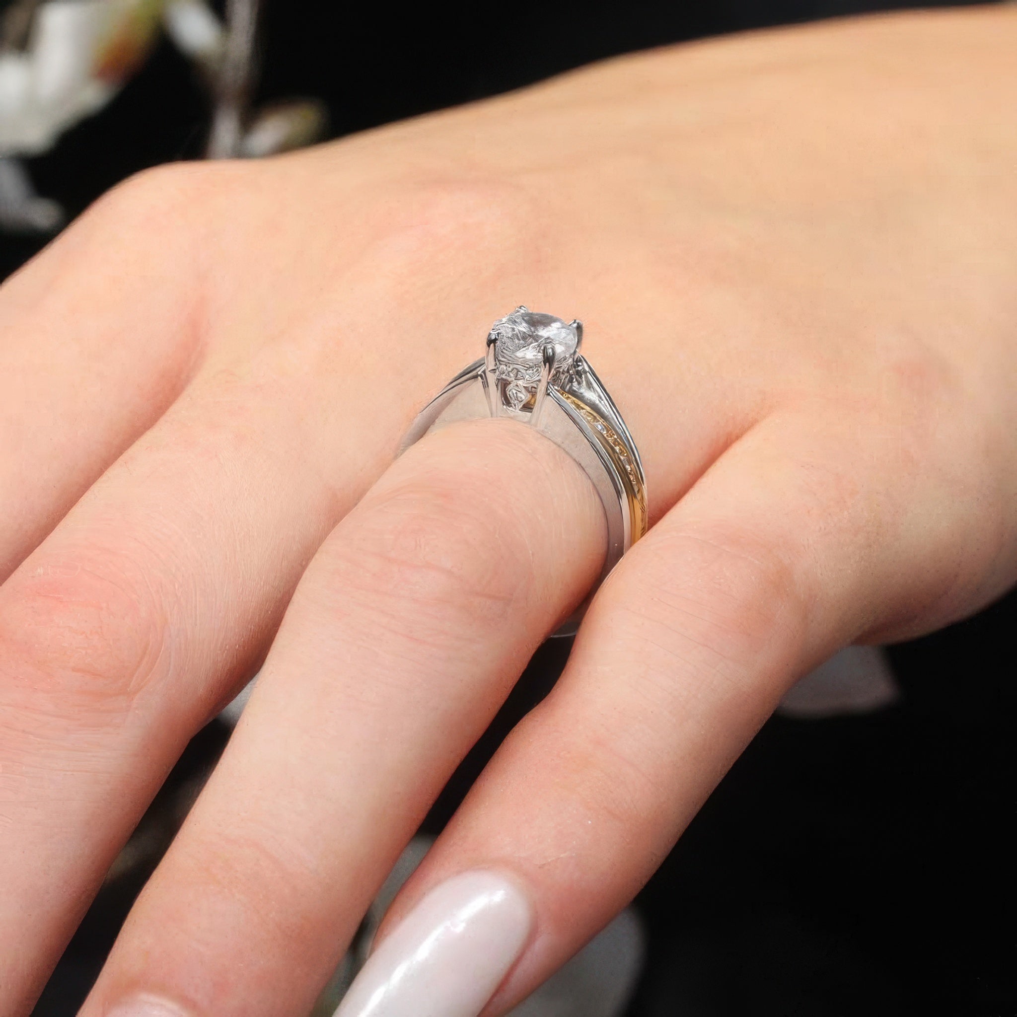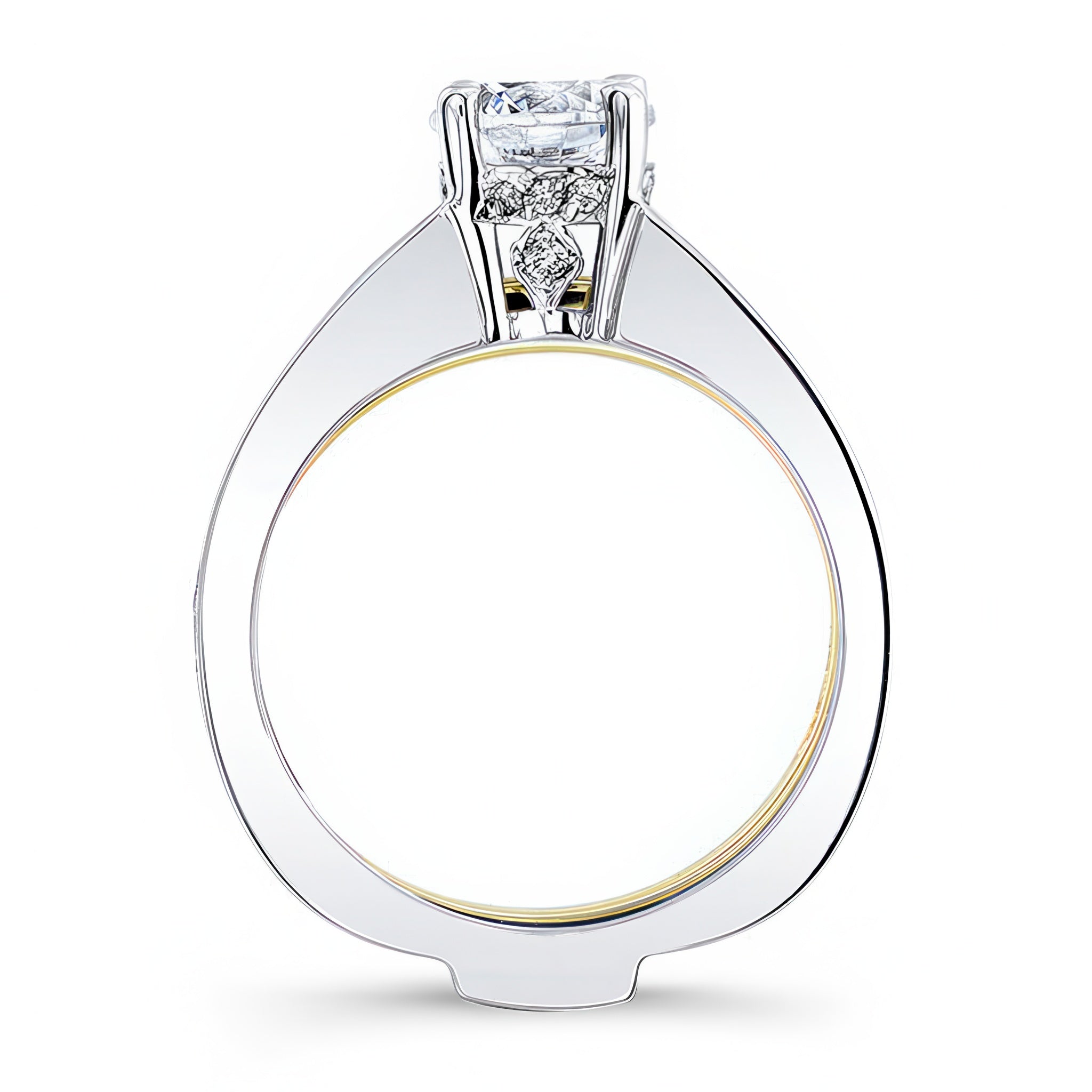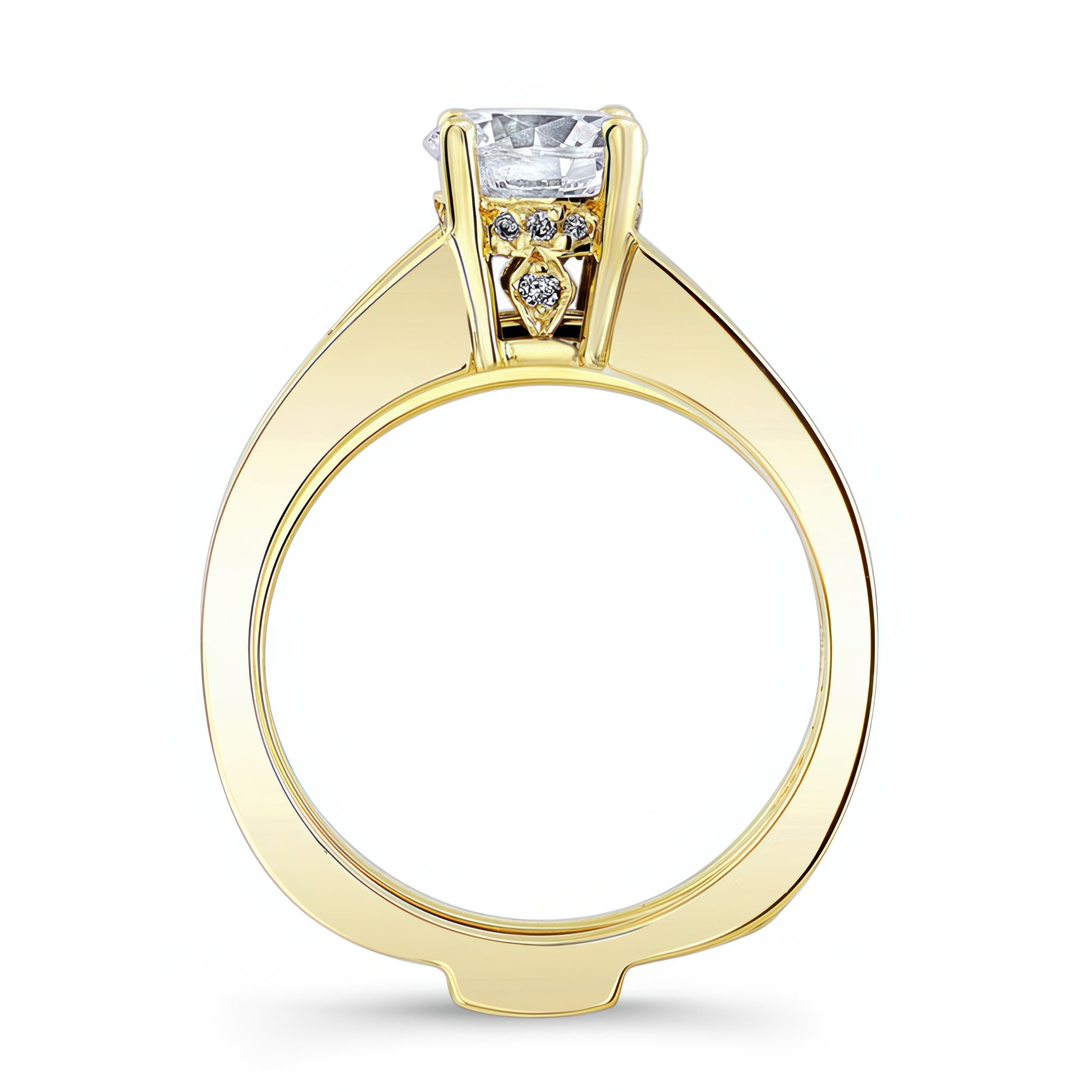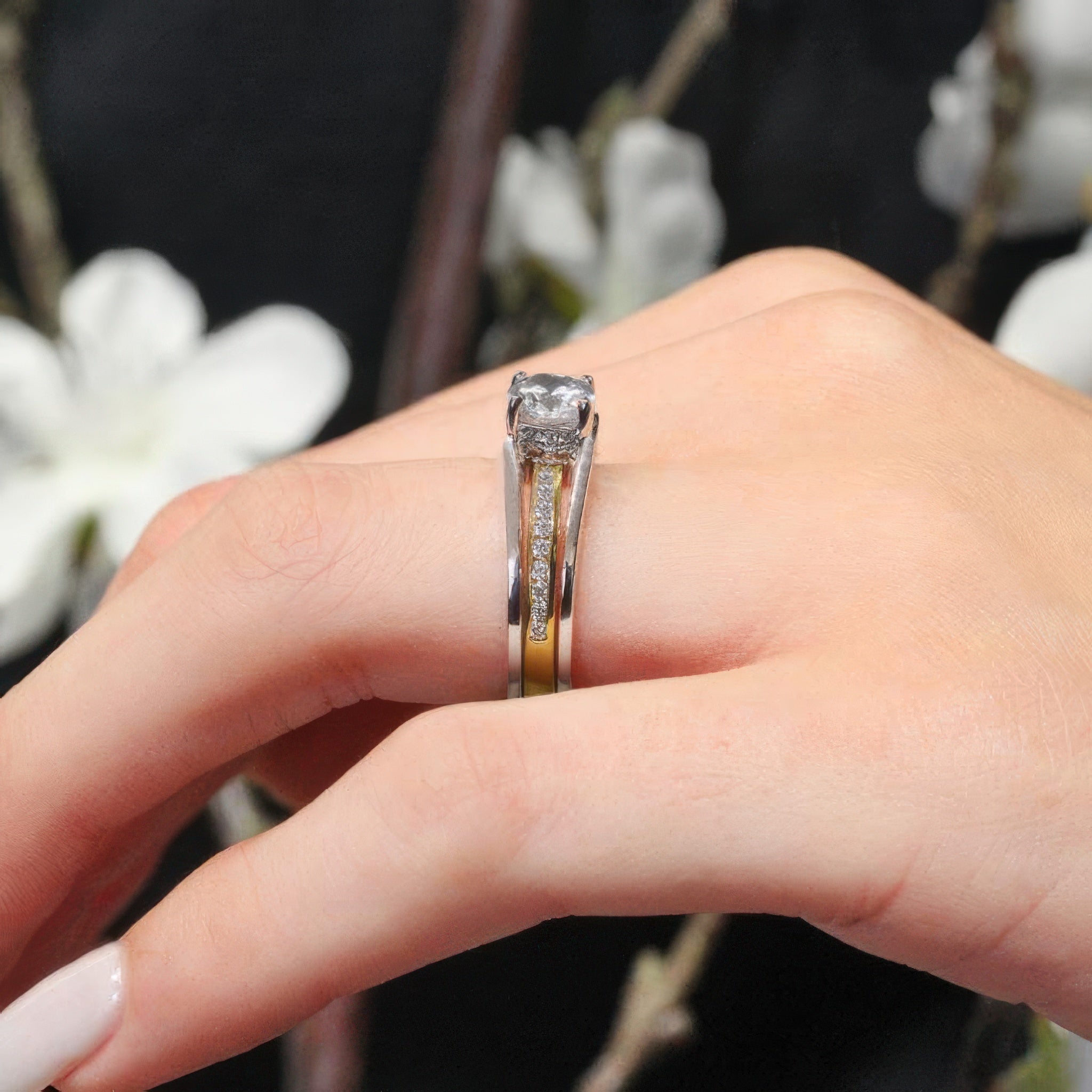 This interlock moissanite bridal set features a prong set round center with diamond accents on the sides and a split shank designed to lock the channel set diamond wedding band in place.