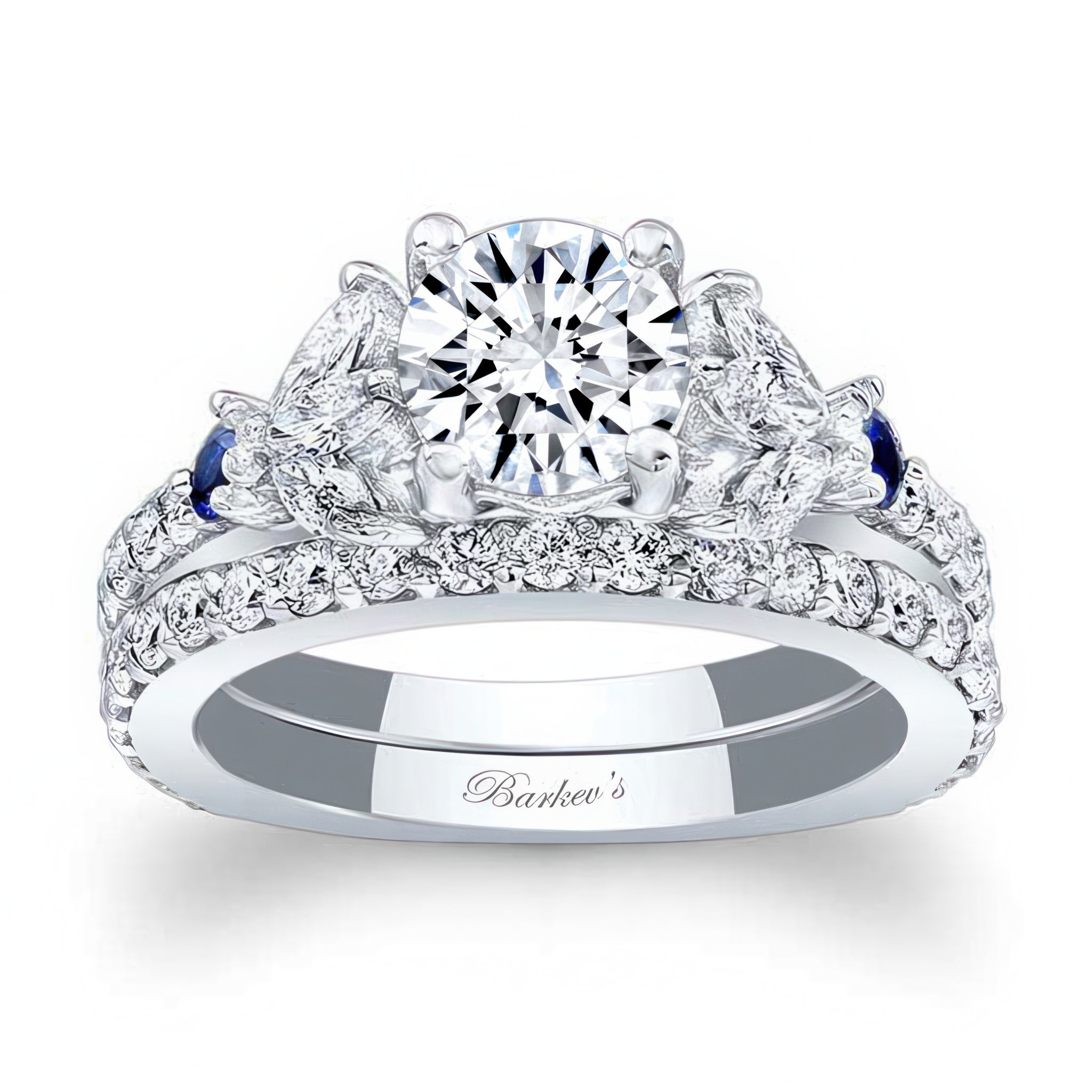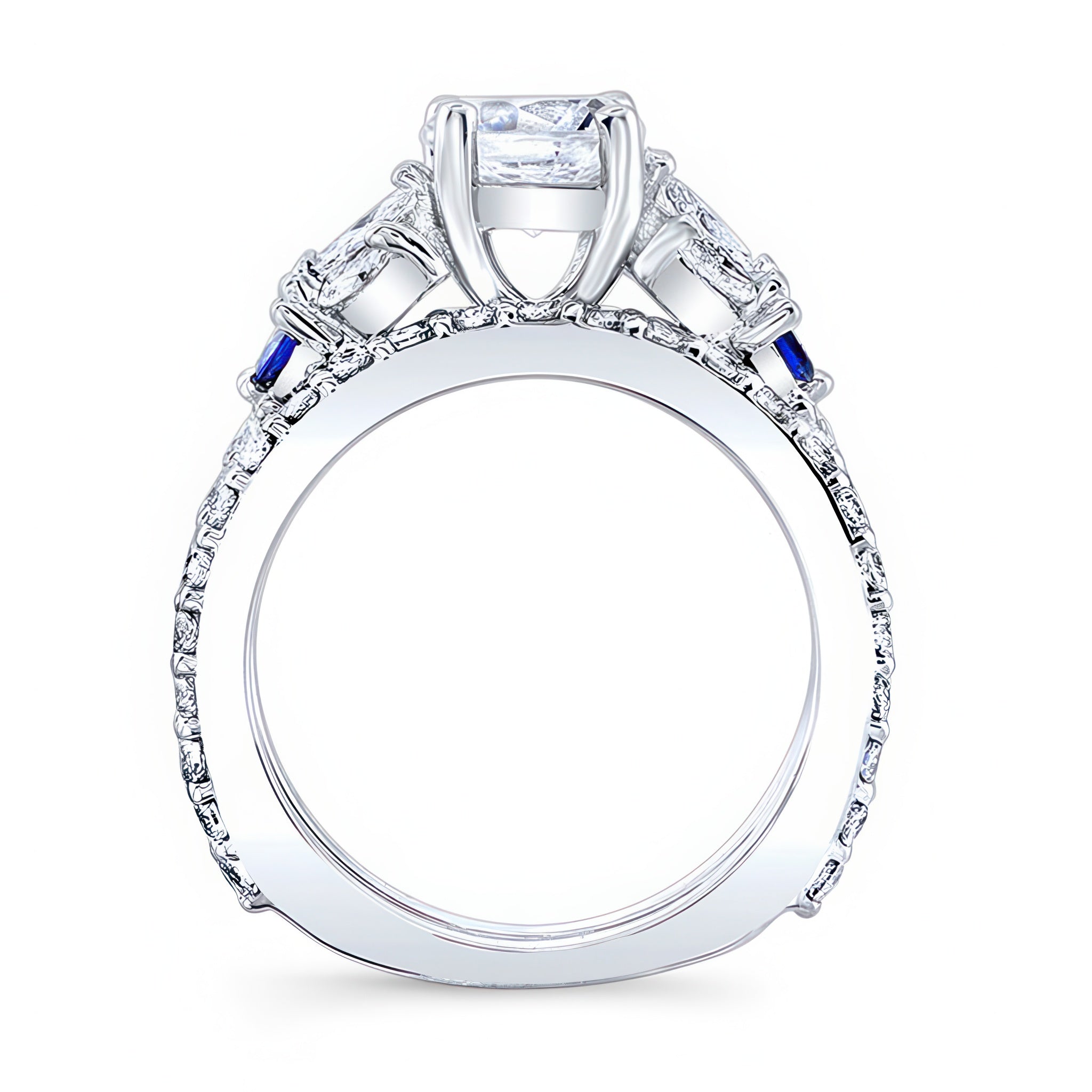 This marquise and round blue sapphire accent moissanite ring set features a prong set center with blue sapphires and fancy cut marquise and round diamonds embellishing the shoulders for an elegant flare. Comes with a matching wedding band.