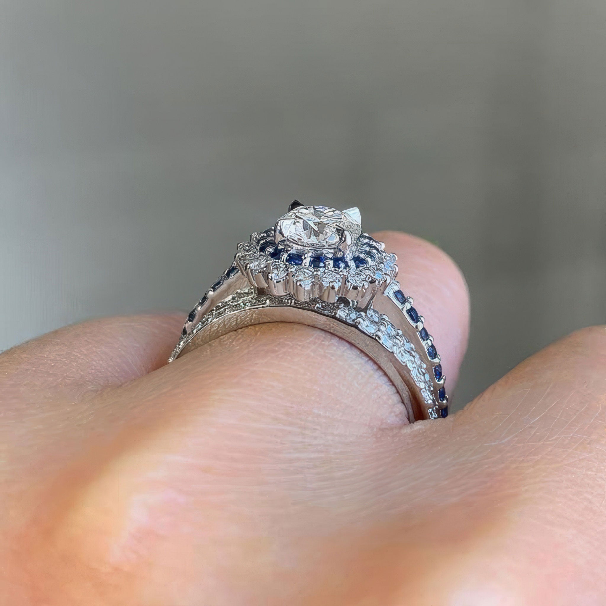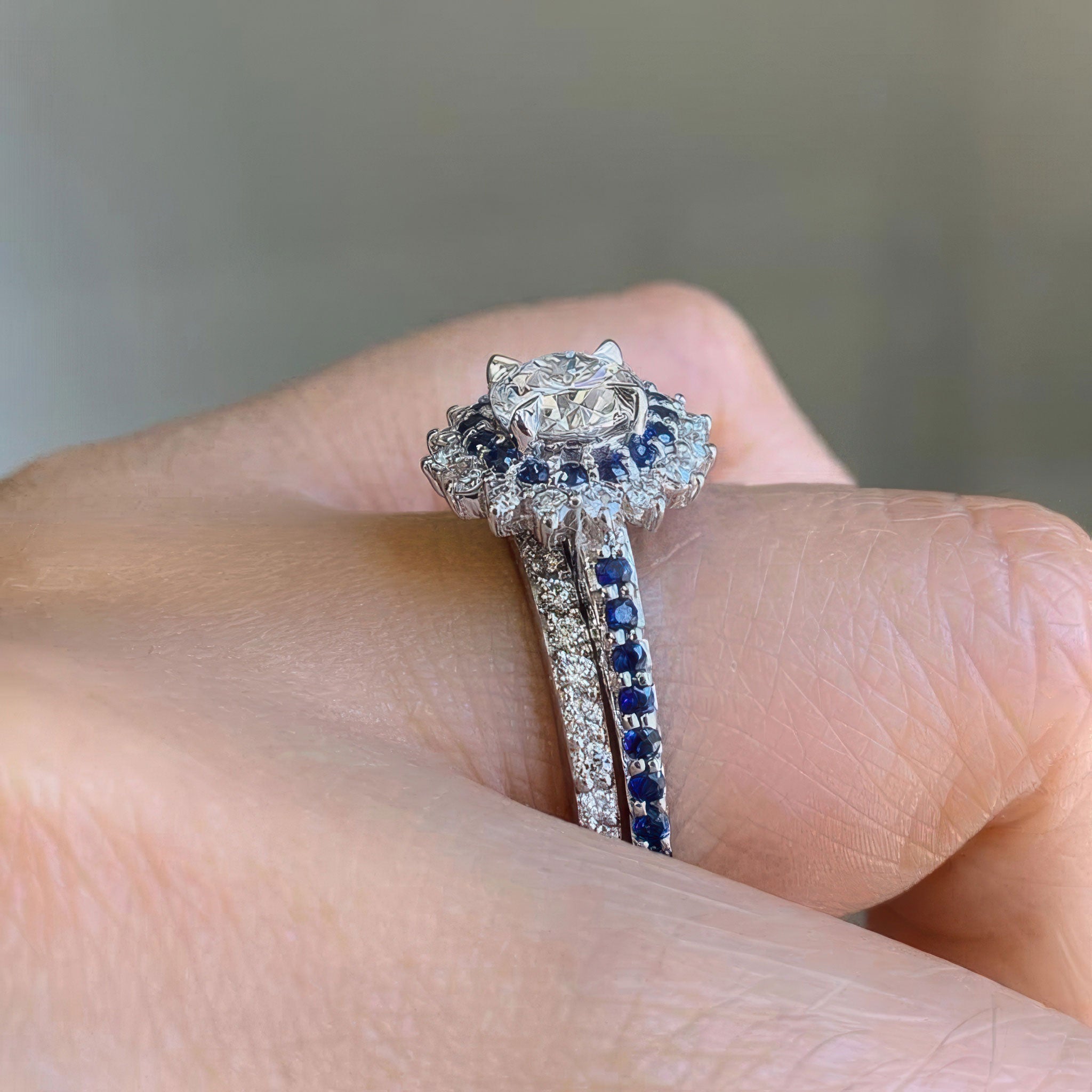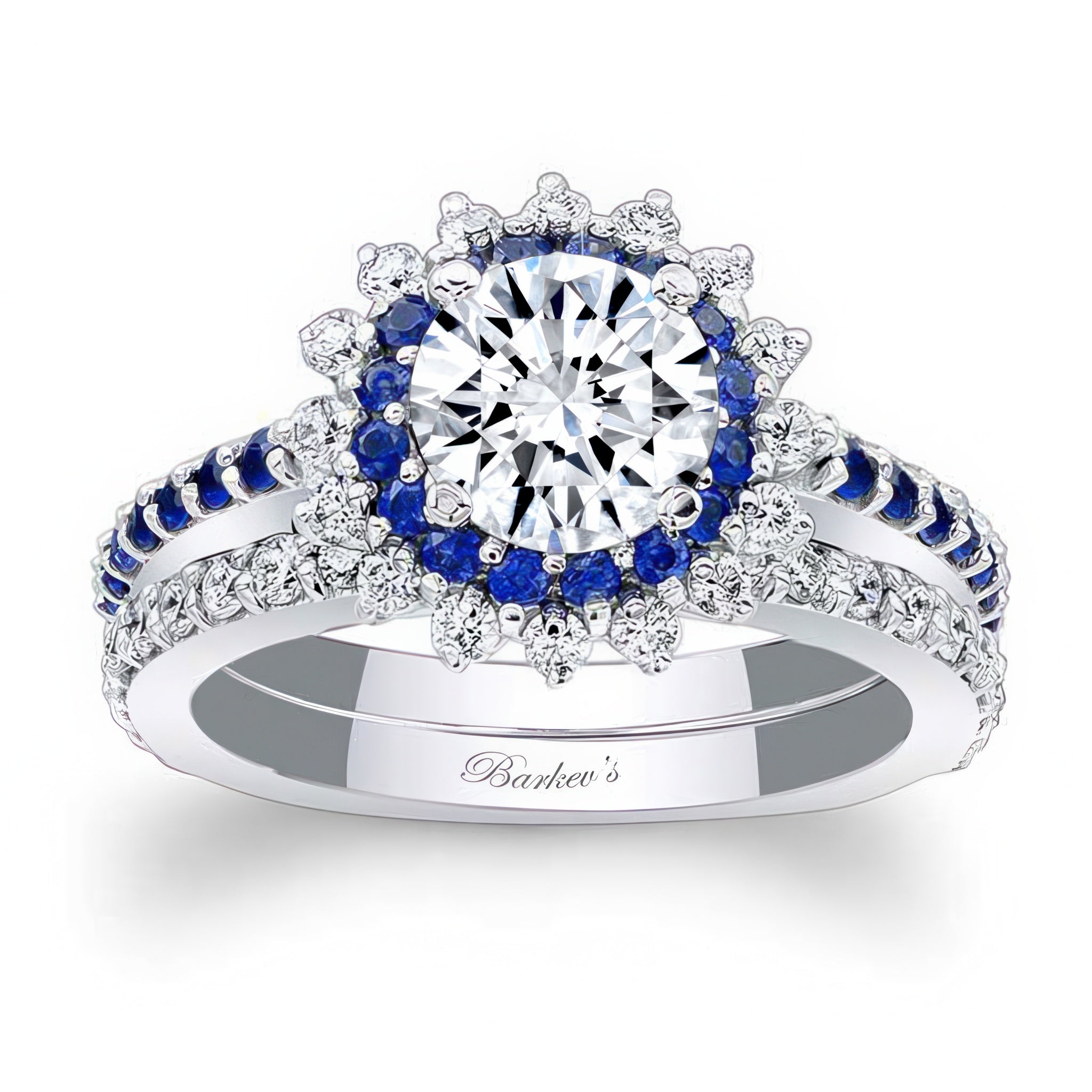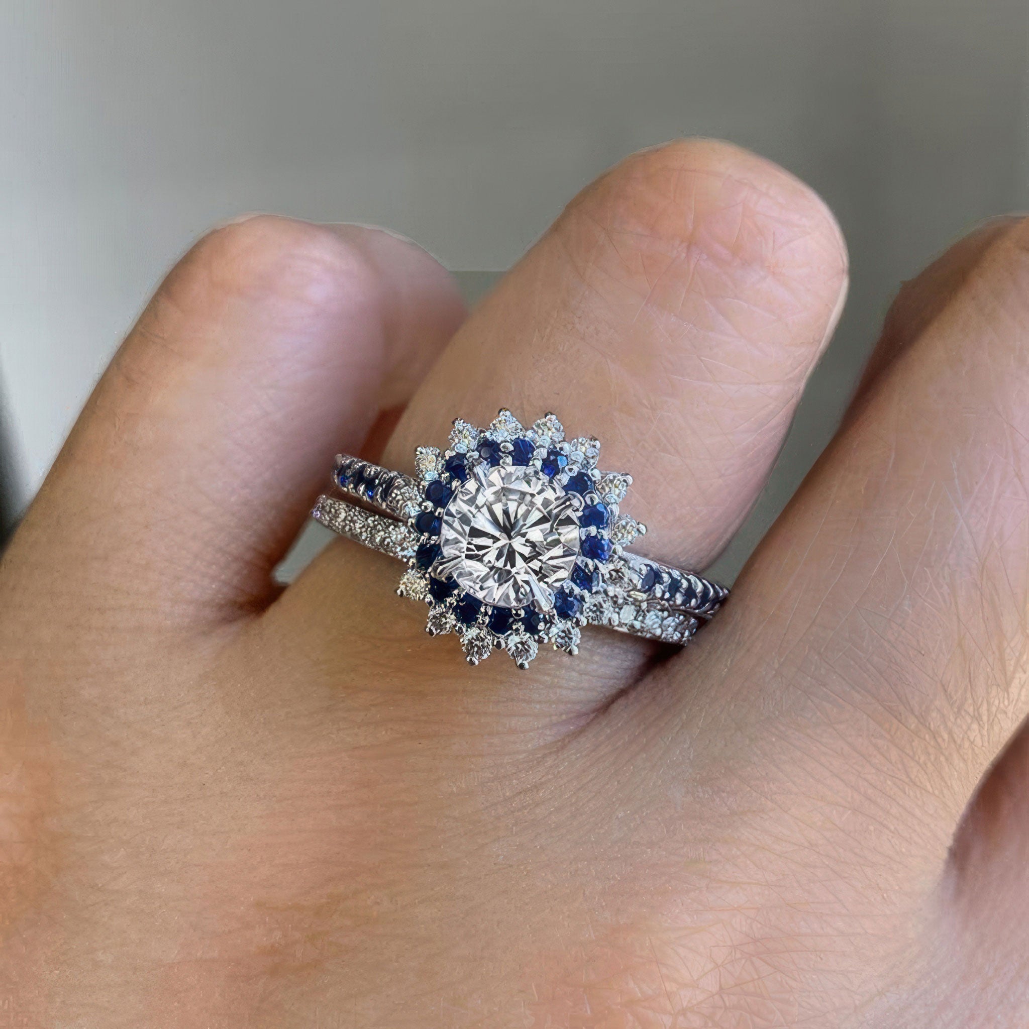 This moissanite blue sapphire accent sunflower bridal set features a prong set round center with two rows of halo diamonds and blue sapphires. The dainty shank is adorned with shared prong set blue sapphires running down the shoulders. Comes with a diamond wedding band for an elegant finish.