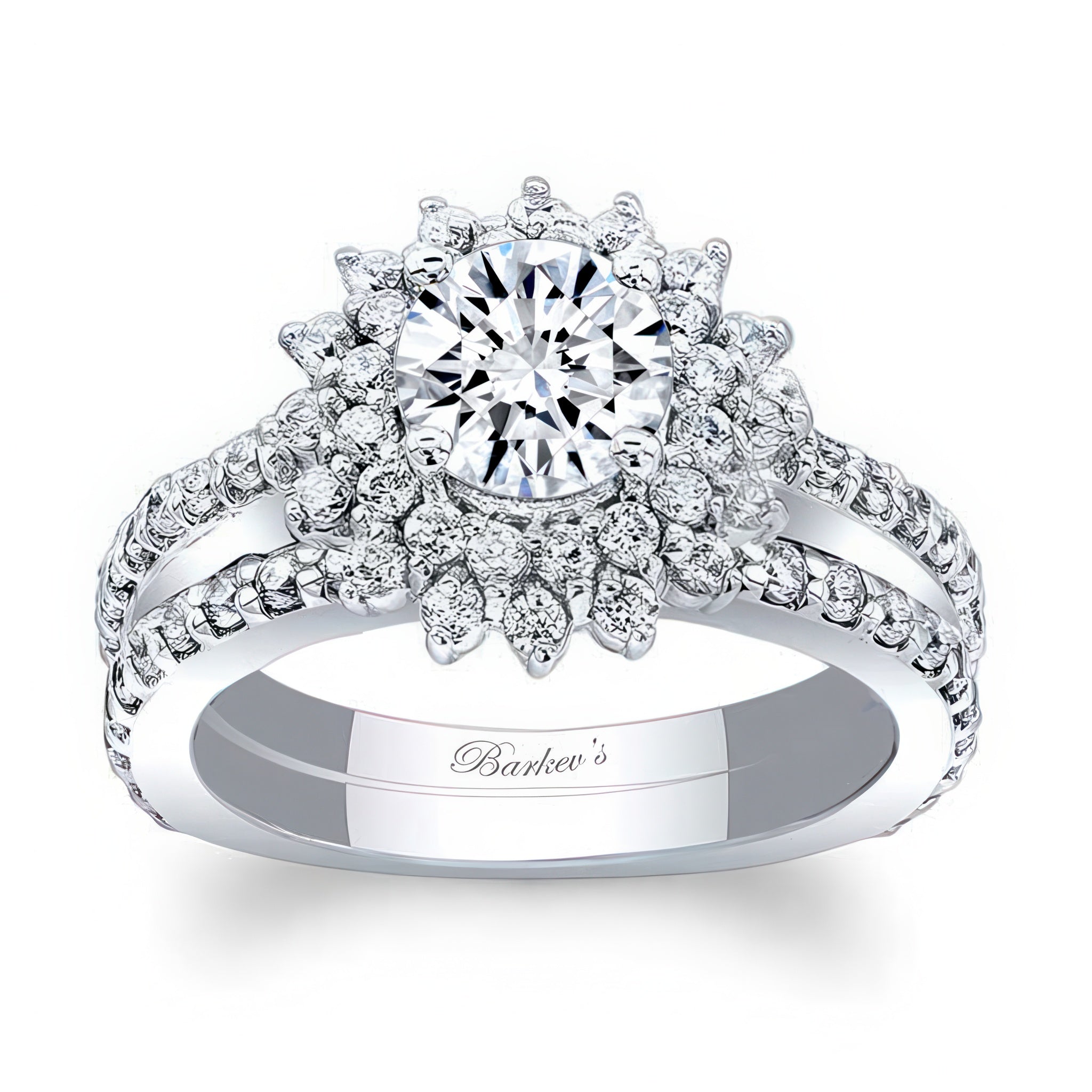 This moissanite sunflower bridal set features a prong set round center with two rows of halo diamonds. The dainty shank is adorned with shared prong set diamonds running down the shoulders. Comes with a diamond wedding band for an elegant finish.