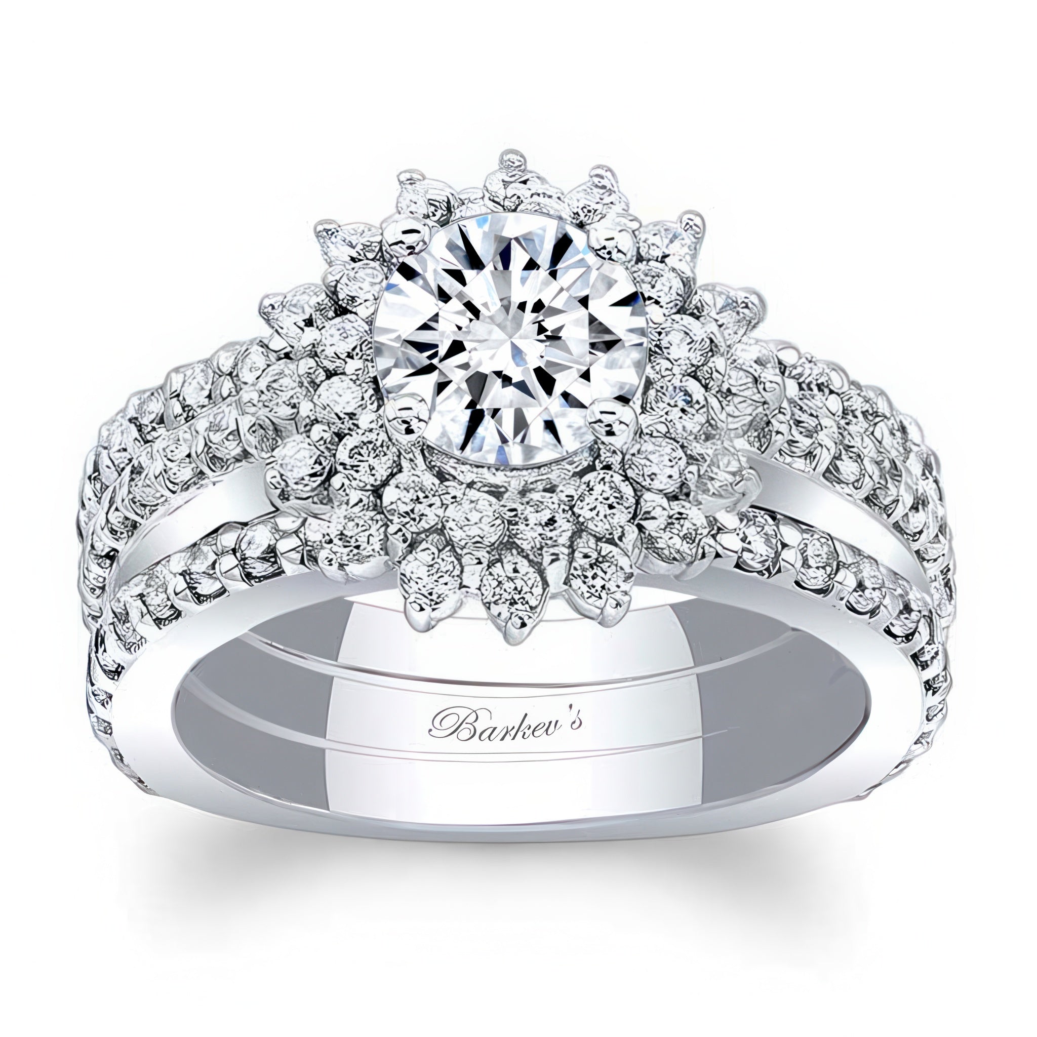 This moissanite sunflower bridal set with 2 bands features a prong set round center with two rows of halo diamonds. The dainty shank is adorned with shared prong set diamonds running down the shoulders. Comes with a pair of diamond wedding bands for an elegant finish.