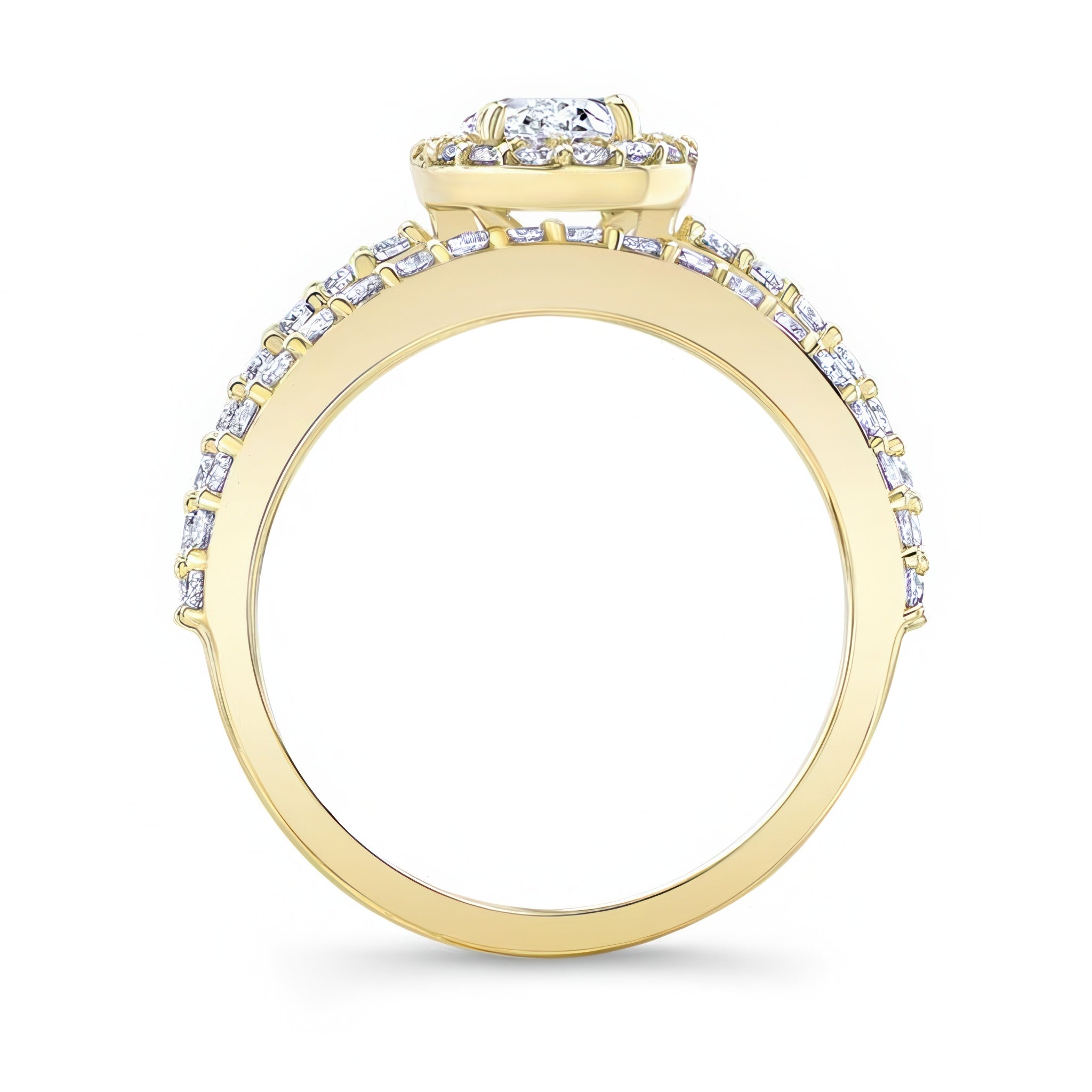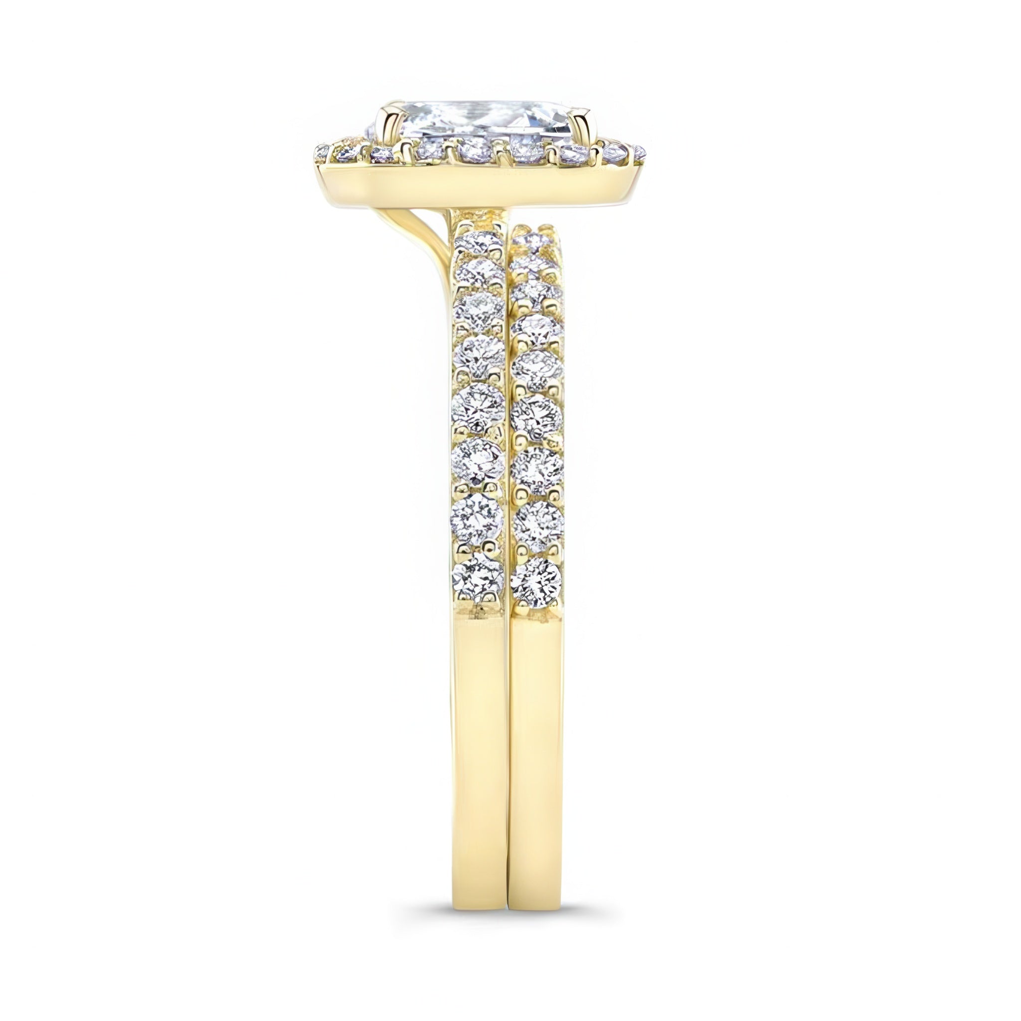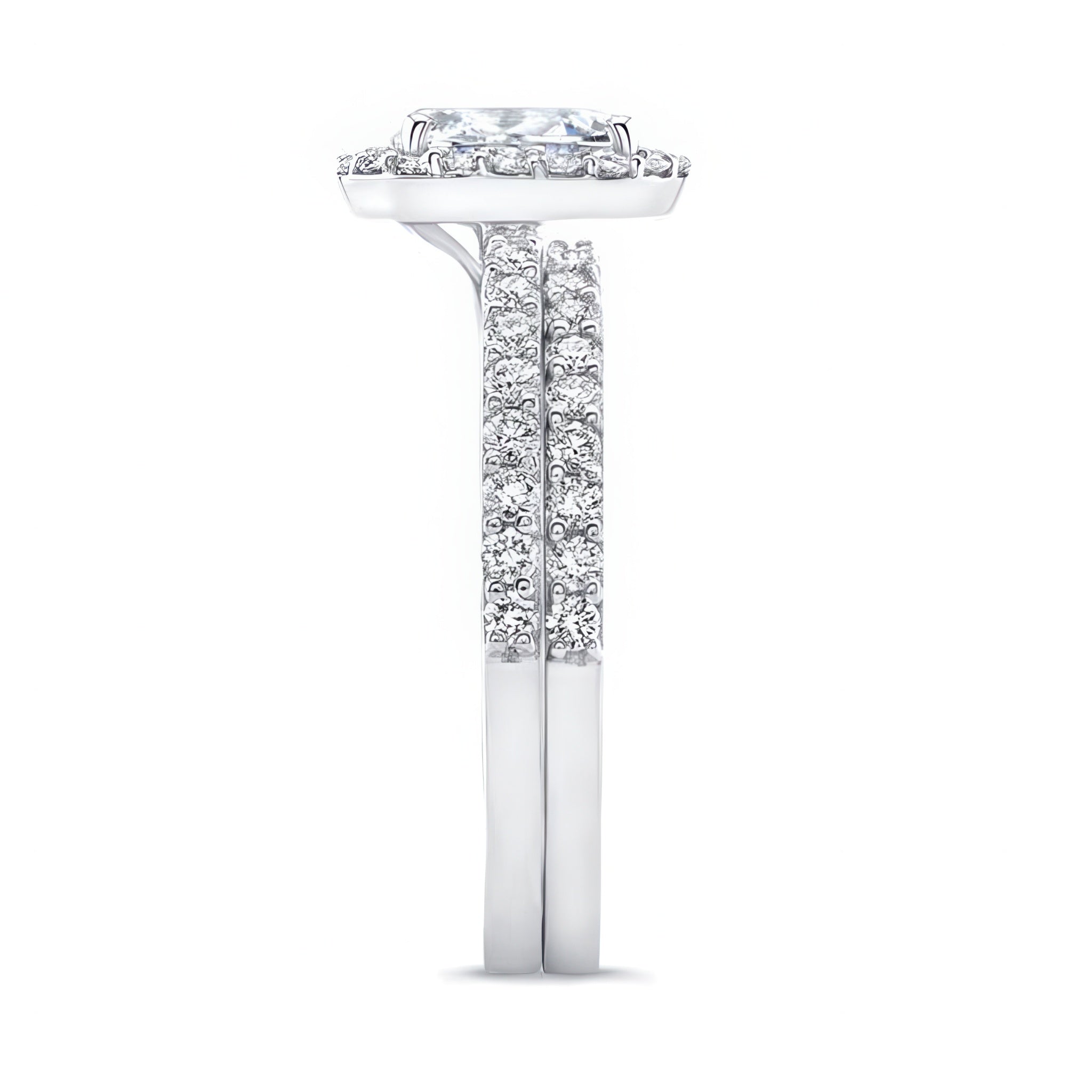 A classic oval moissanite halo wedding set featuring an engagement ring with a 1 carat center surrounded by diamonds, side stones on the bright polished shank and a matching band.