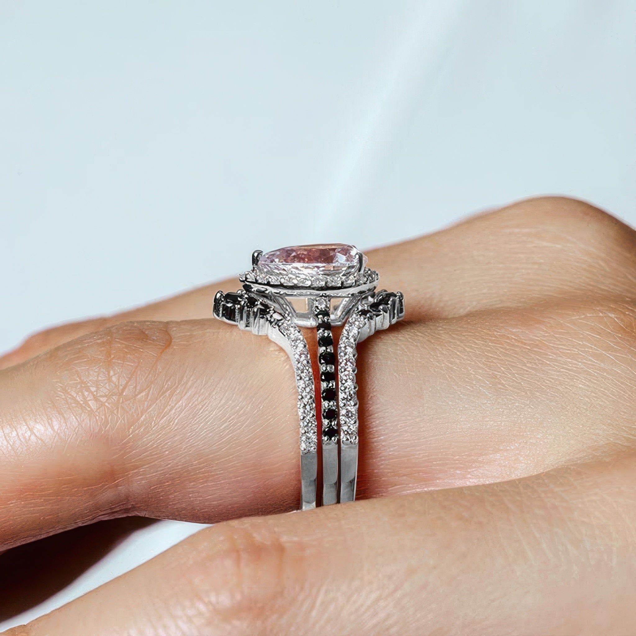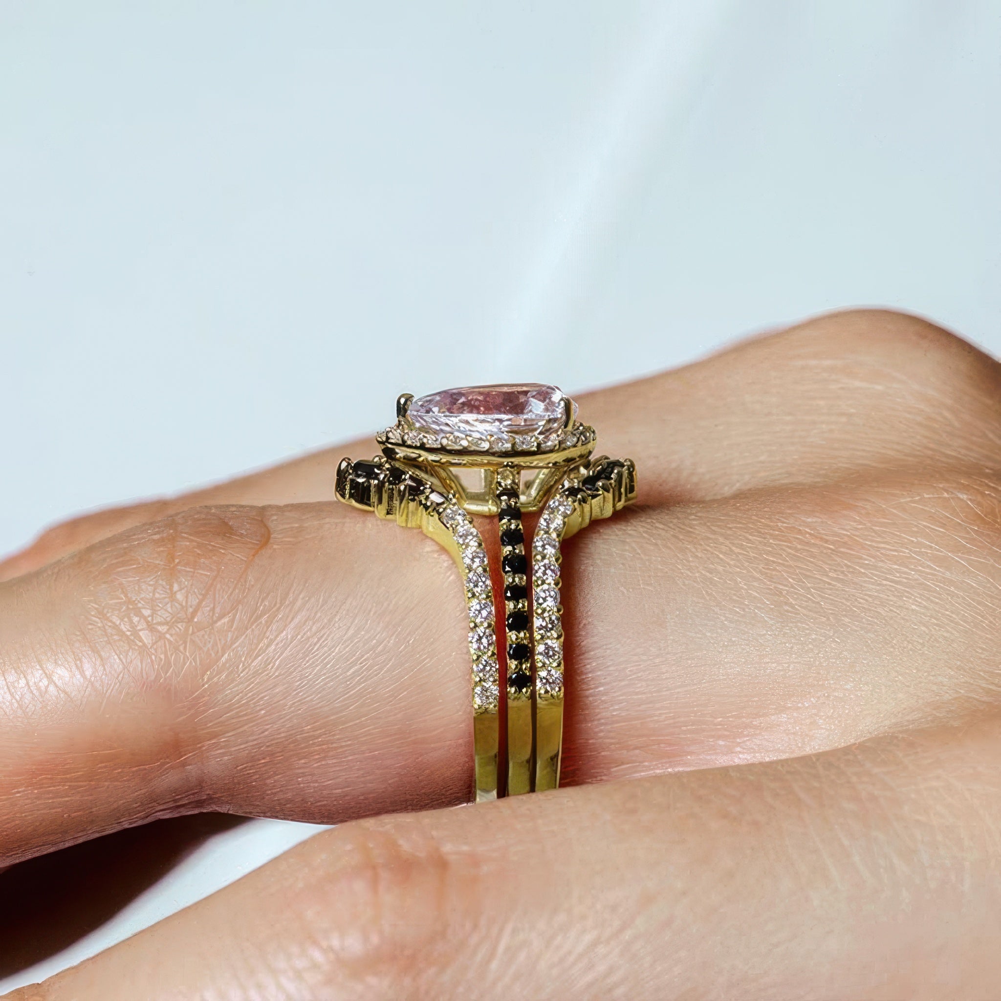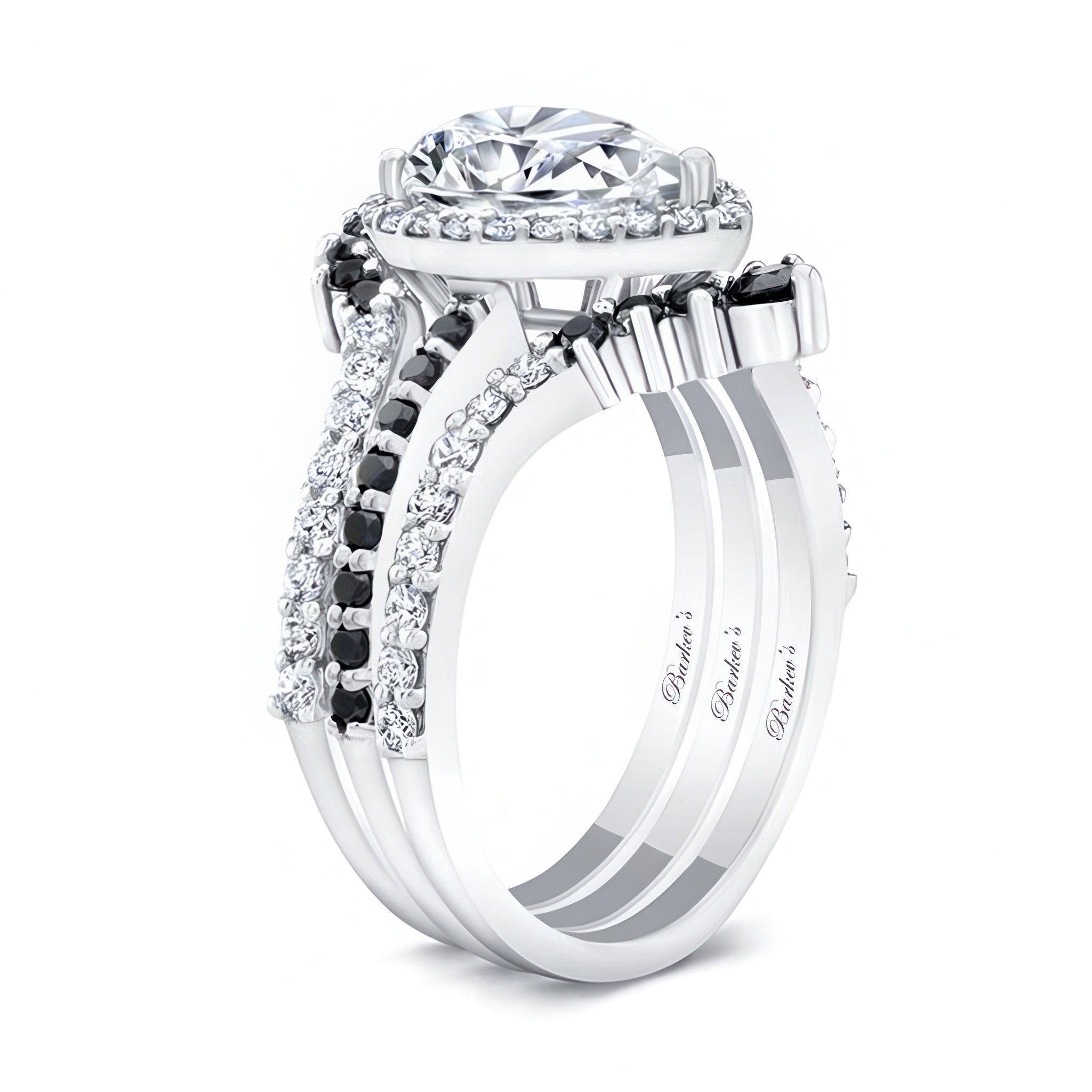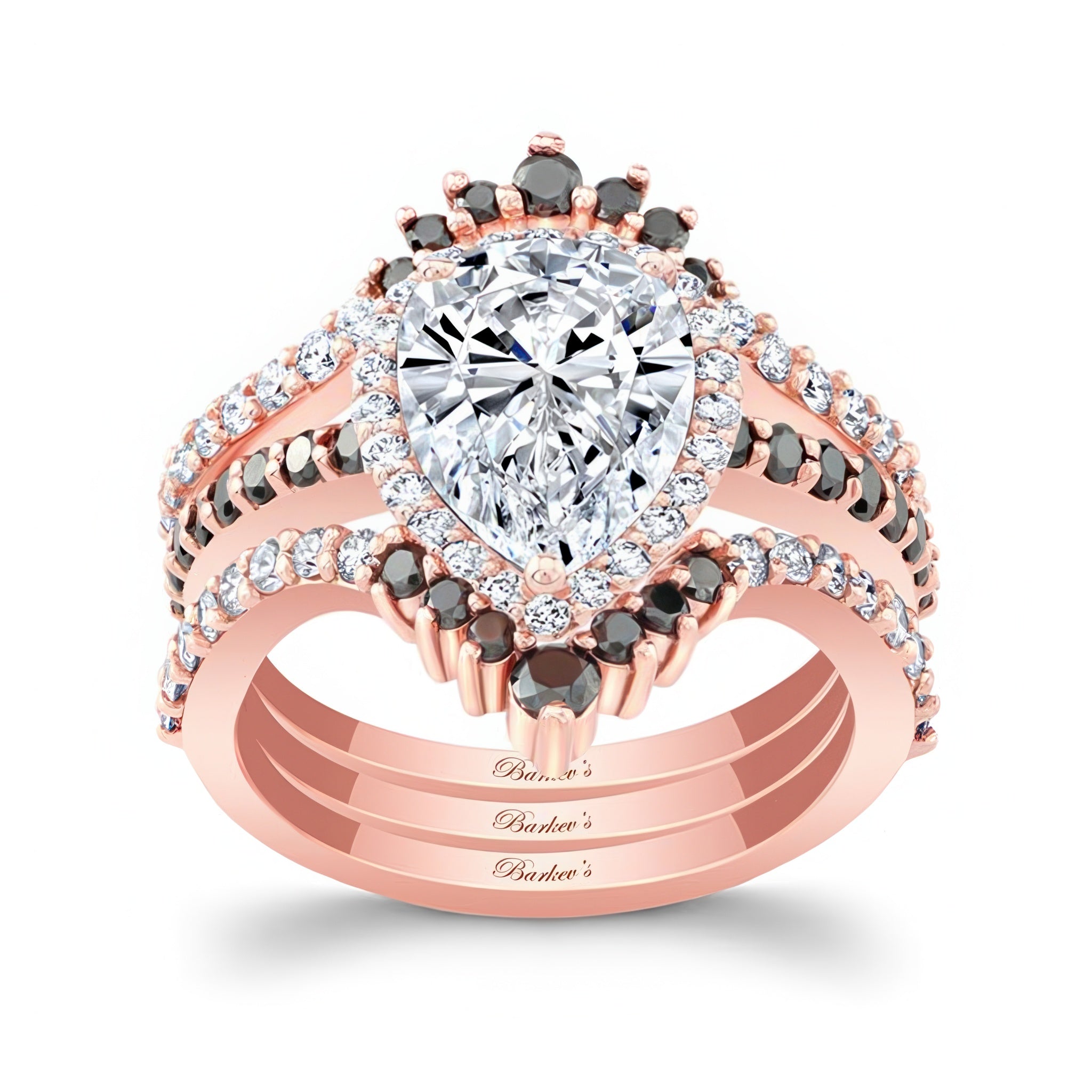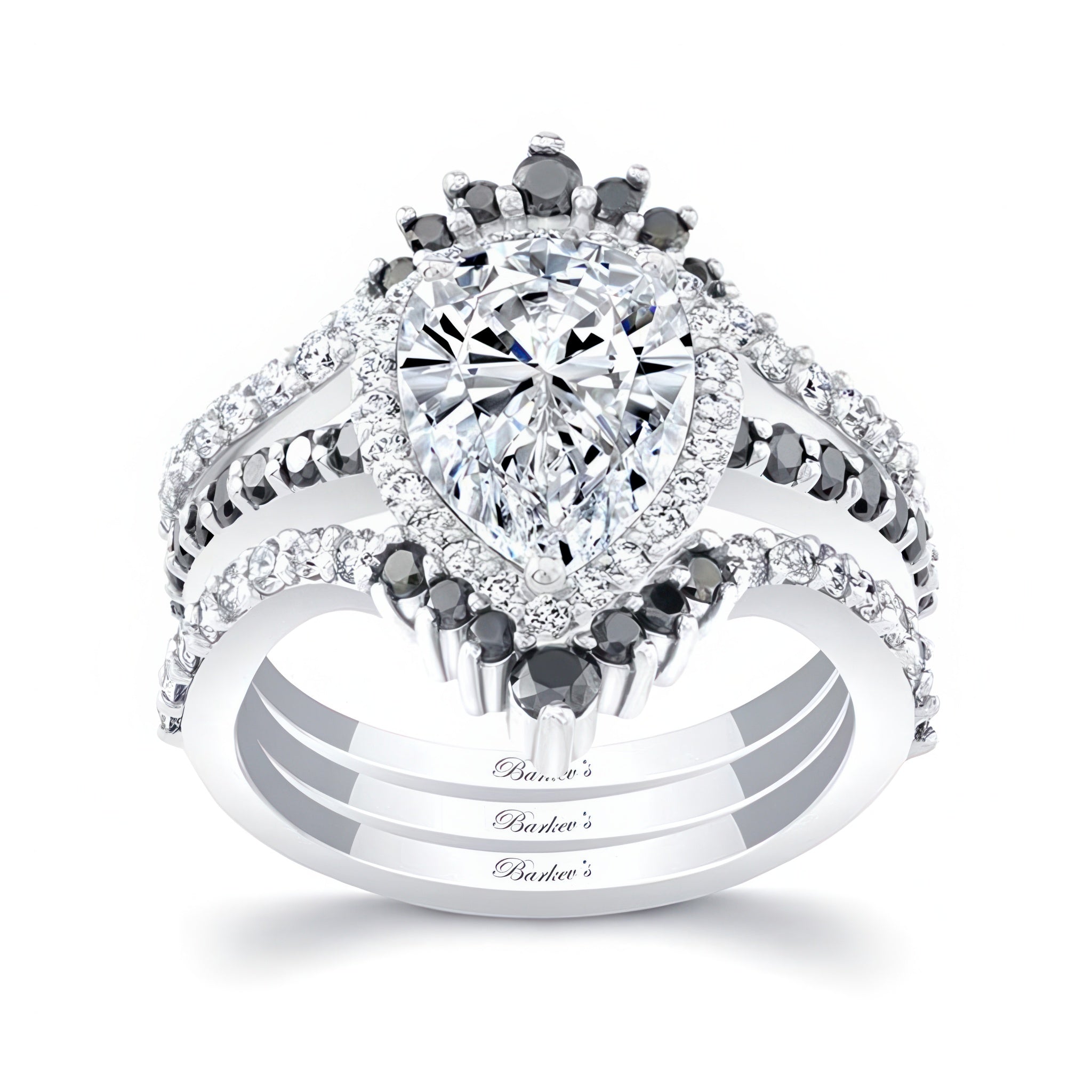 This pear shaped moissanite black diamond accent wedding set with 2 bands features a 2 carat center with a halo of diamonds encircling it and black diamonds cascading down the dainty shank for a look of sheer elegance. Comes with 2 wedding bands mixed with black and white diamonds.