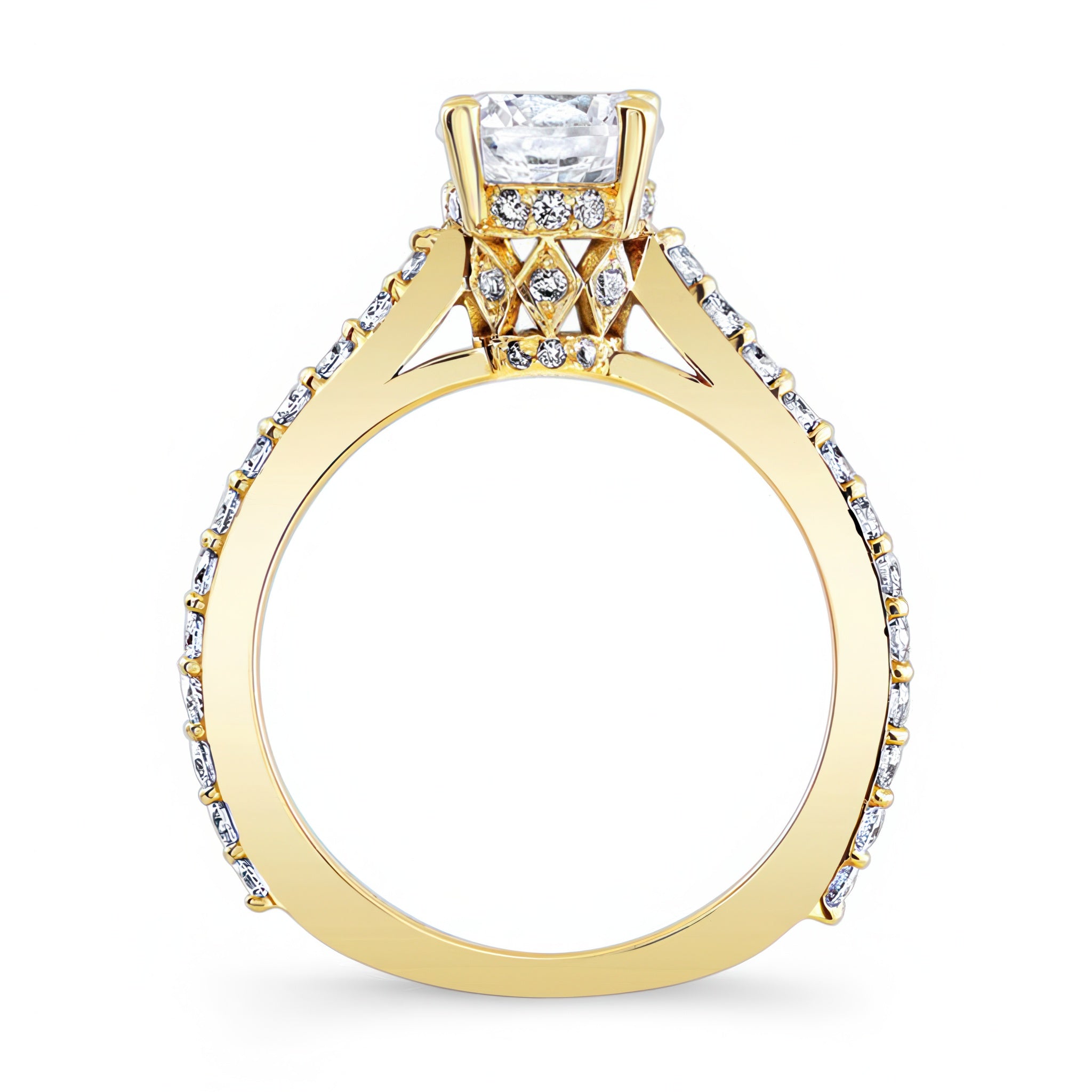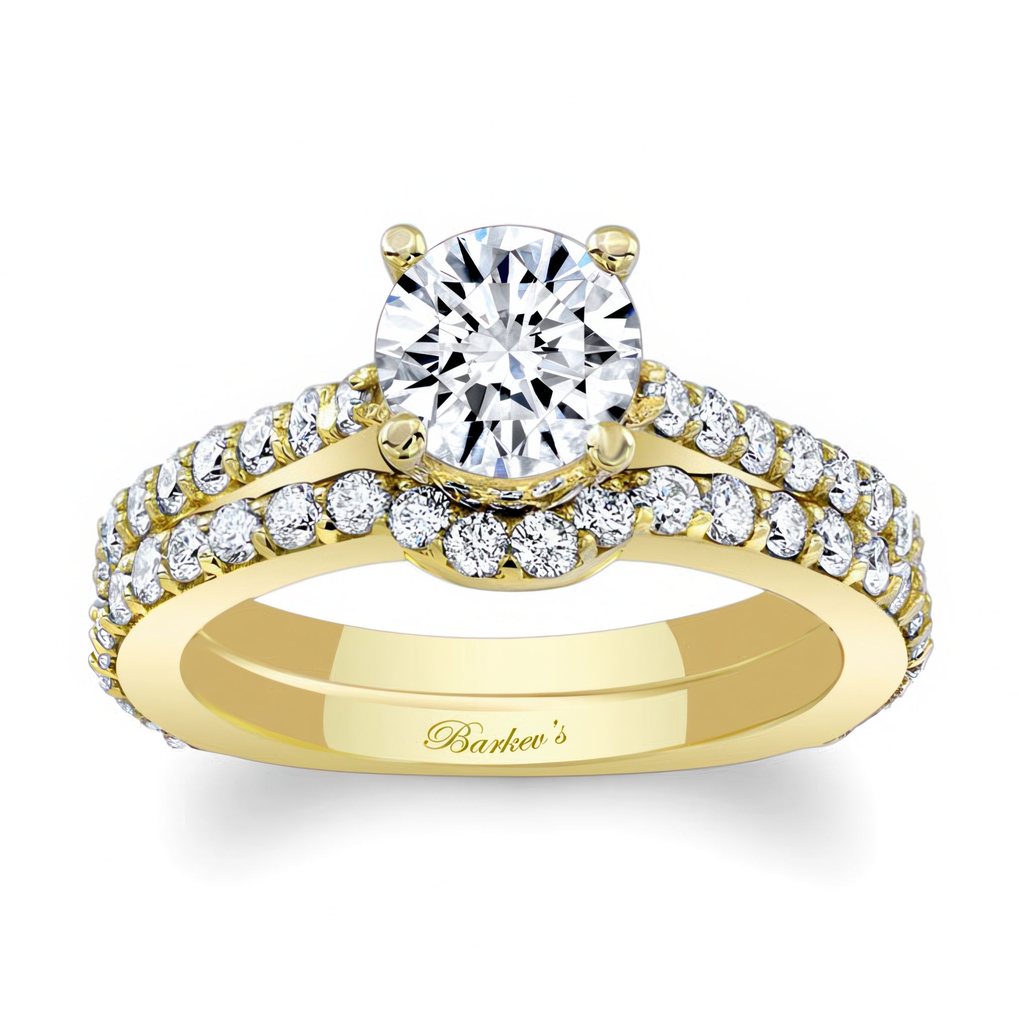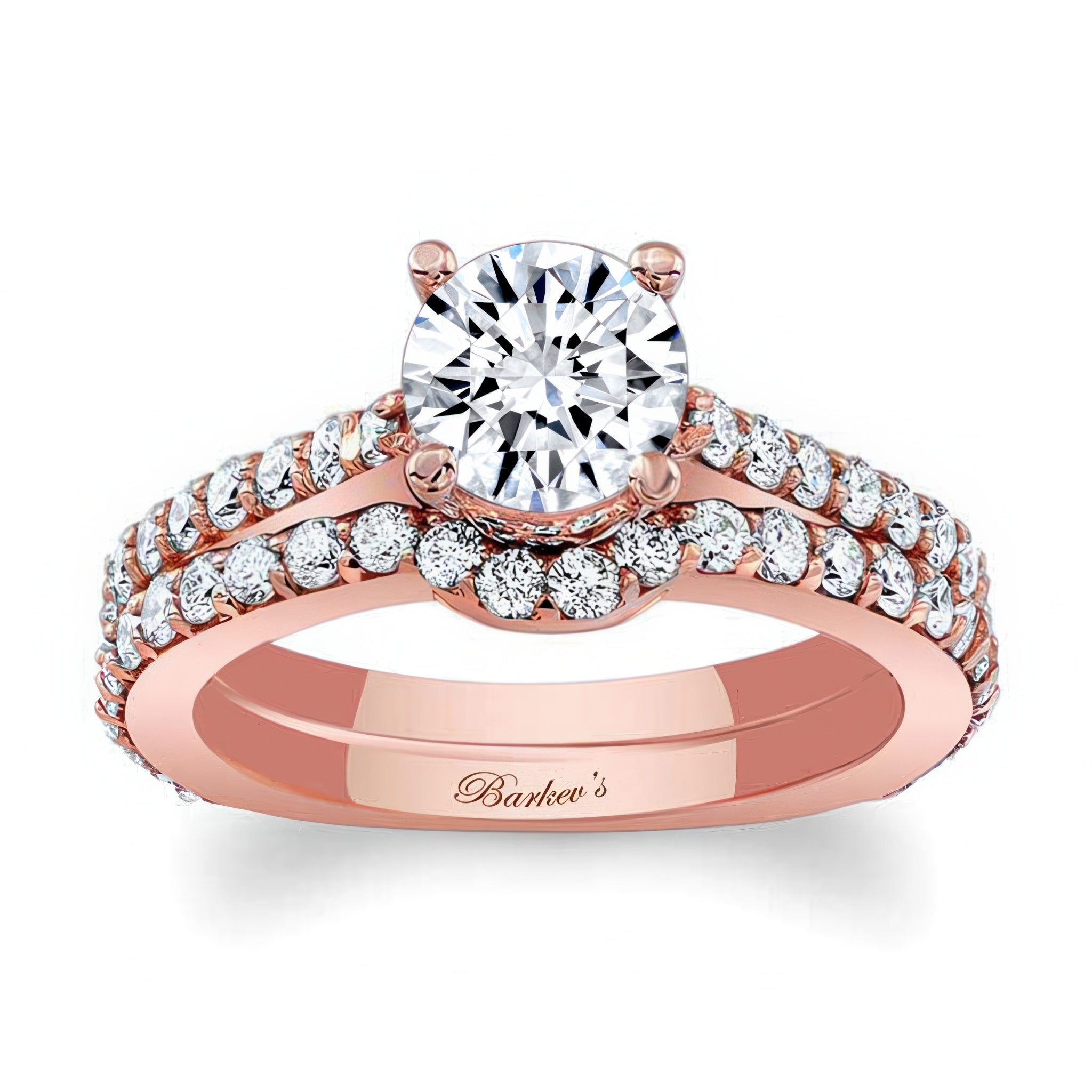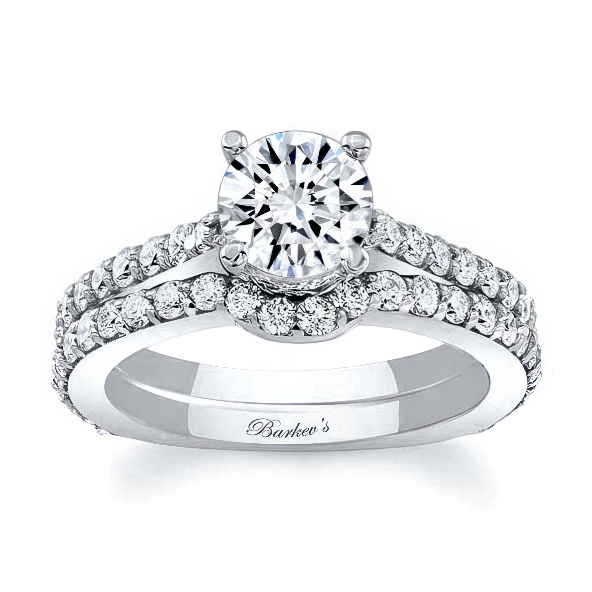 This traditional moissanite ring set features a prong set round center with shared prong set diamonds gracing the shoulders and matching wedding band.
