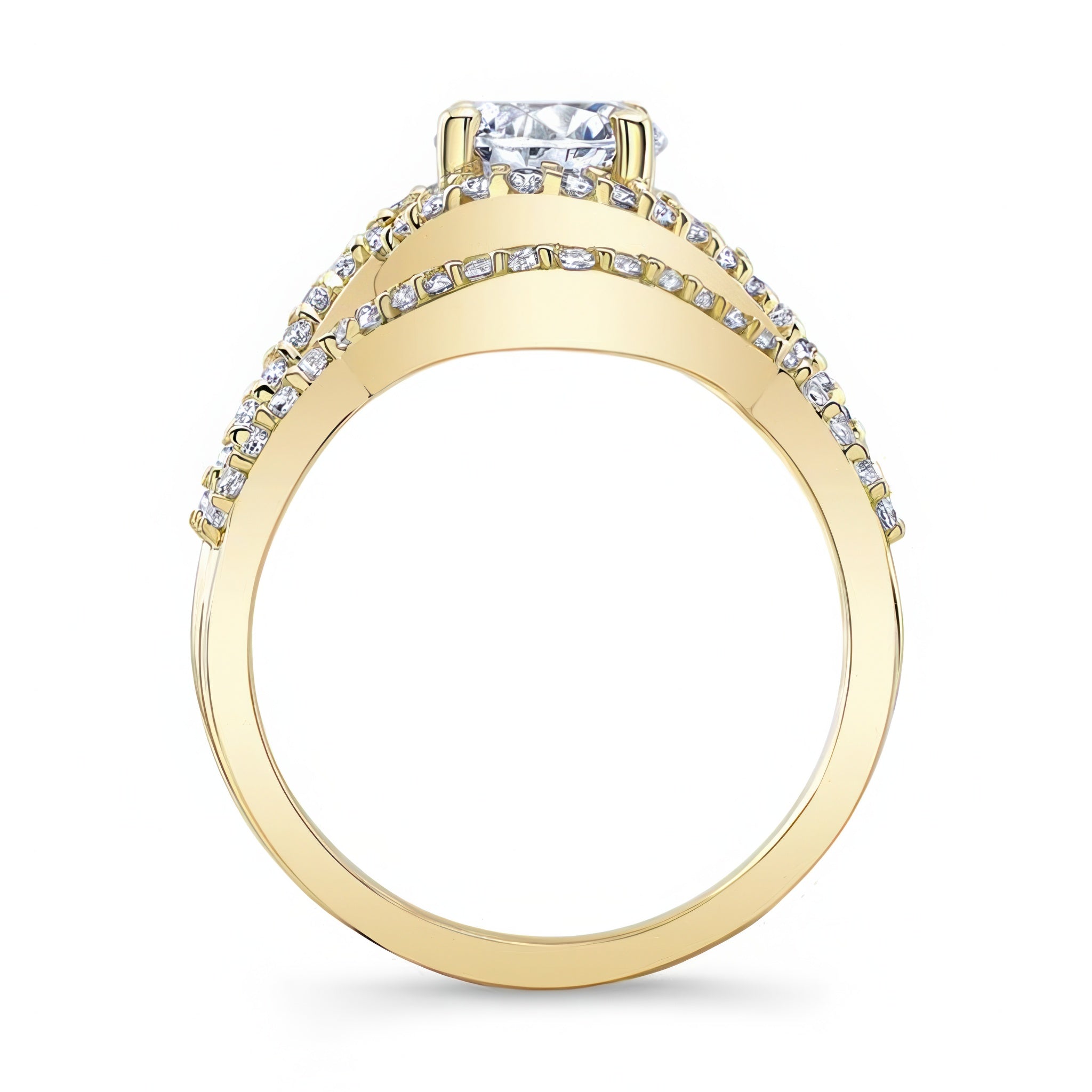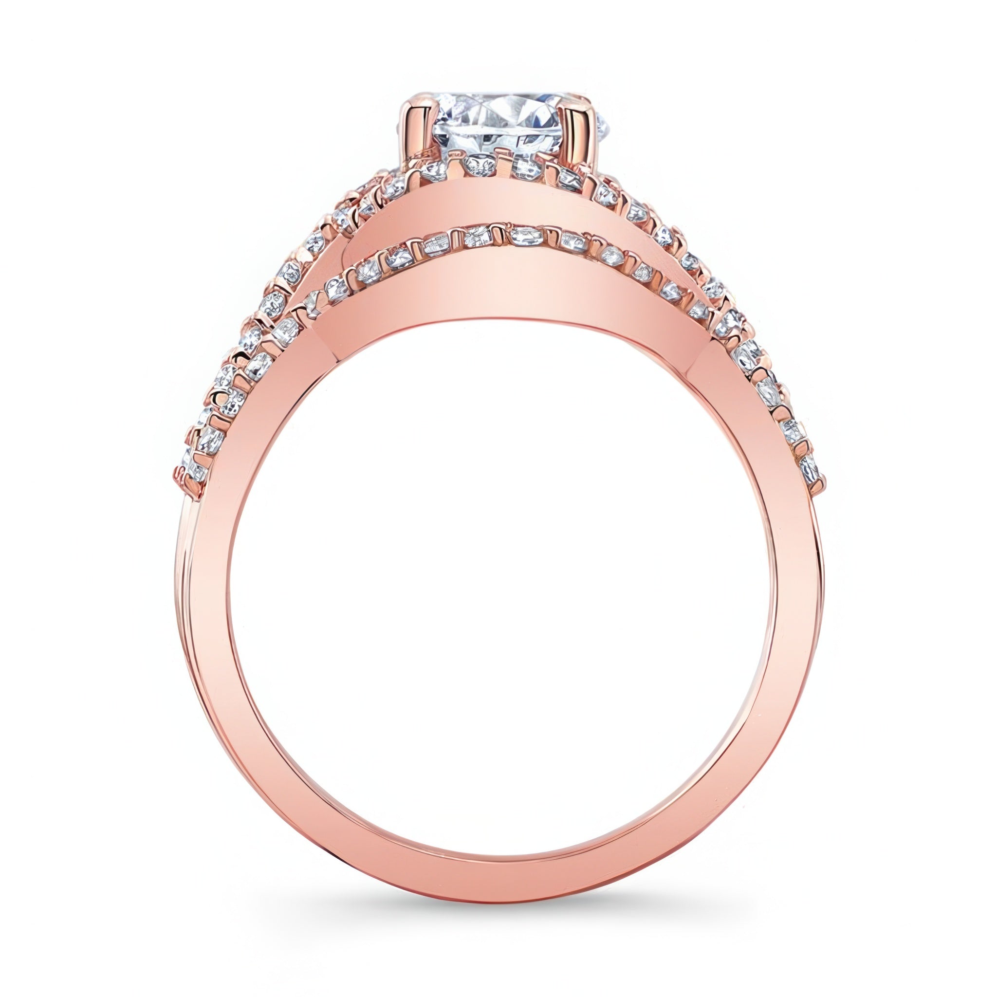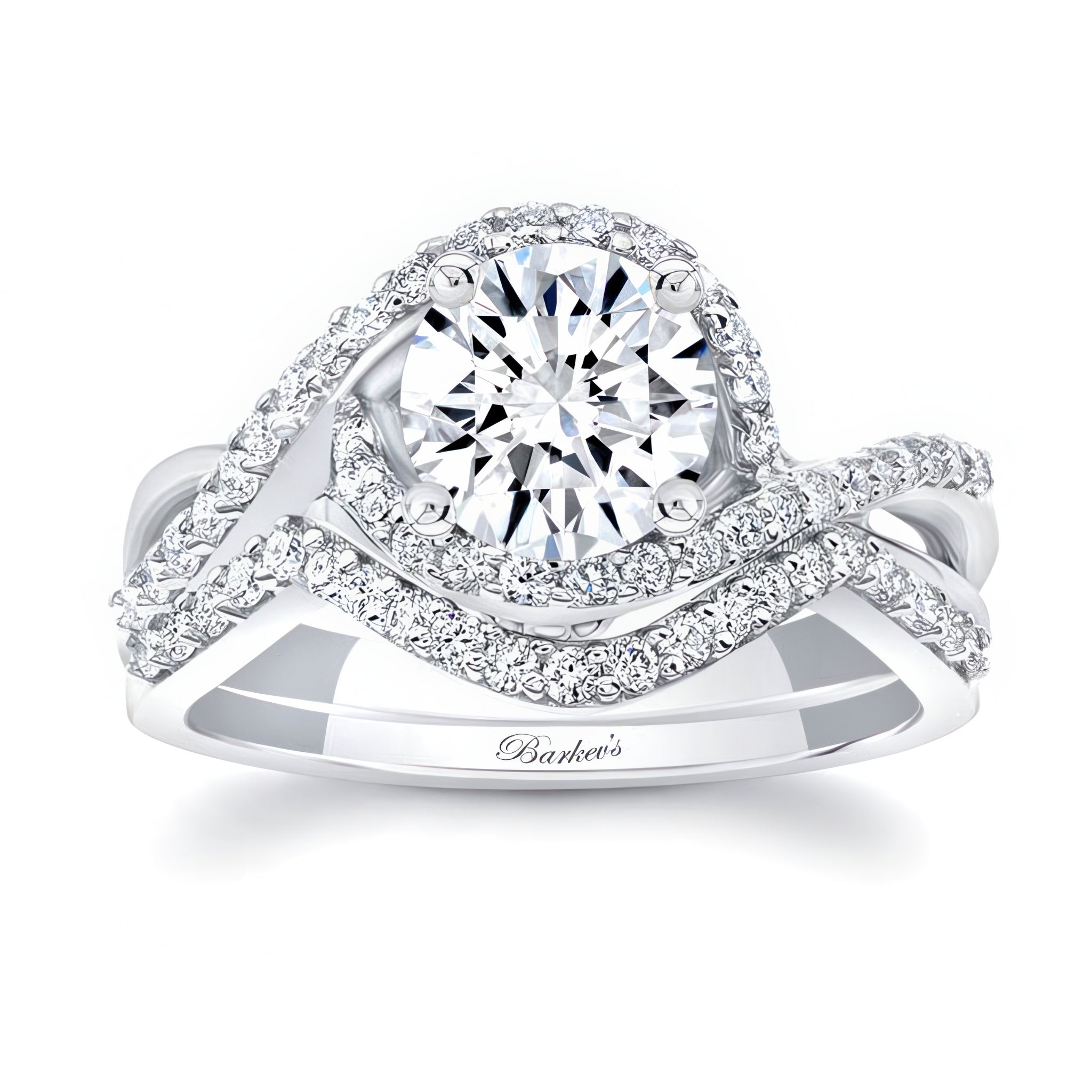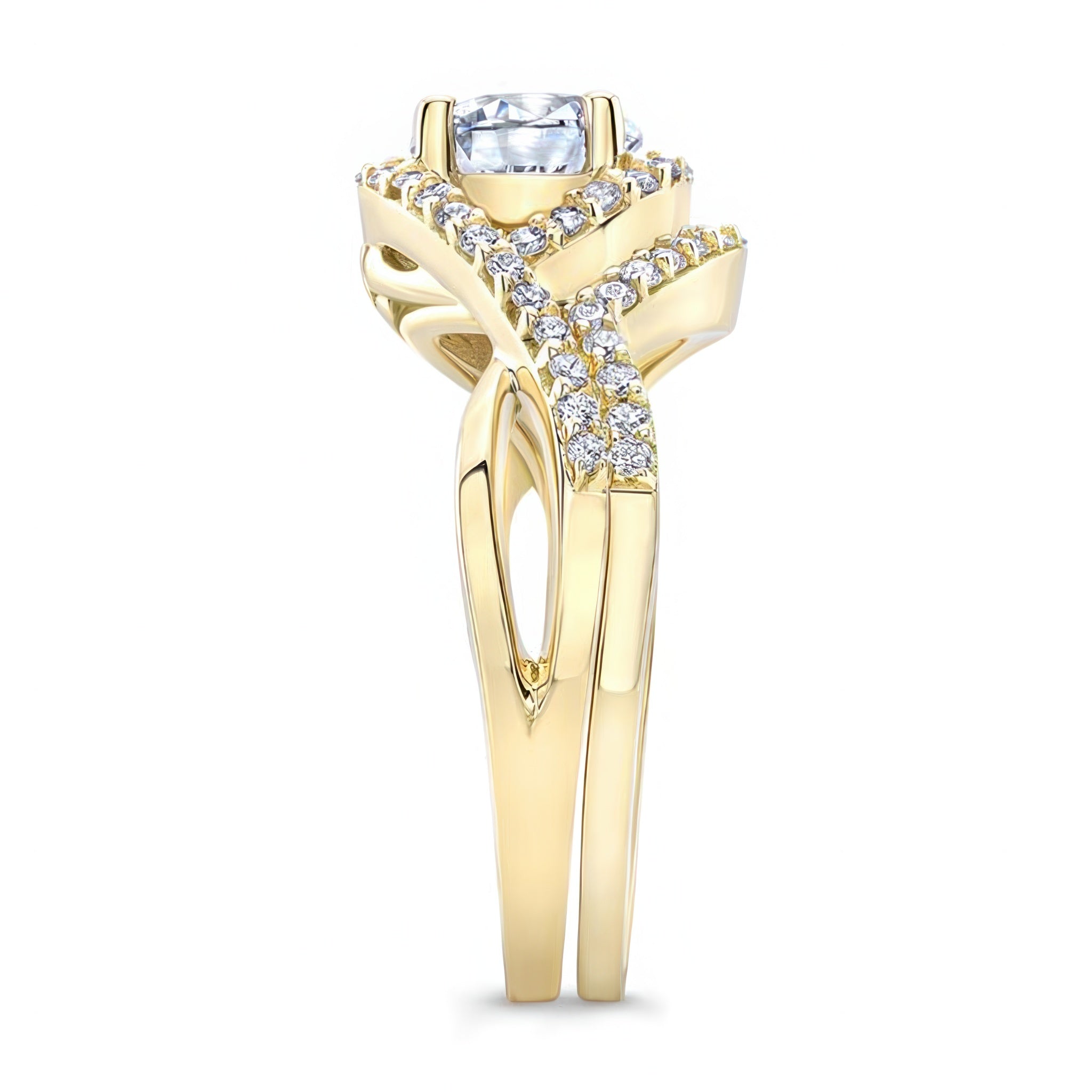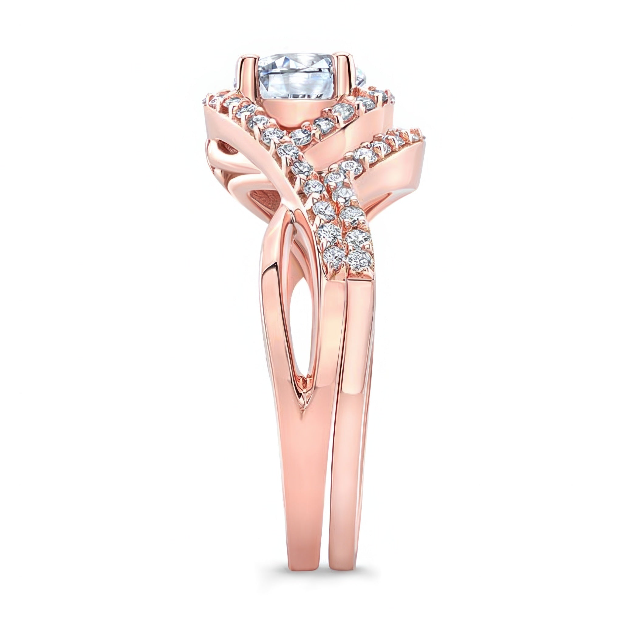 A stunning twisted halo moissanite wedding set giving off a classic nature vibe with a round center that is encircled by diamonds that flow down the entwined shoulders and reveal a simple flower pattern on the profile view. A sparkling wedding band snuggly embraces the sides with an elegant curve.