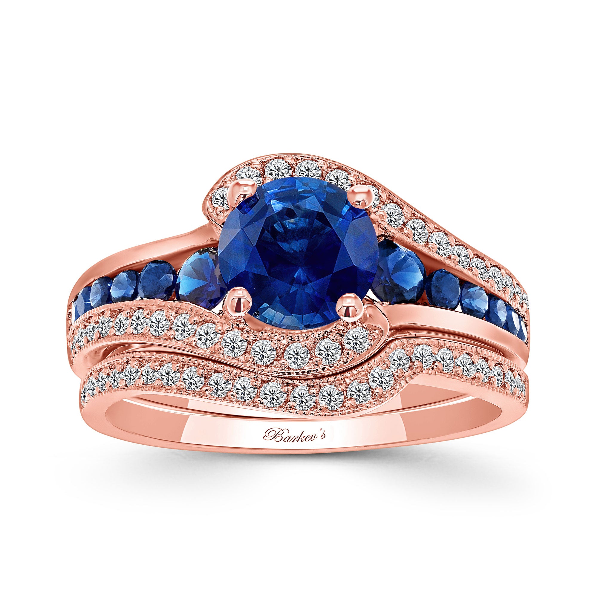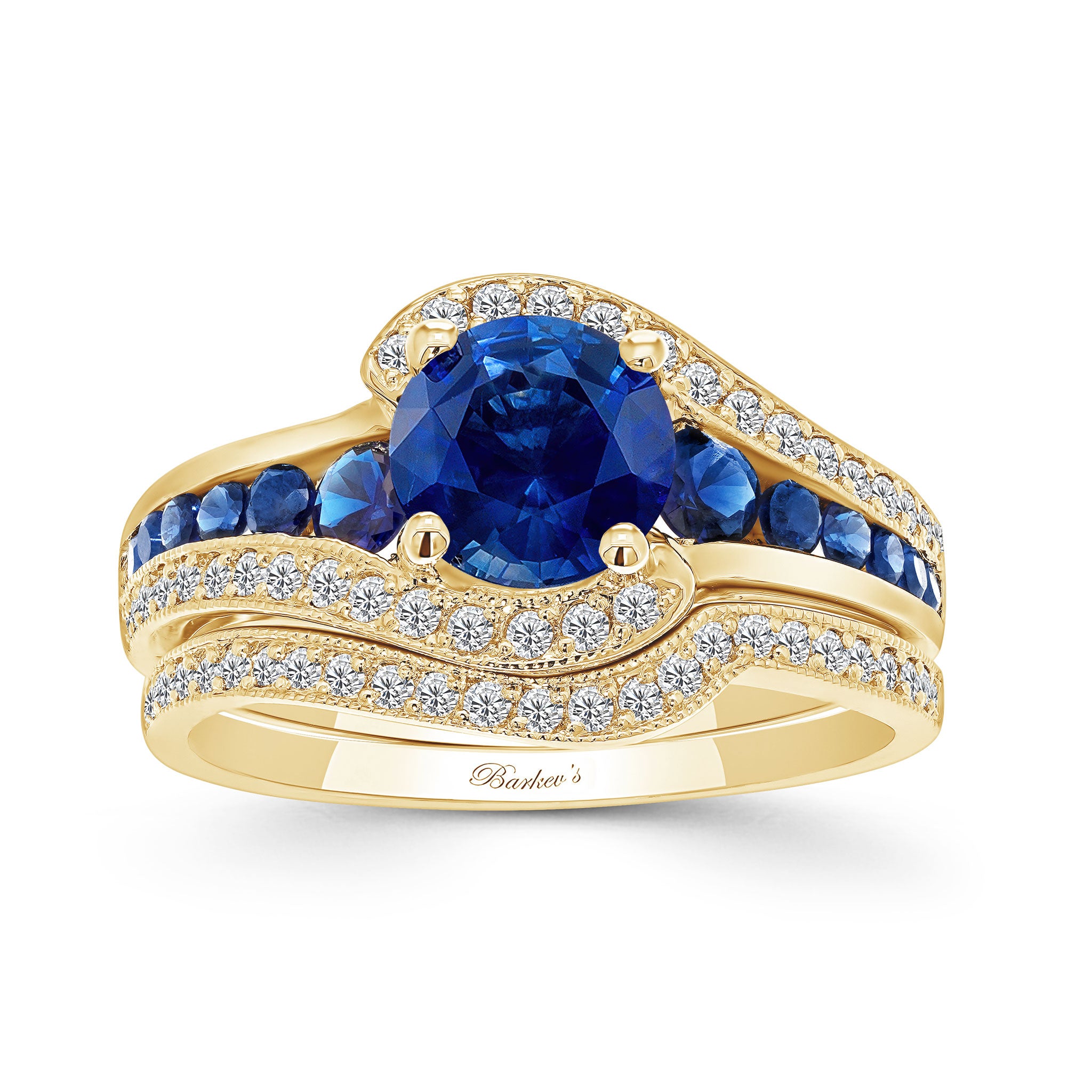 This unique sapphire bridal set features a prong set round blue sapphire center. The shoulders split and curve up to the center with pave set diamonds, while channel set blue sapphires grace the sides. Comes with a matching wedding band.