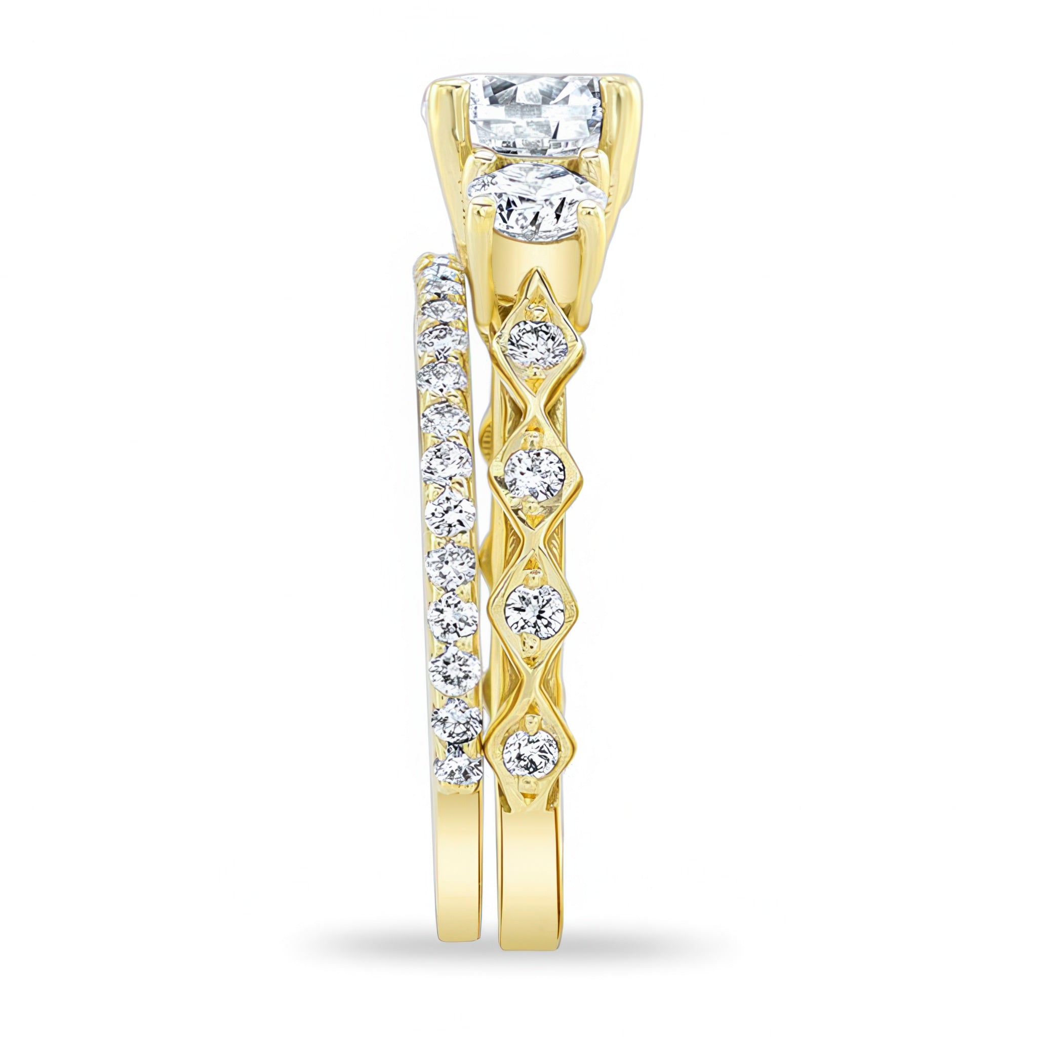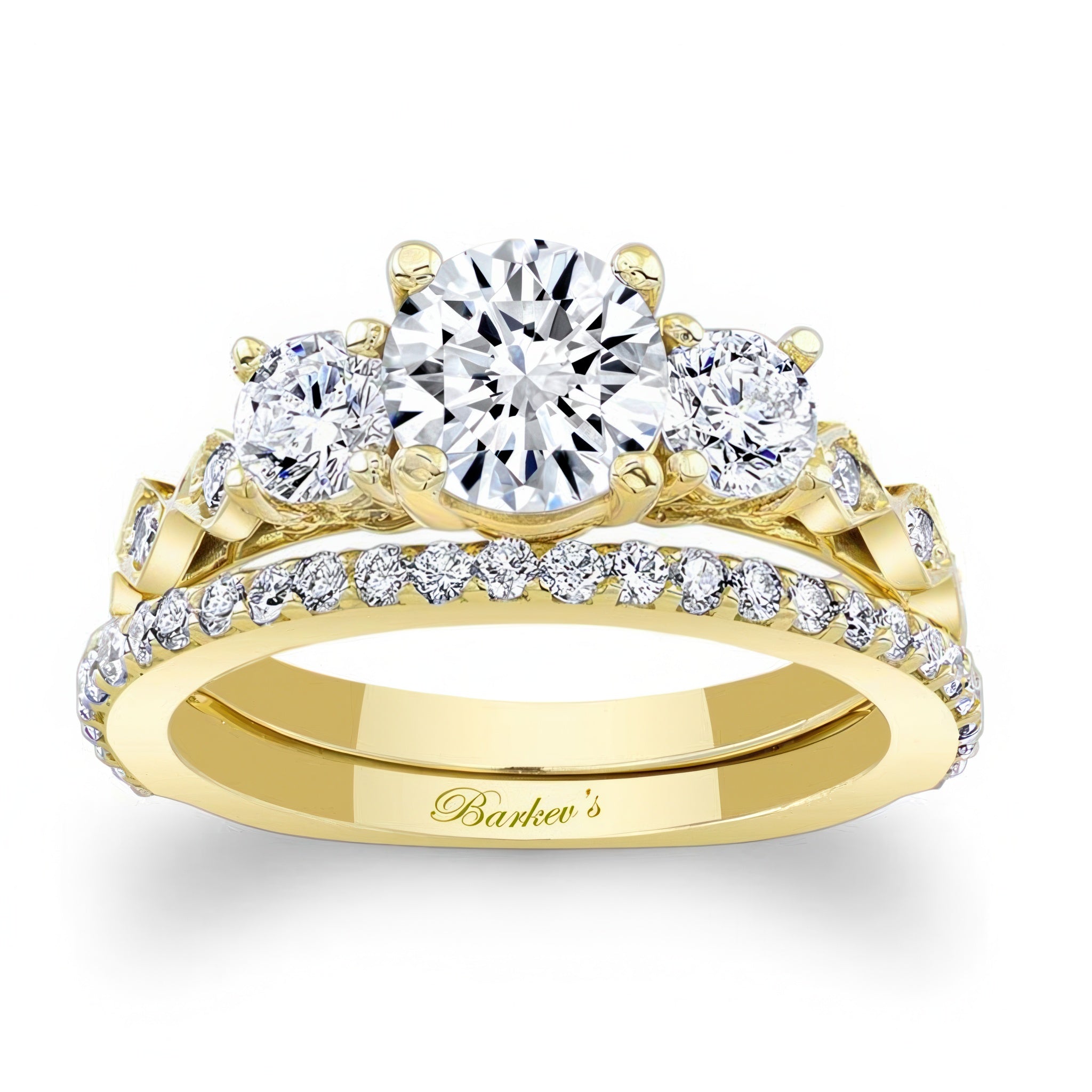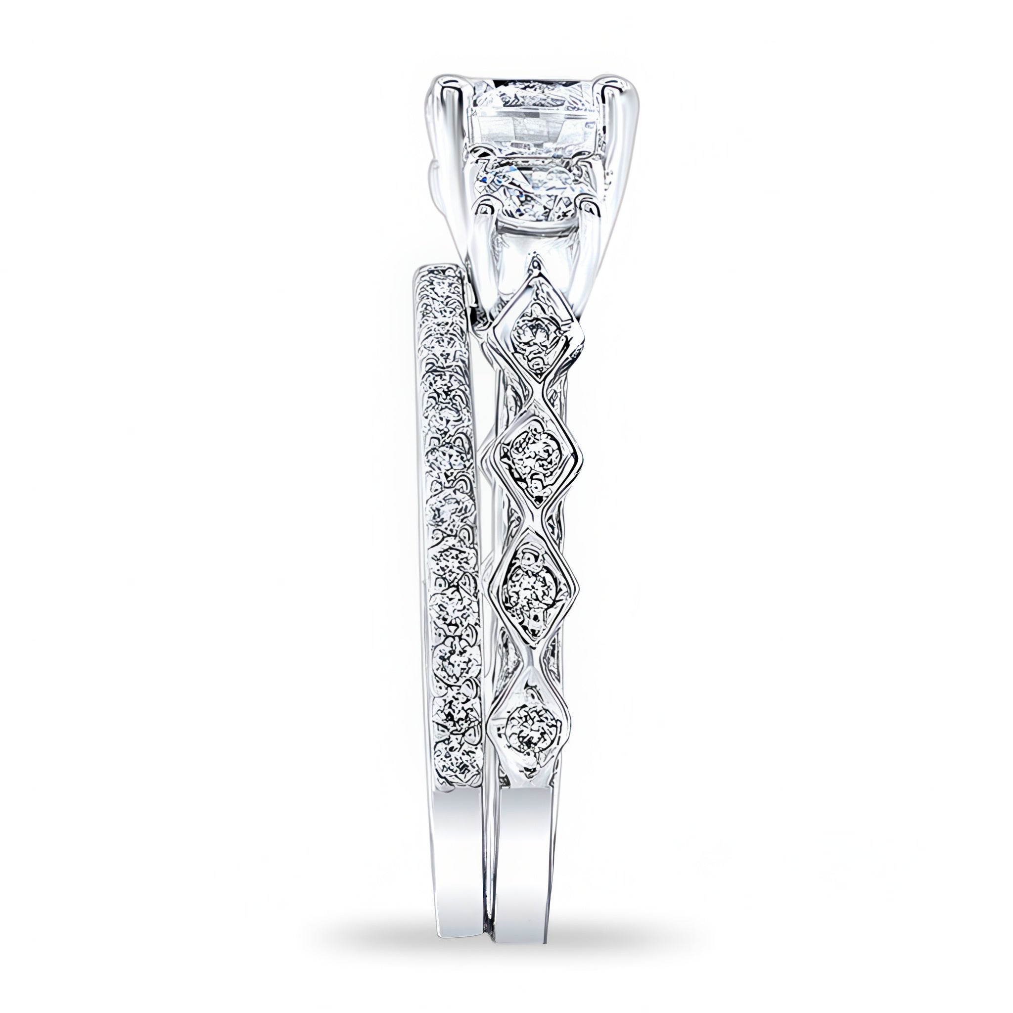 This vintage 3 stone moissanite ring set features a cathedral shank and three prong set round stones across the center with prong set diamonds embellishing the shank and wedding band.