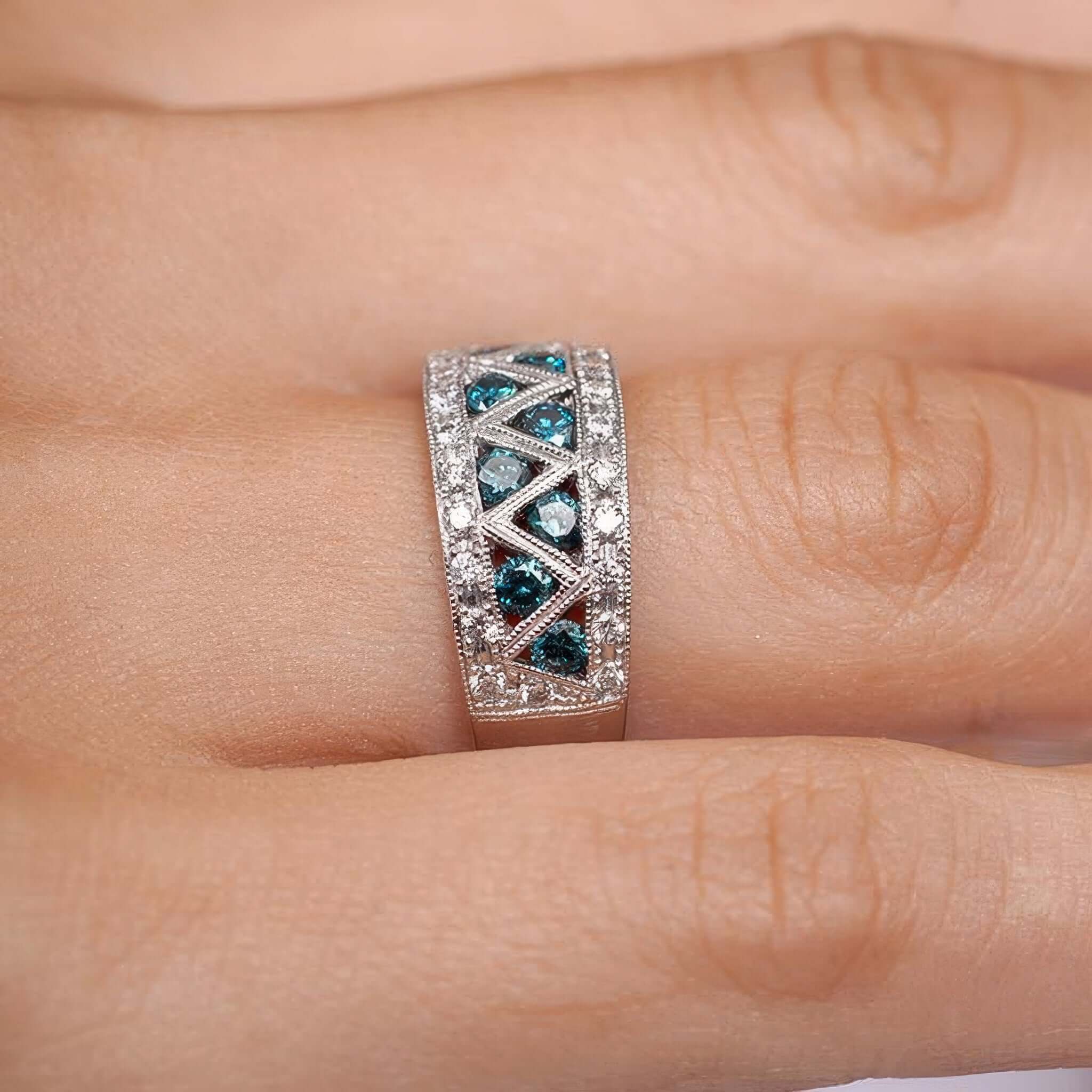 This unique blue and white diamond wedding band features a center row of channel set blue diamonds artfully encased in a zigzag pattern with pave set diamonds framing the sides and a milgrain finish.