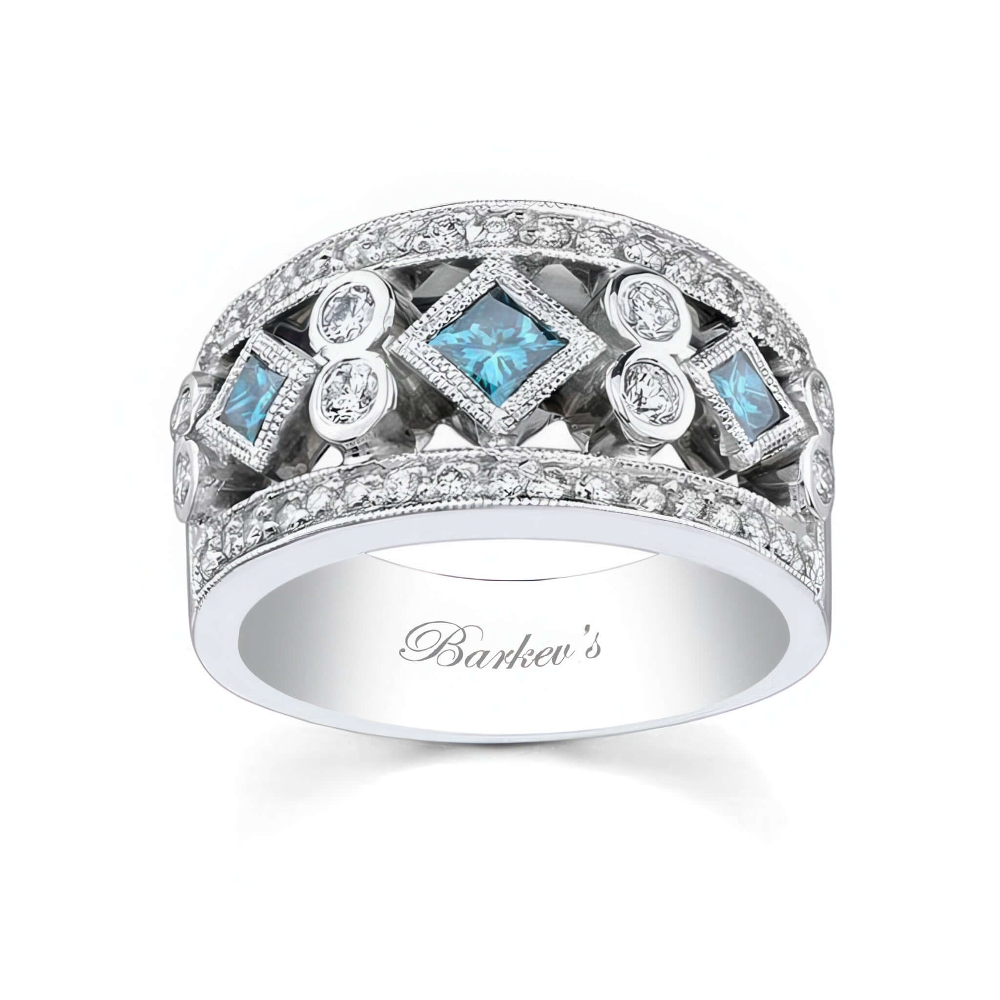 This stunning blue diamond wedding band features 3 bezel set princess cut blue diamonds with round diamonds bezel set in between and pave set diamonds adorning the edges along with a milgrain finish for a truly vintage look.