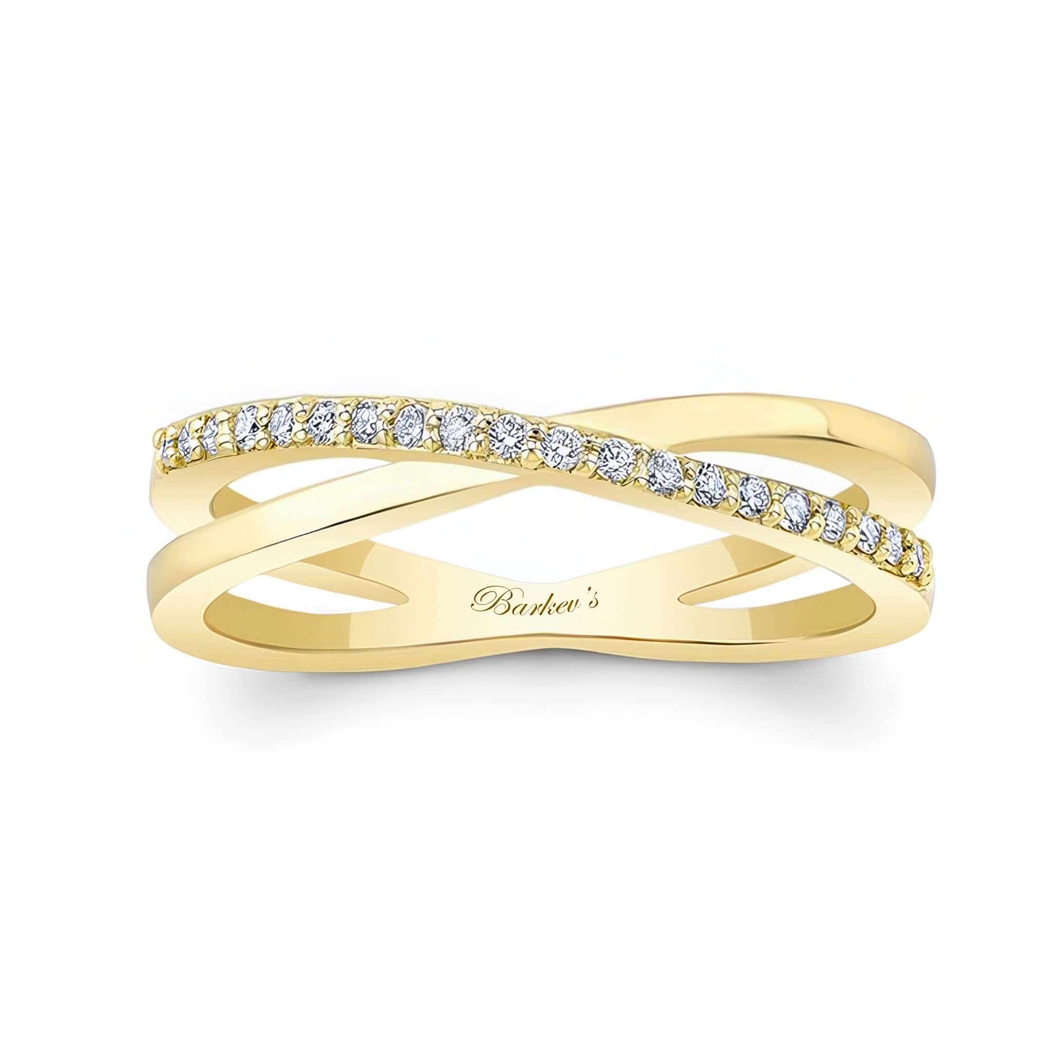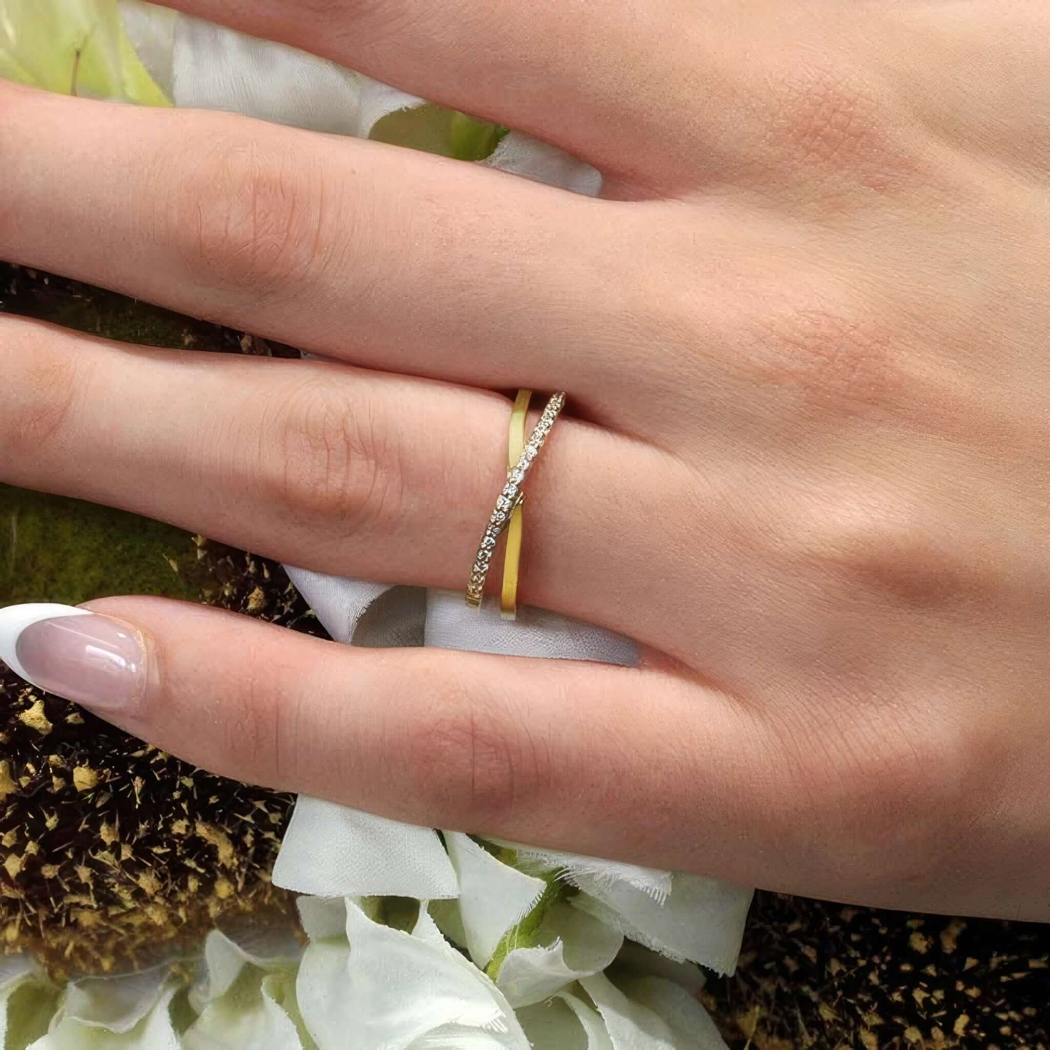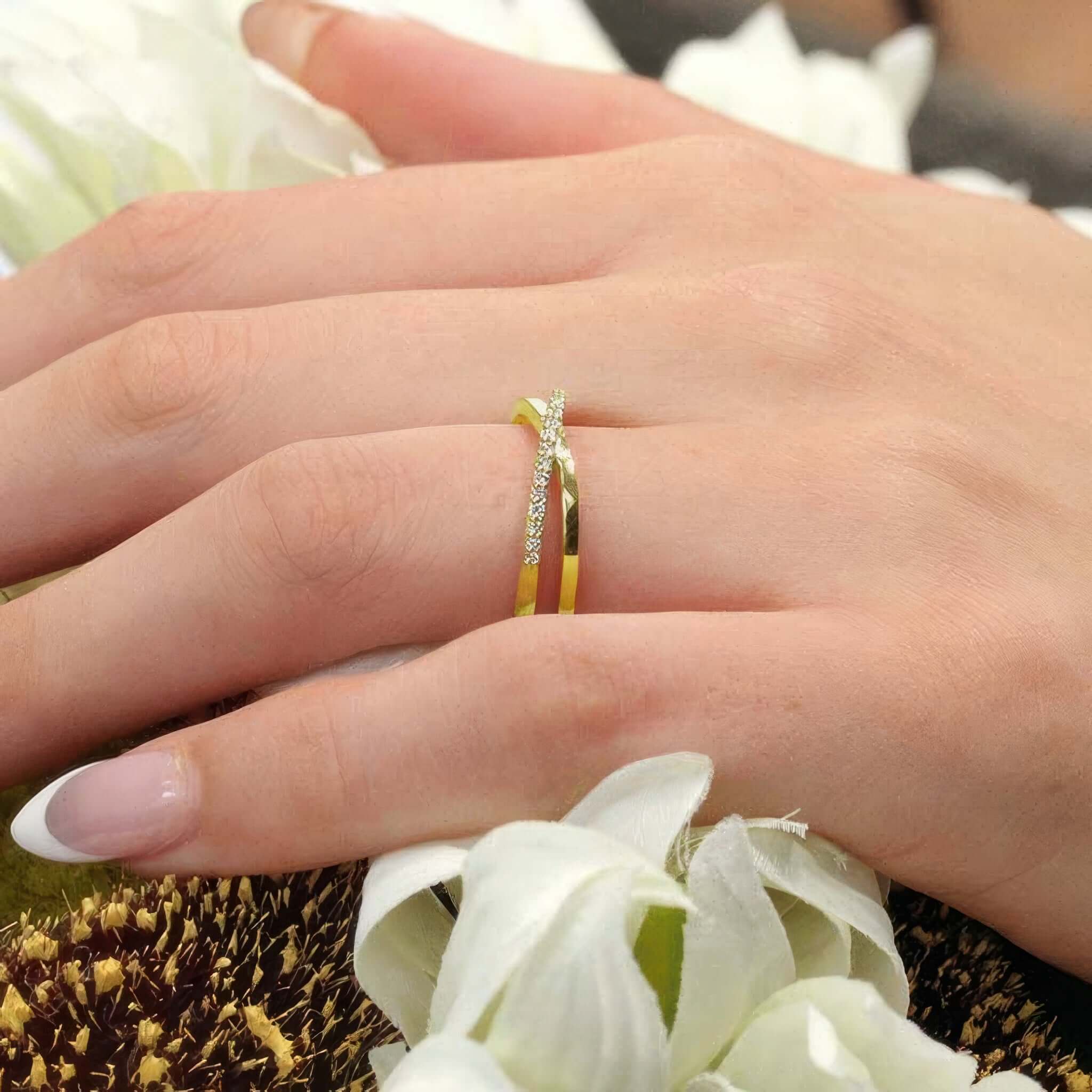 A beautiful overlap diamond promise ring featuring shared prong set diamonds sitting on an overlapping gold band.
