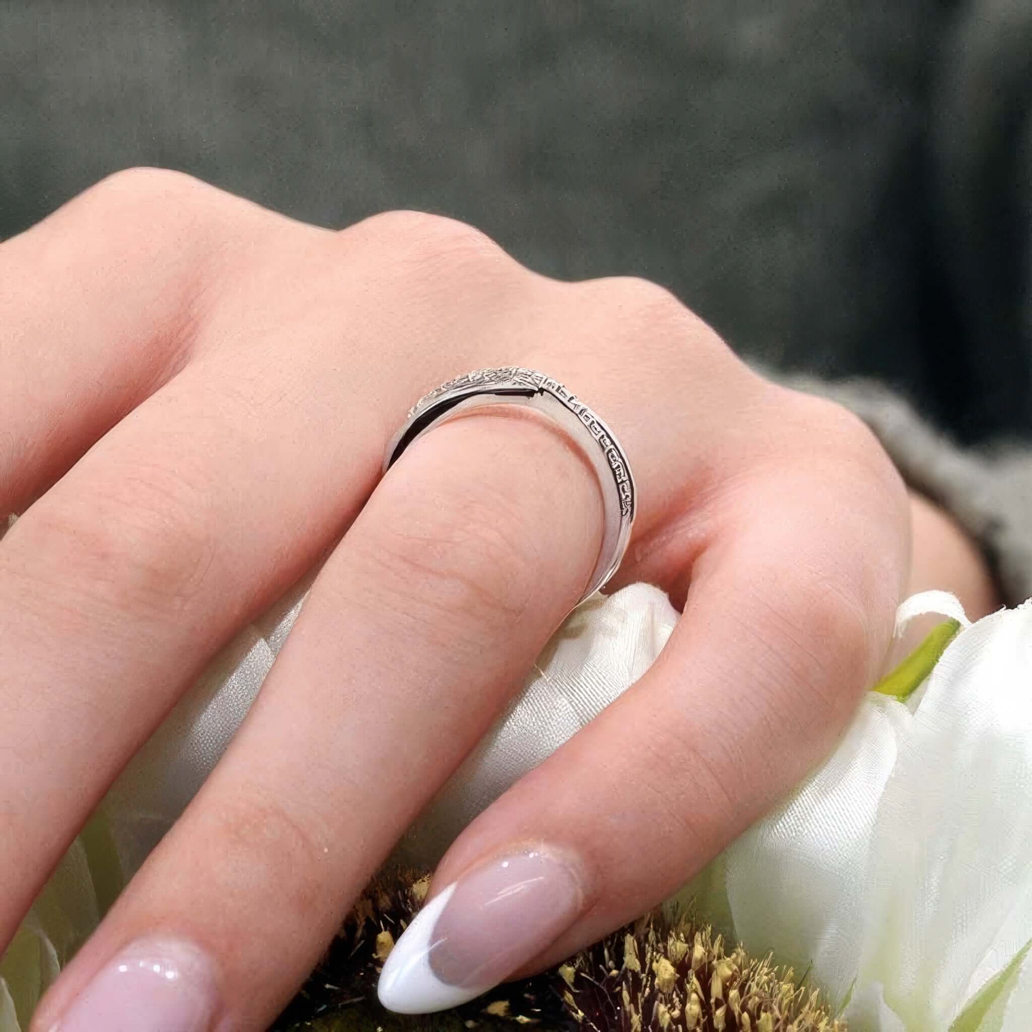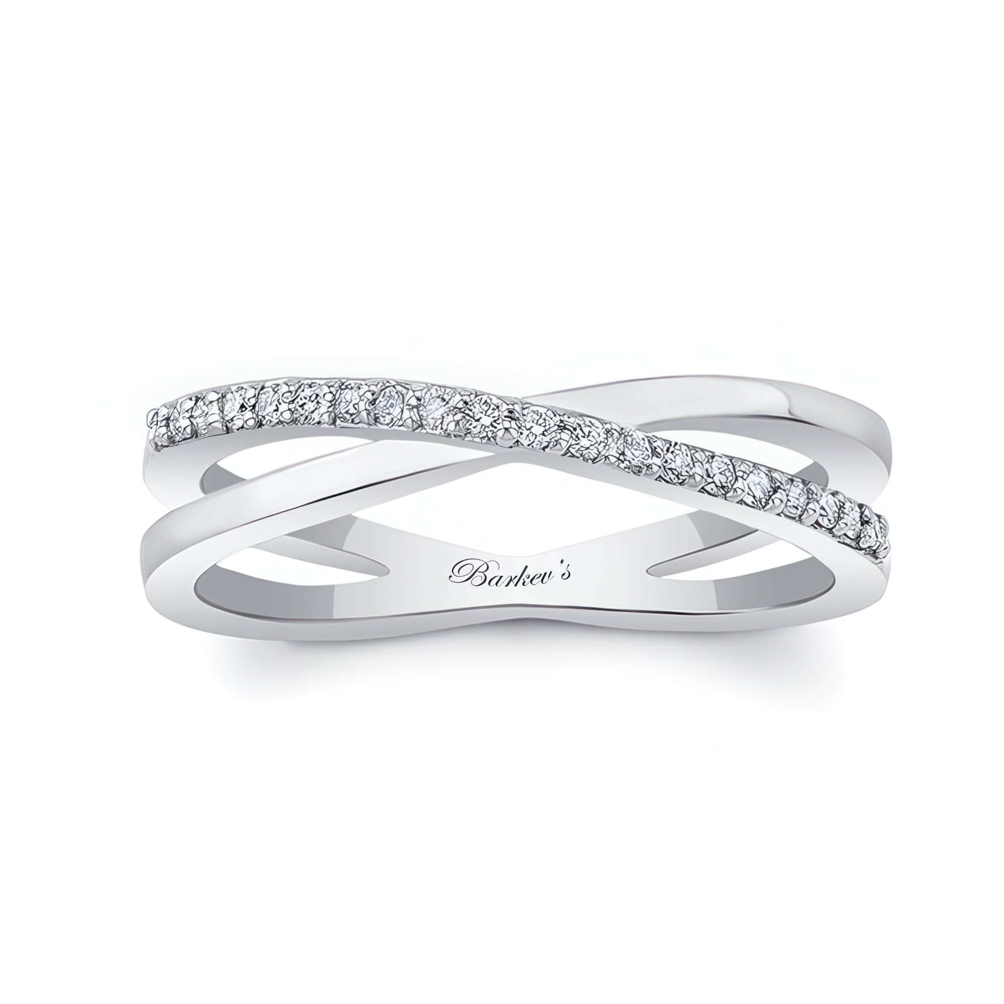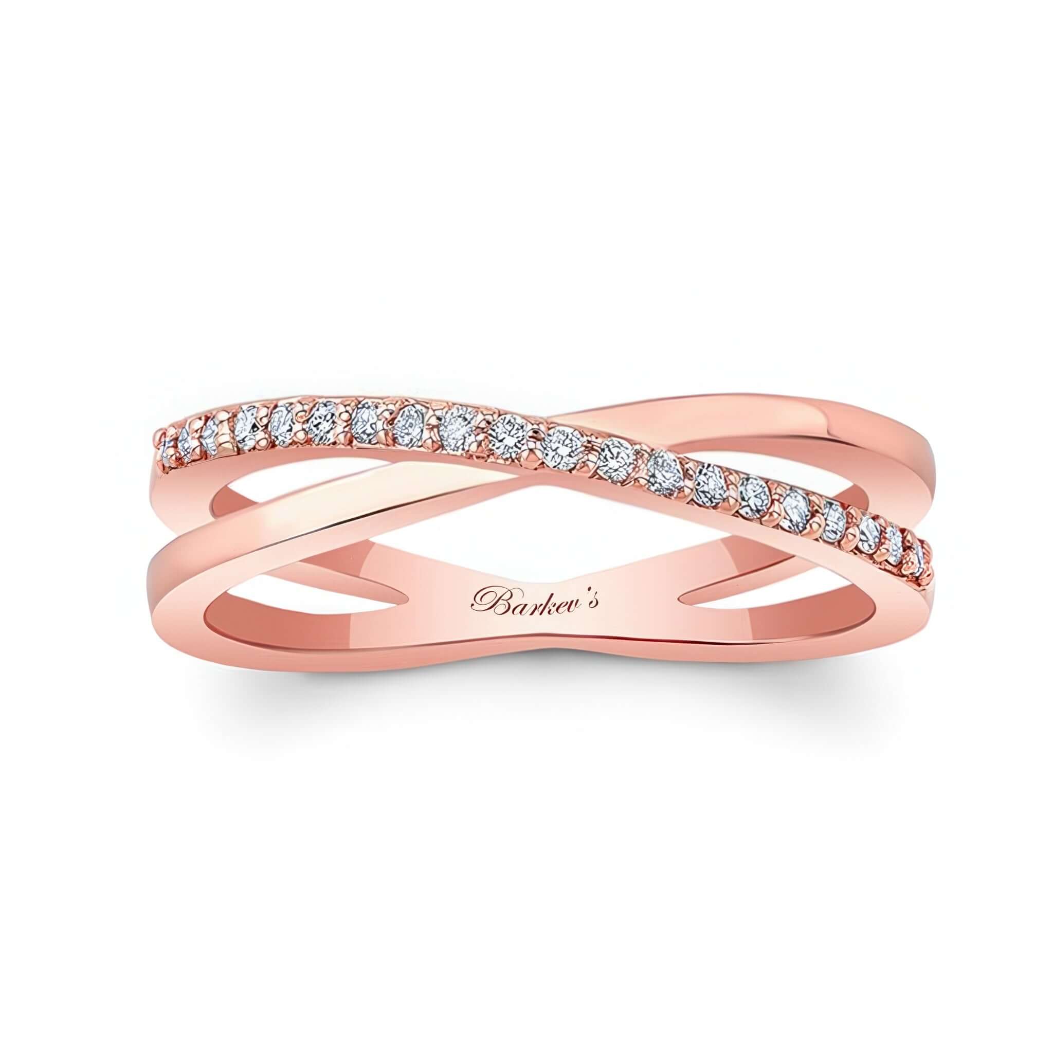 A beautiful overlap diamond promise ring featuring shared prong set diamonds sitting on an overlapping gold band.