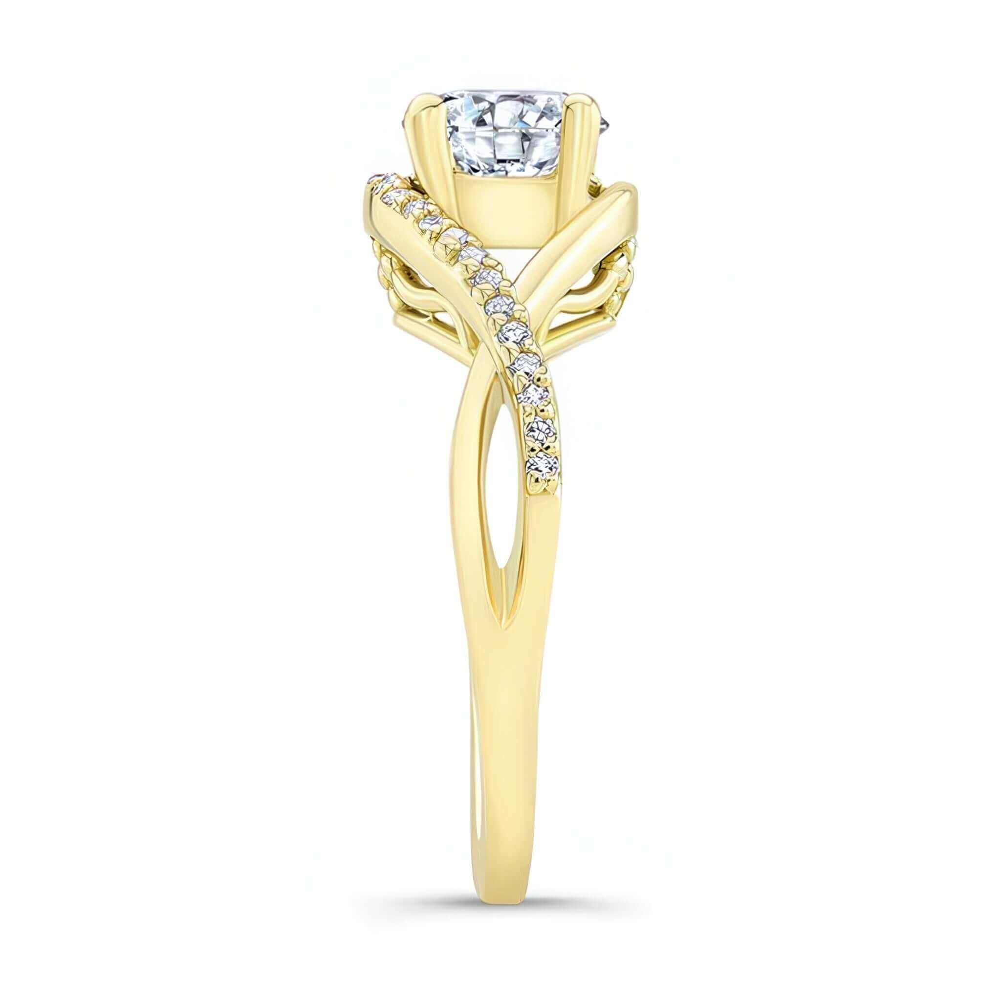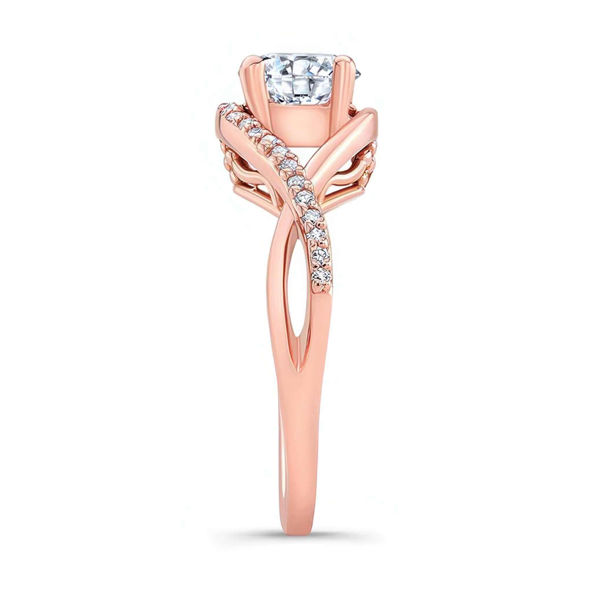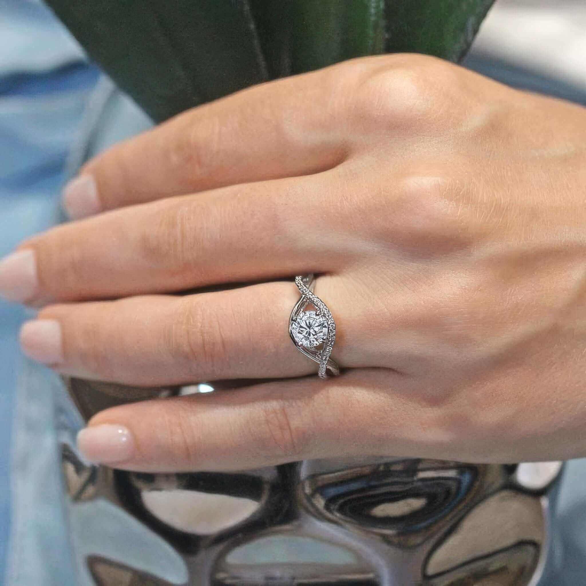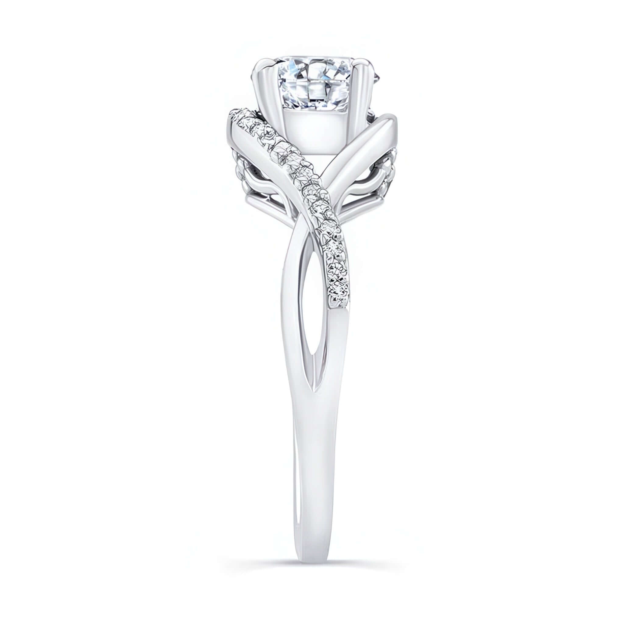 A beautiful criss cross ring featuring a curving shank, shared prong set diamond melees and a round center stone