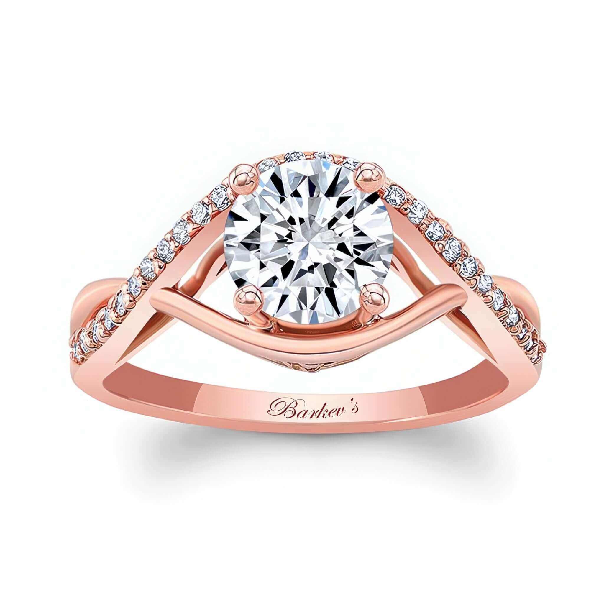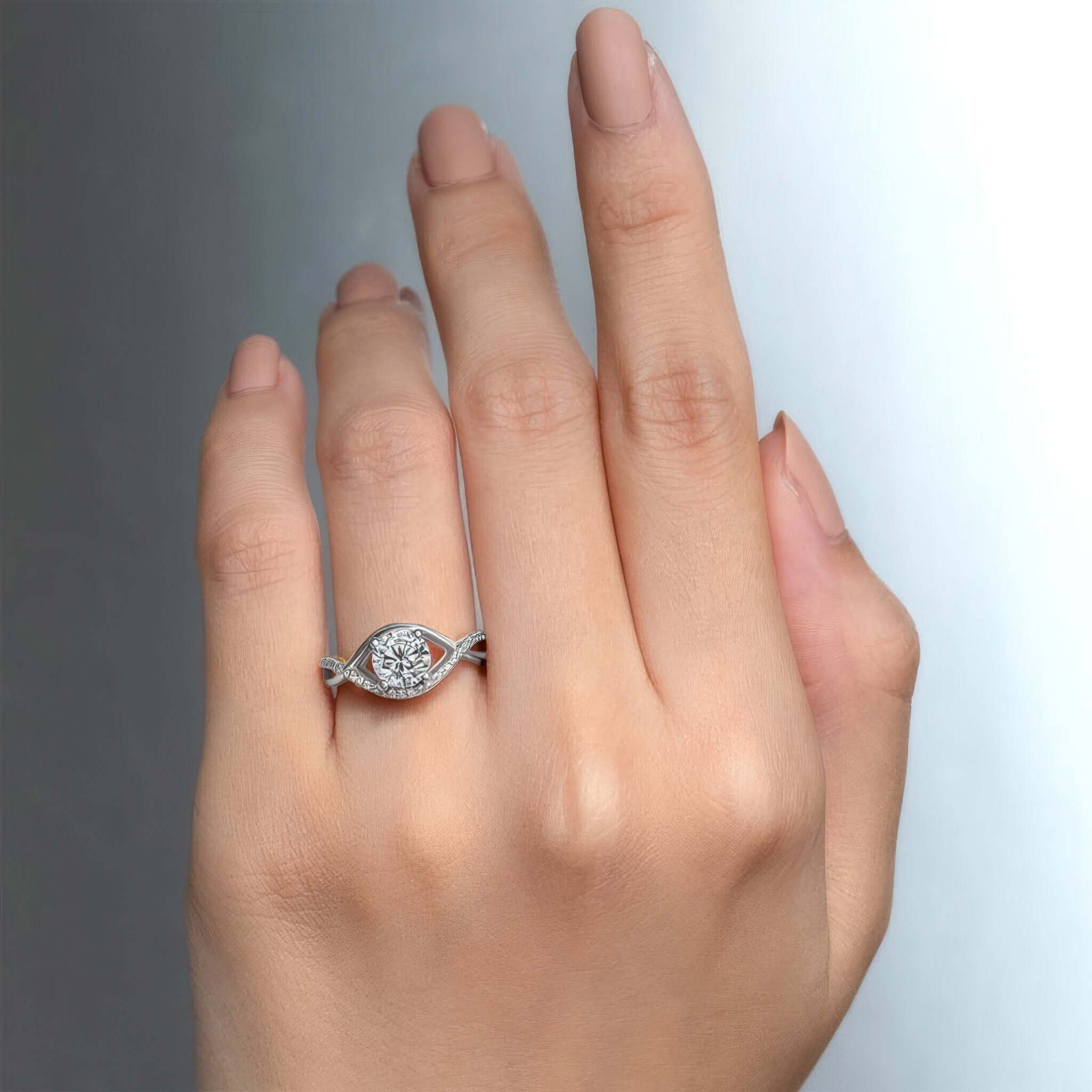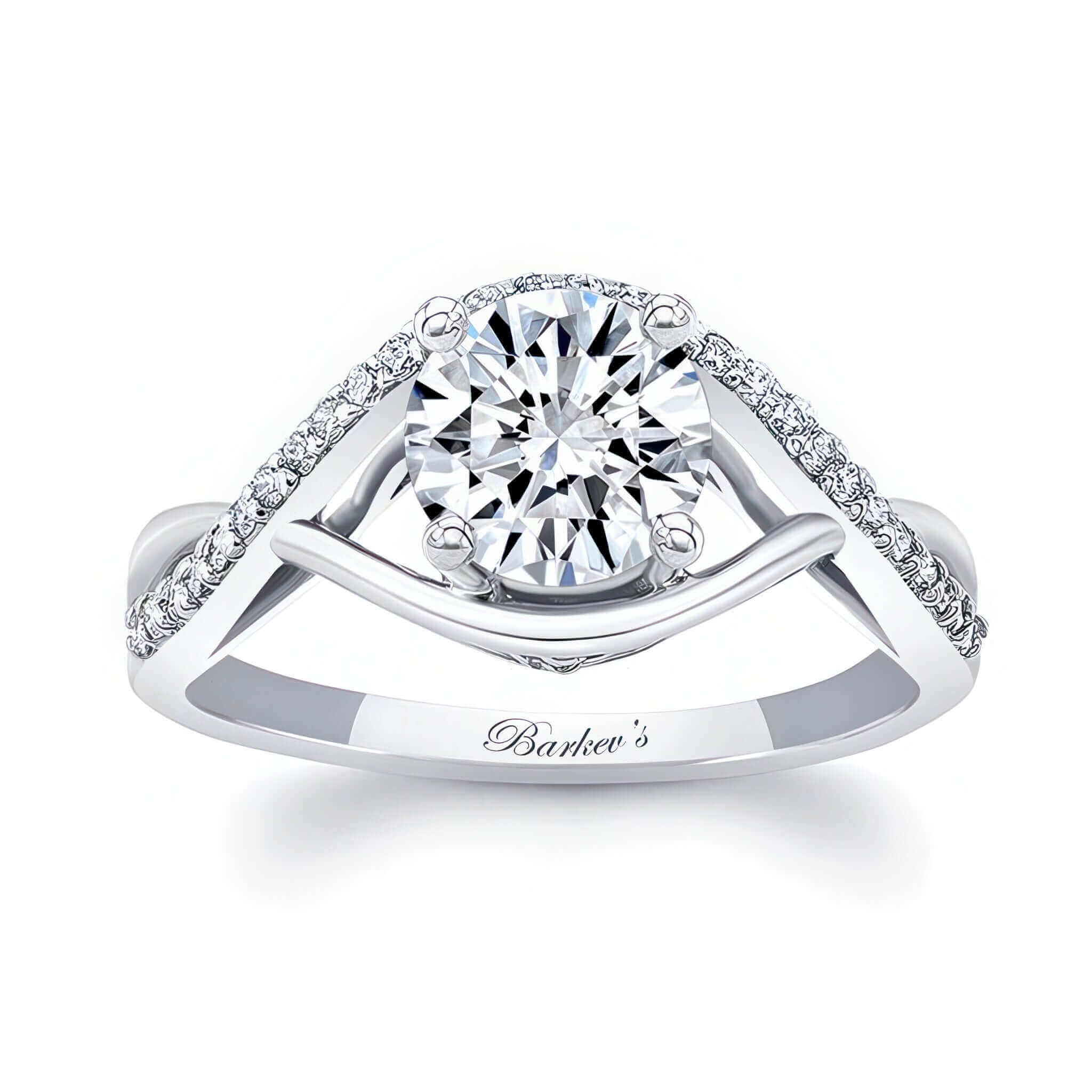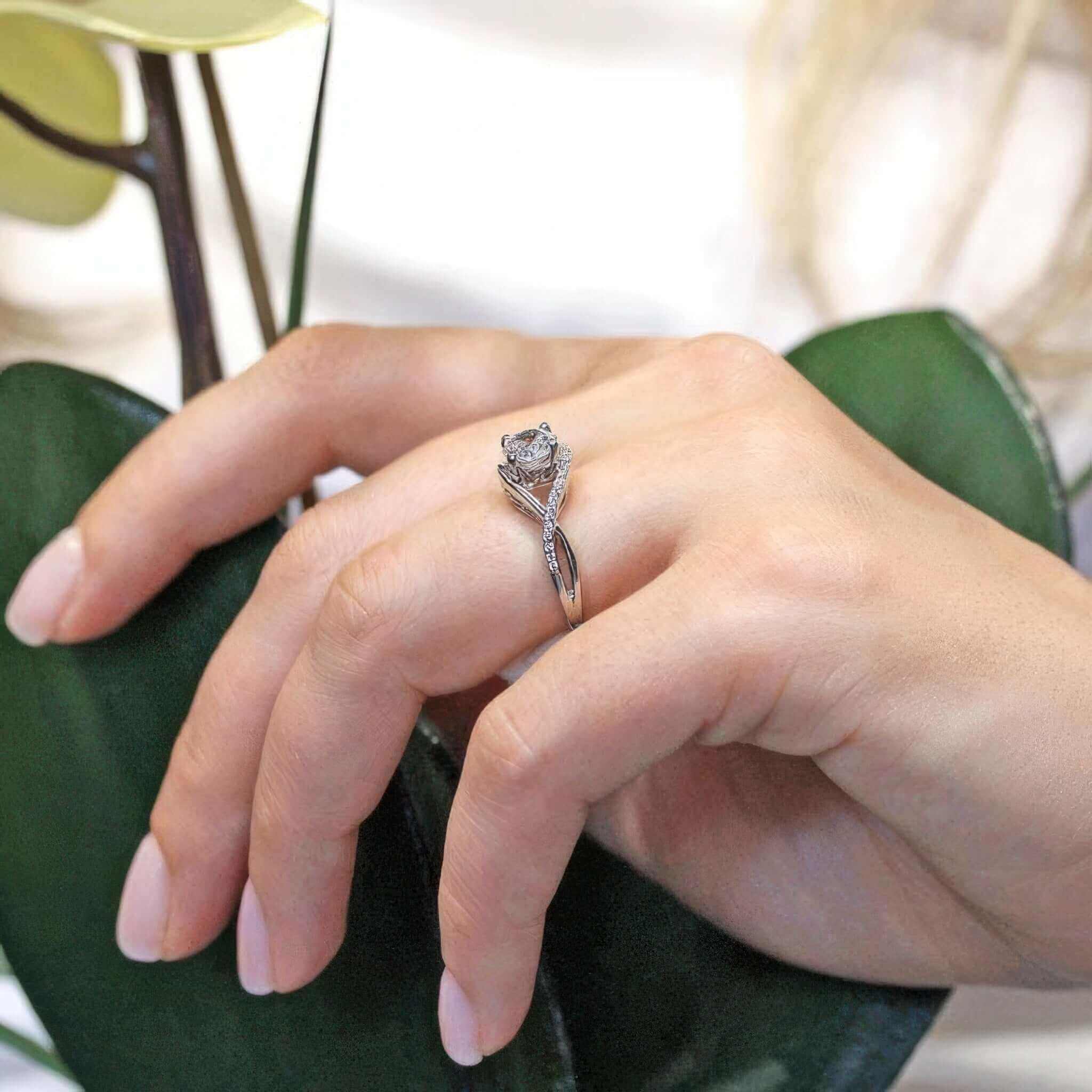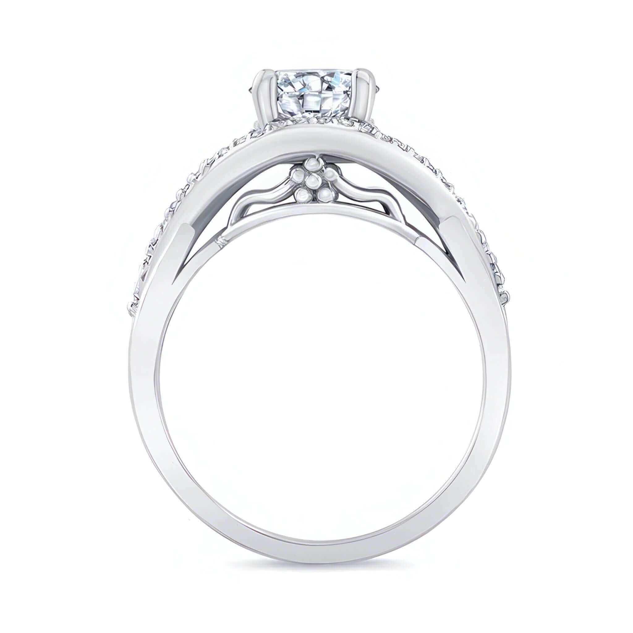 A beautiful criss cross ring featuring a curving shank, shared prong set diamond melees and a round center stone