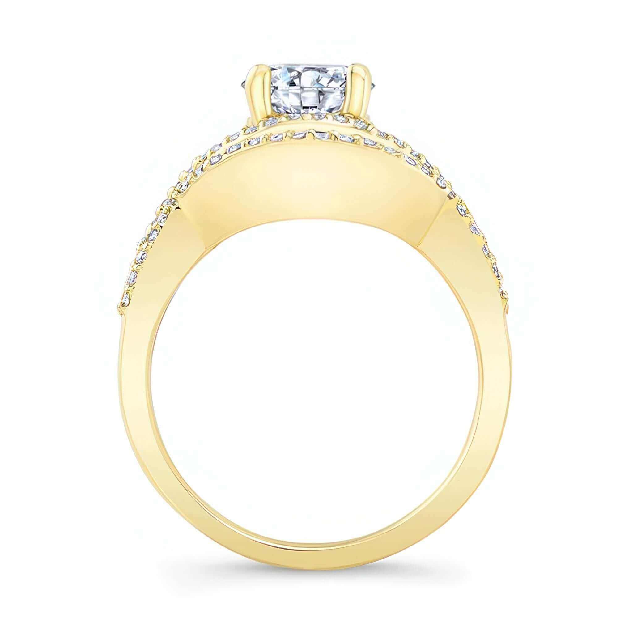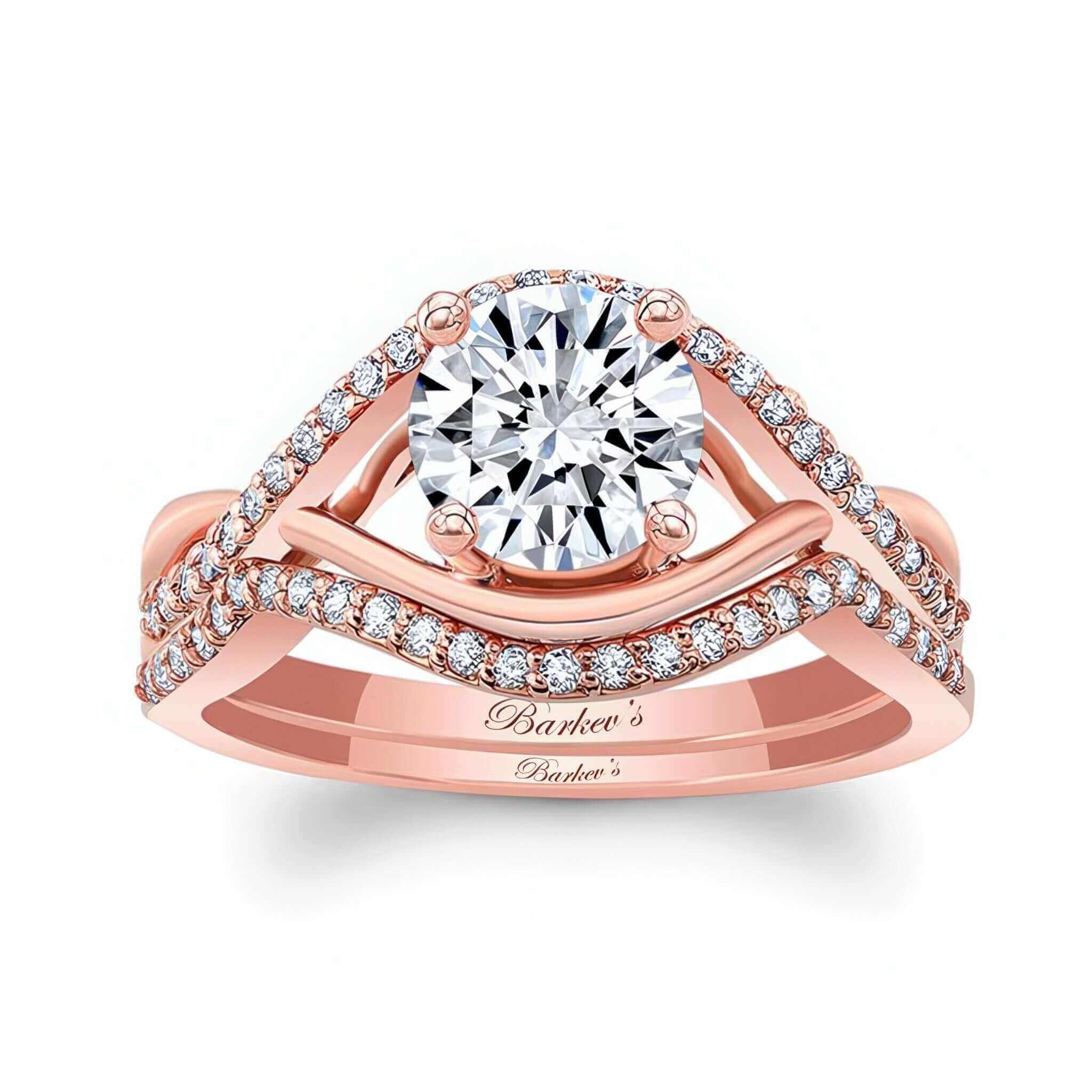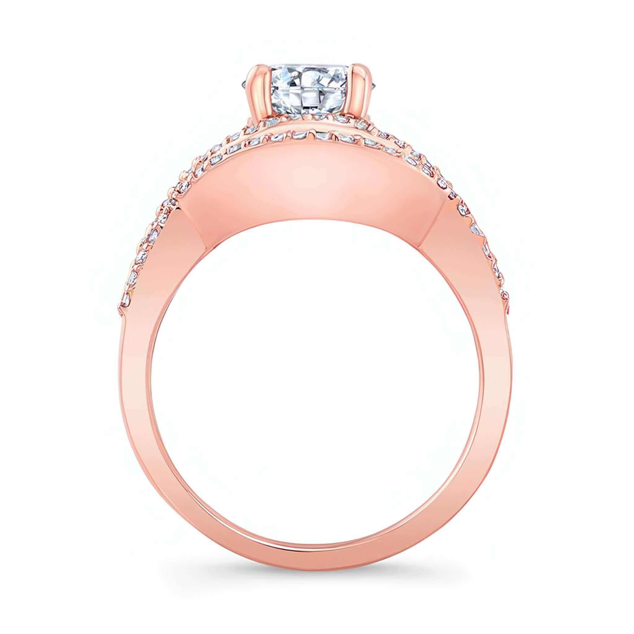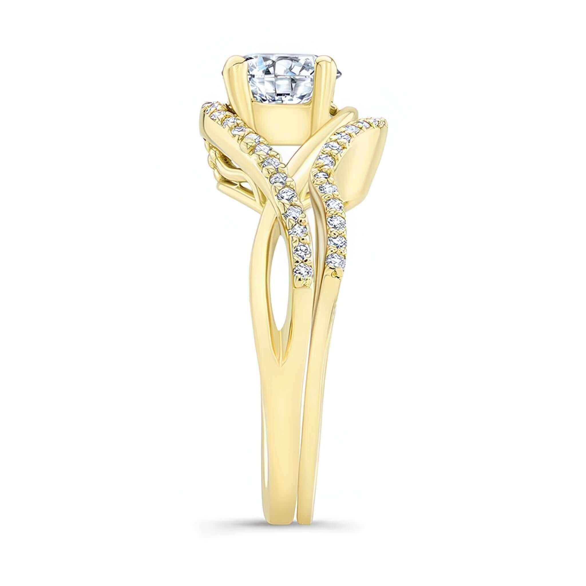 A beautiful criss cross ring set featuring a curving shank, shared prong set diamond melees and a round center stone. Also comes with a wedding band.