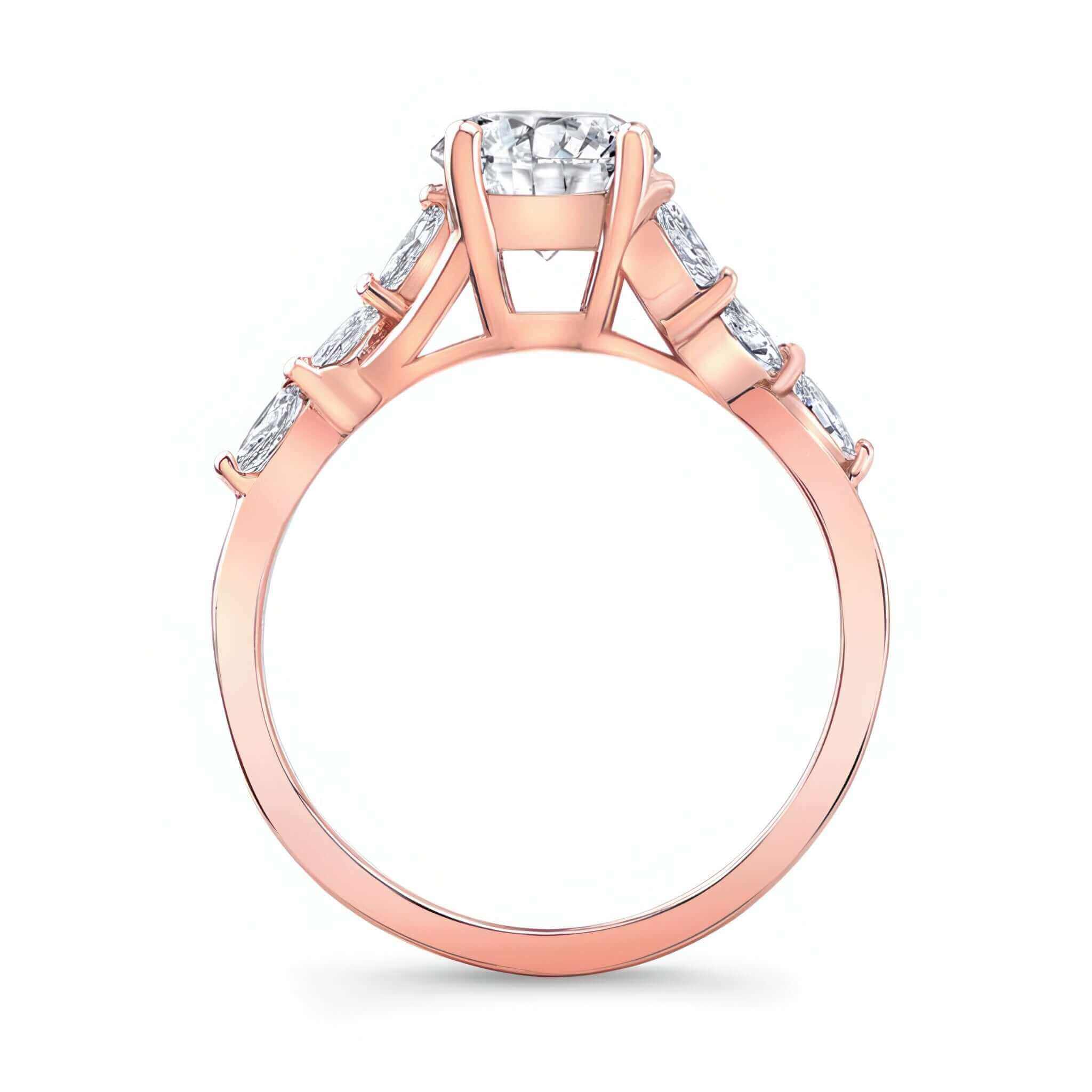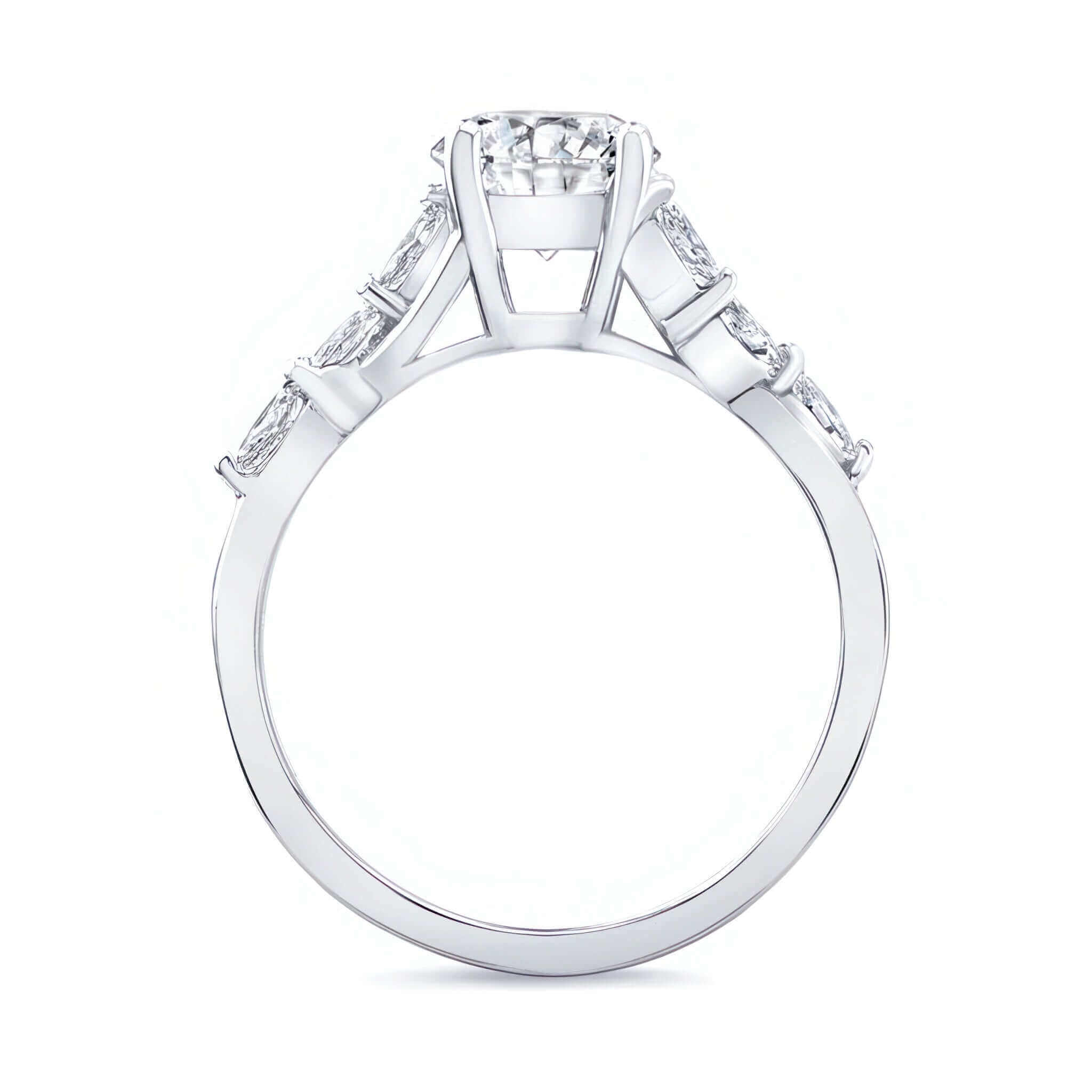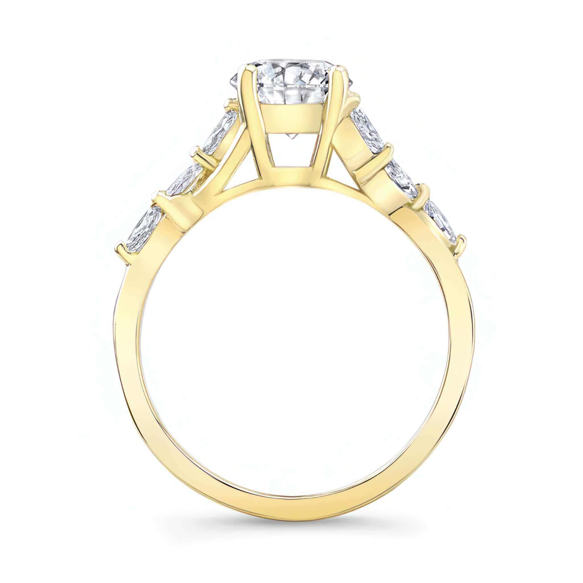 This marquise accent ring gives off a classic vibe. The design is adorned by a round center snugly embraced by an elegant curve with three diamonds on each side.