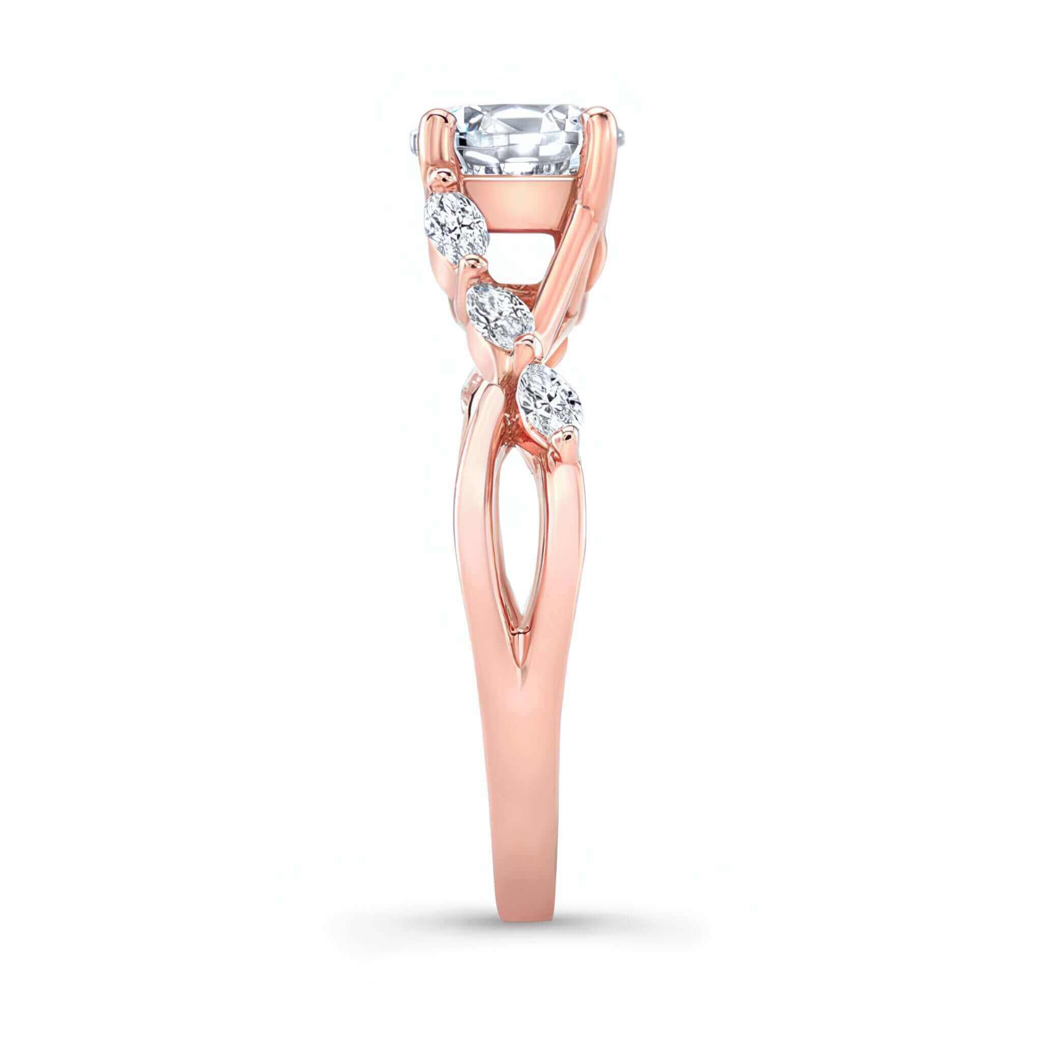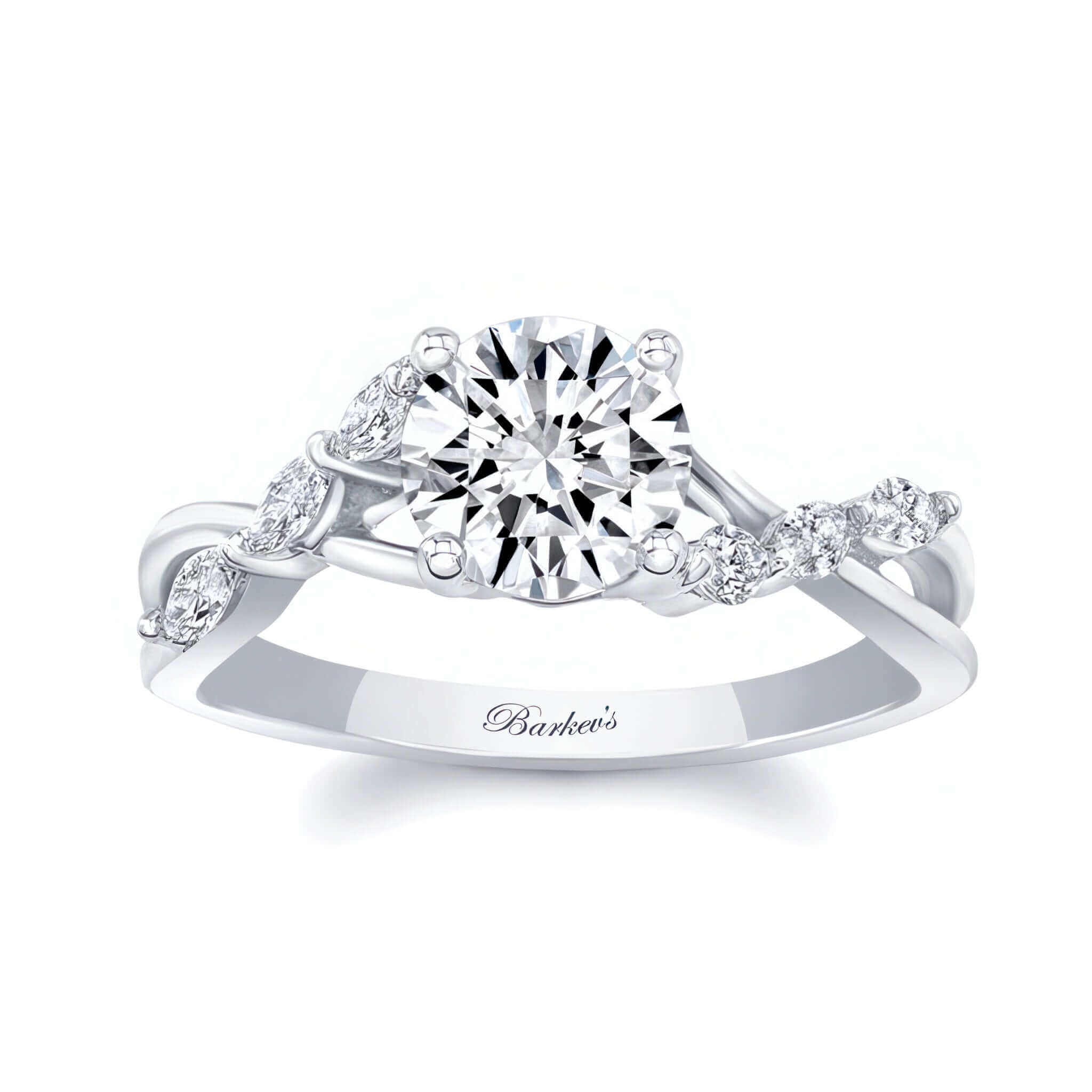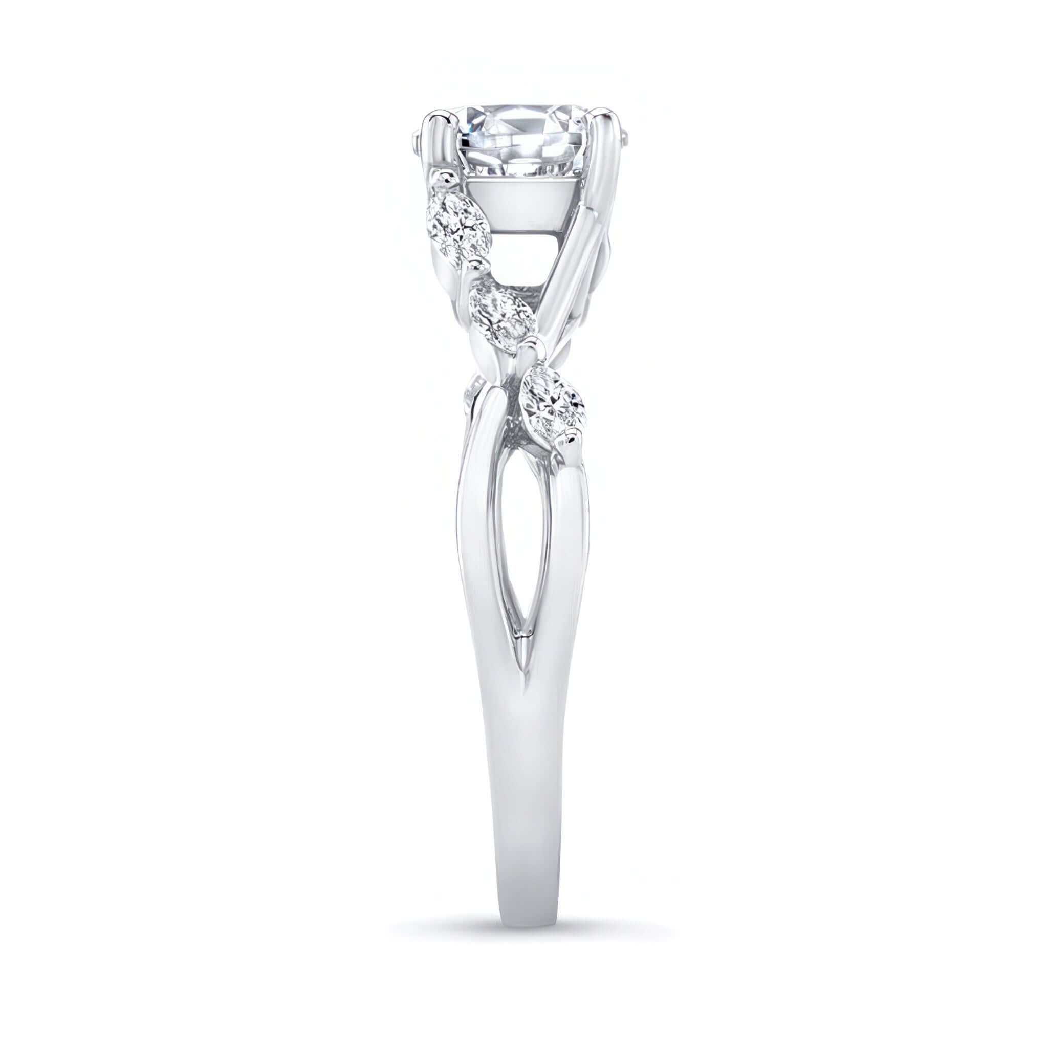 This marquise accent ring gives off a classic vibe. The design is adorned by a round center snugly embraced by an elegant curve with three diamonds on each side.