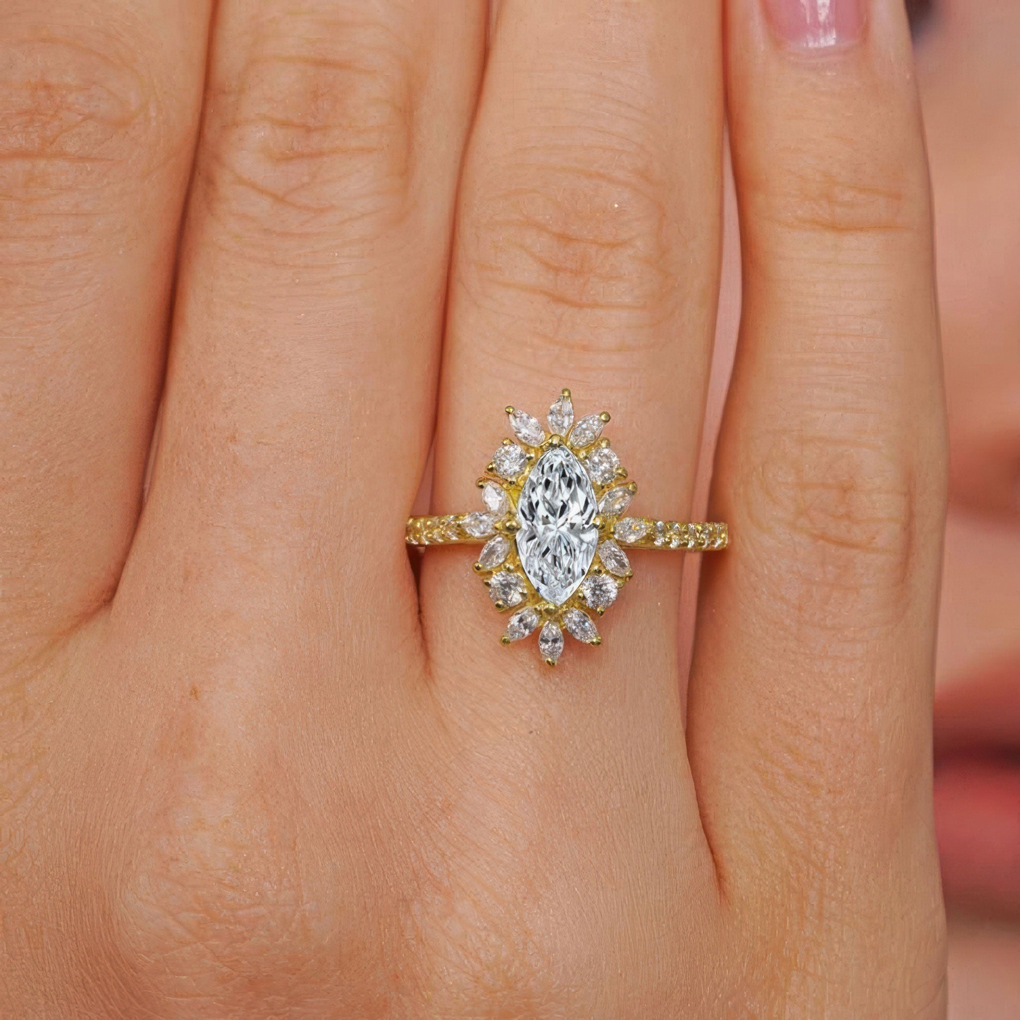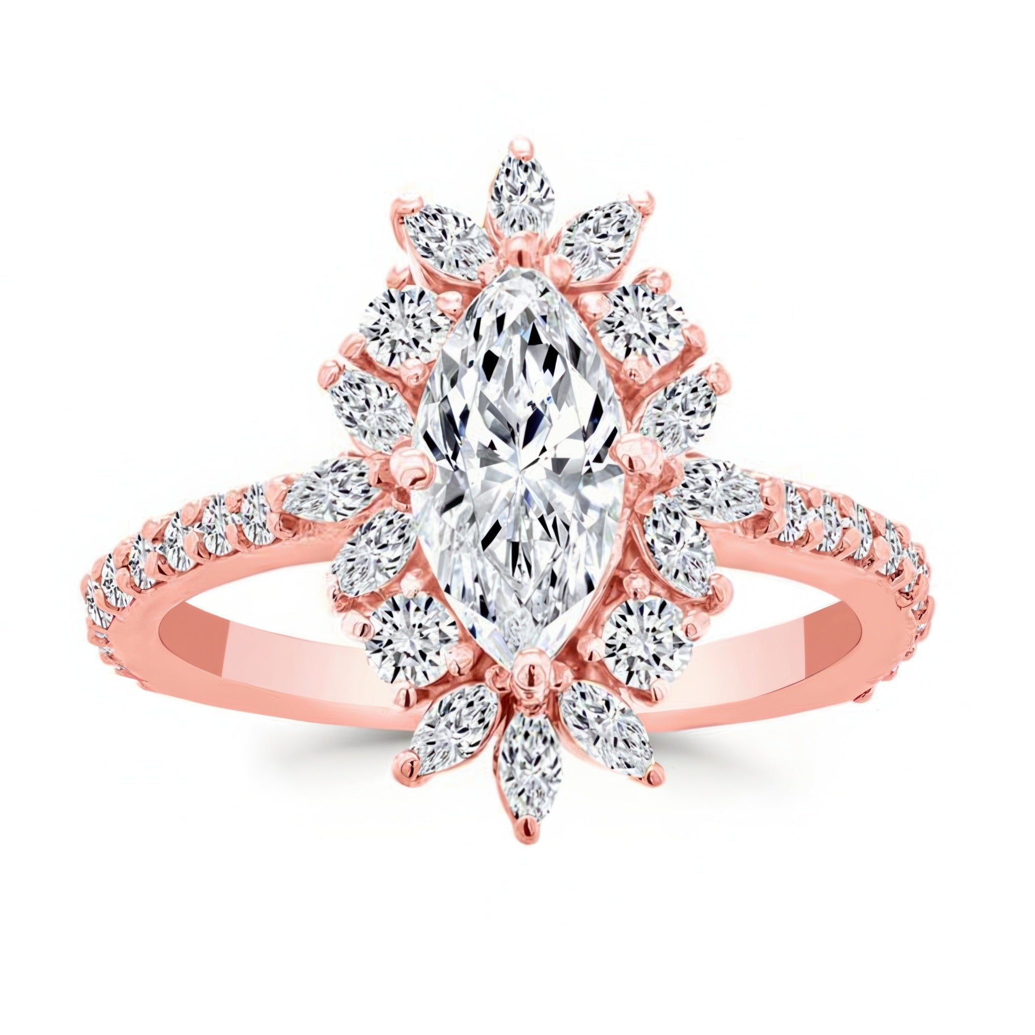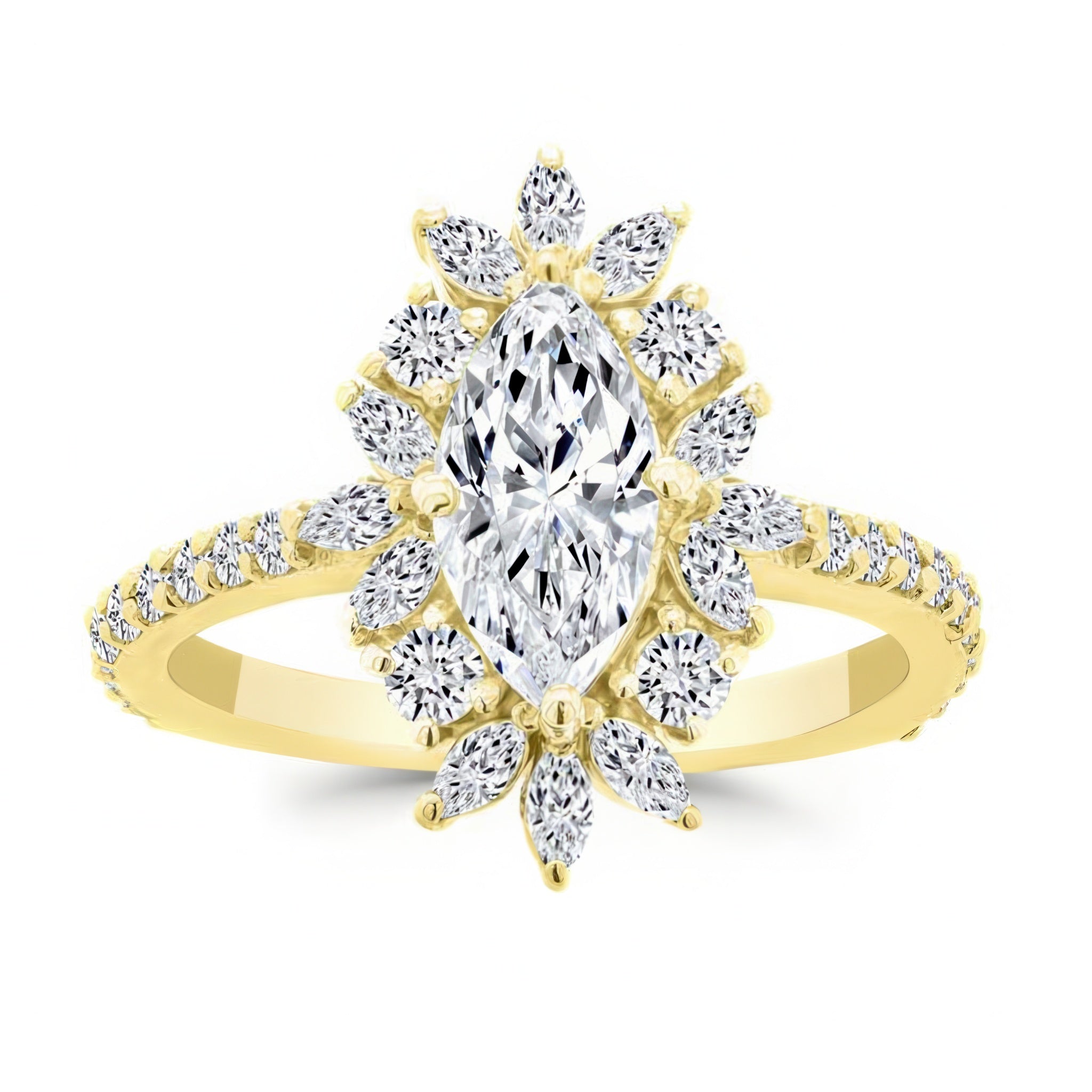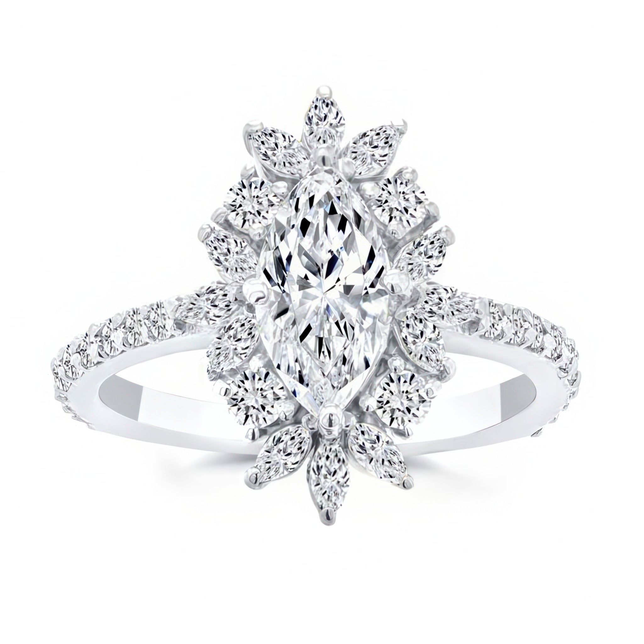 Presenting a stunning marquise diamond engagement ring, designed to captivate. This elegant piece features a central marquise diamond encircled by a halo of 12 shimmering marquise diamonds and 4 round diamonds, creating a breathtaking floral effect around the center stone. The band is further adorned with 20 brilliant round diamonds, adding extra sparkle along the shank. This ring is a perfect choice for those seeking a timeless, sophisticated design with a unique twist on classic elegance.