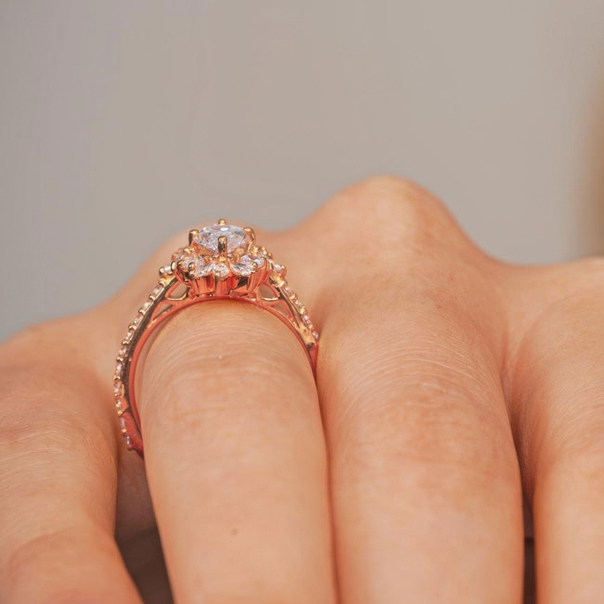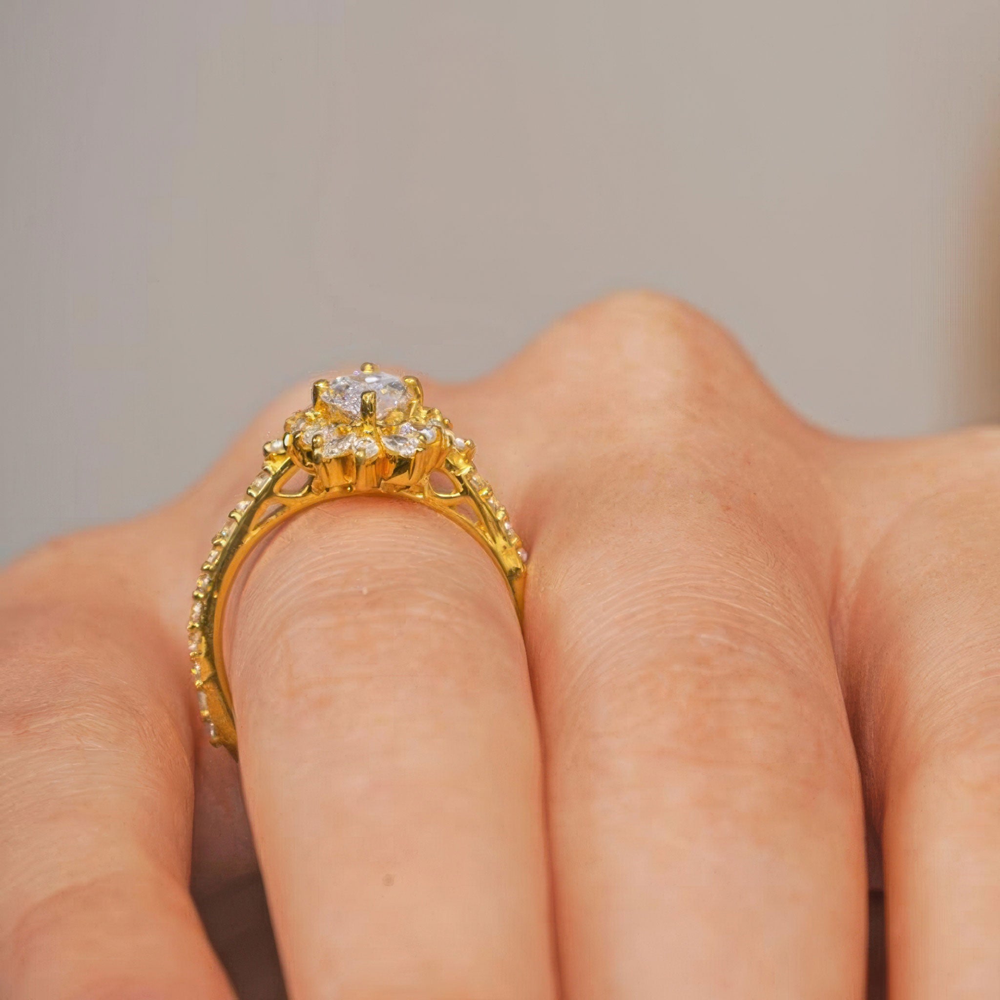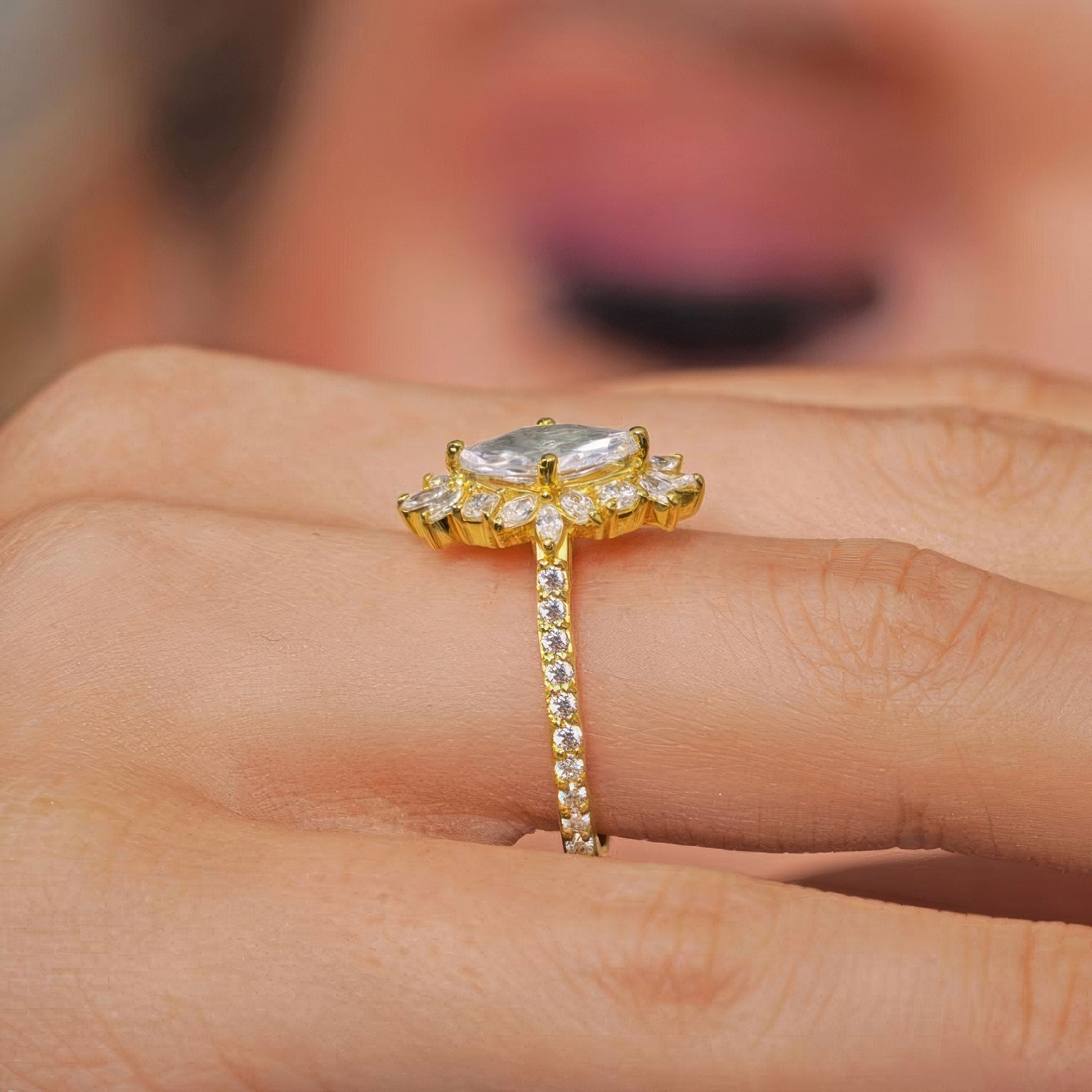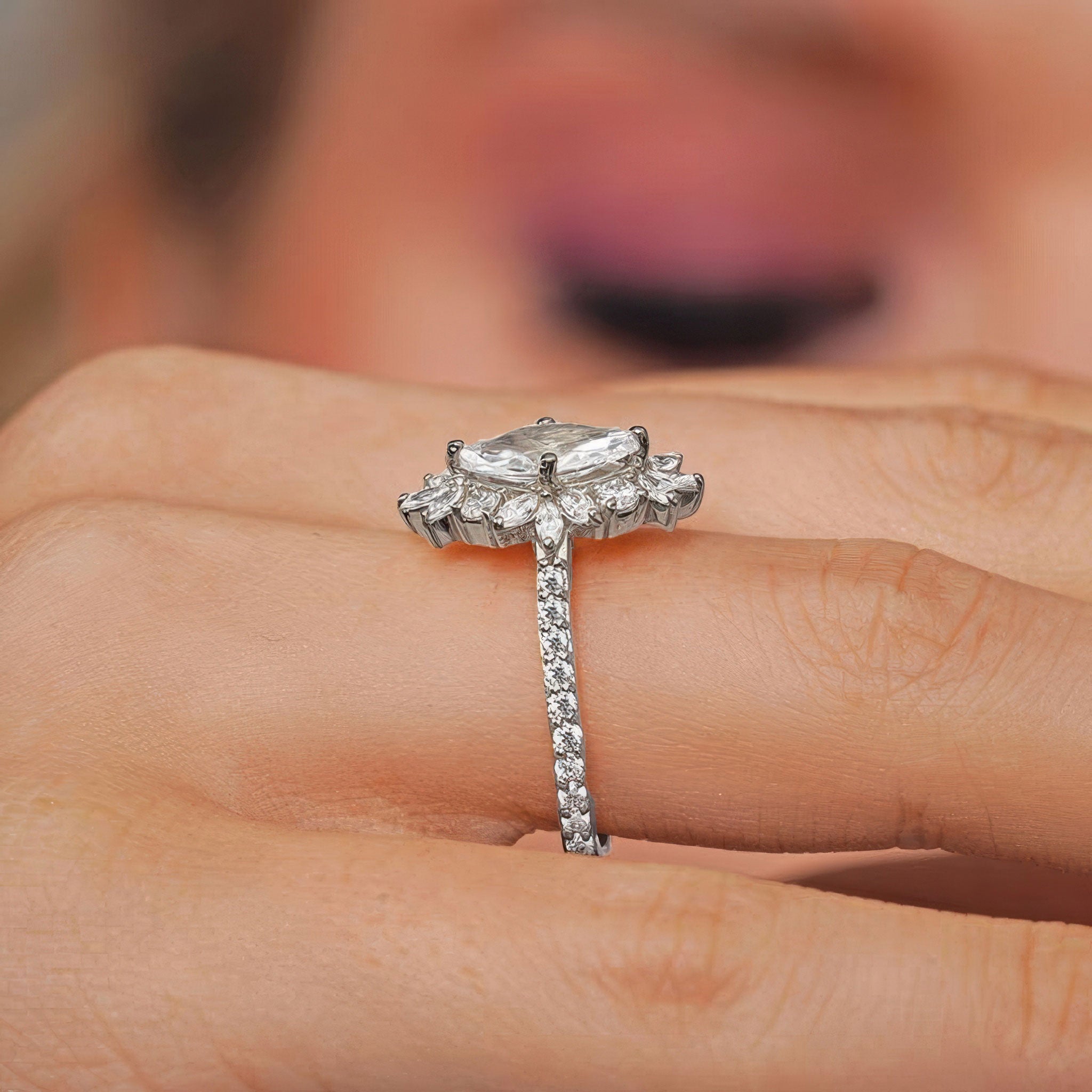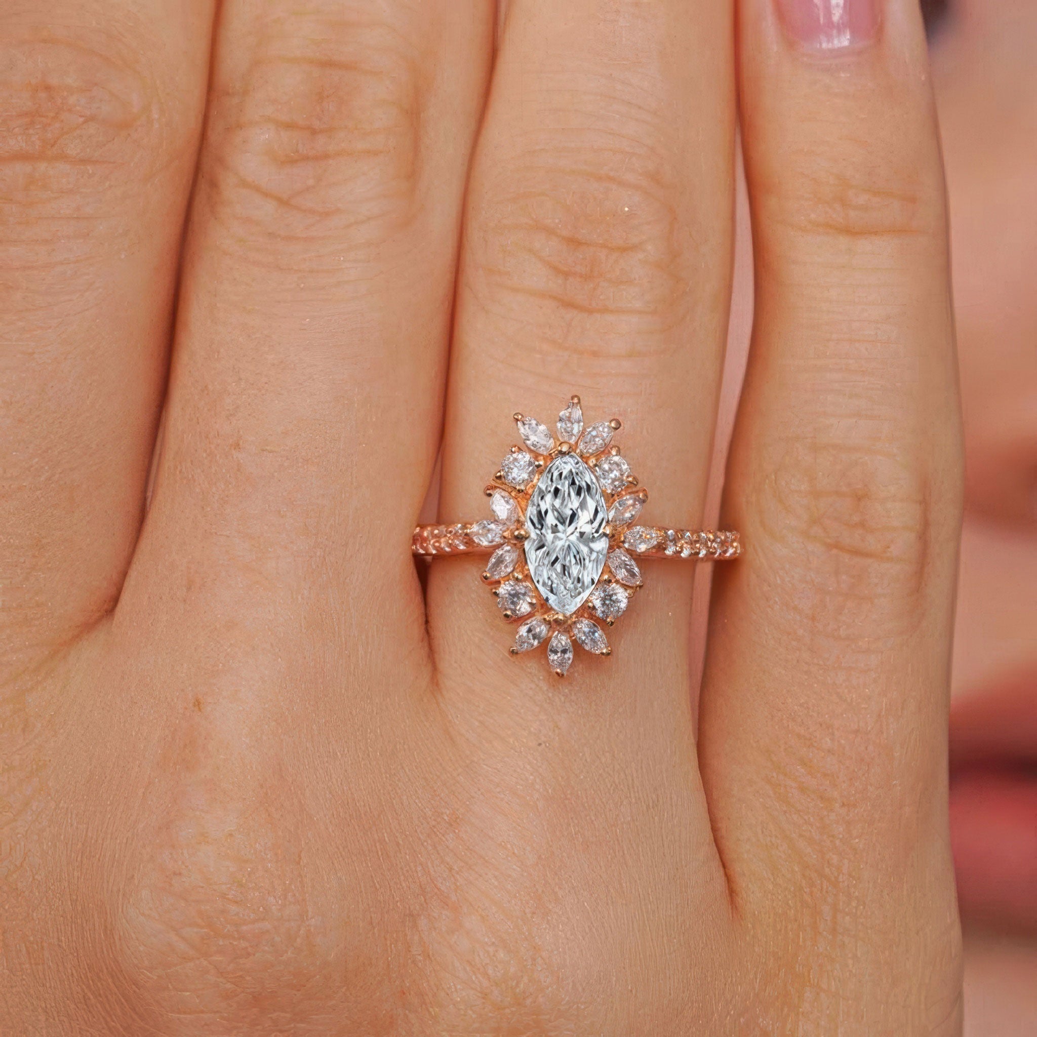 Presenting a stunning marquise diamond engagement ring, designed to captivate. This elegant piece features a central marquise diamond encircled by a halo of 12 shimmering marquise diamonds and 4 round diamonds, creating a breathtaking floral effect around the center stone. The band is further adorned with 20 brilliant round diamonds, adding extra sparkle along the shank. This ring is a perfect choice for those seeking a timeless, sophisticated design with a unique twist on classic elegance.