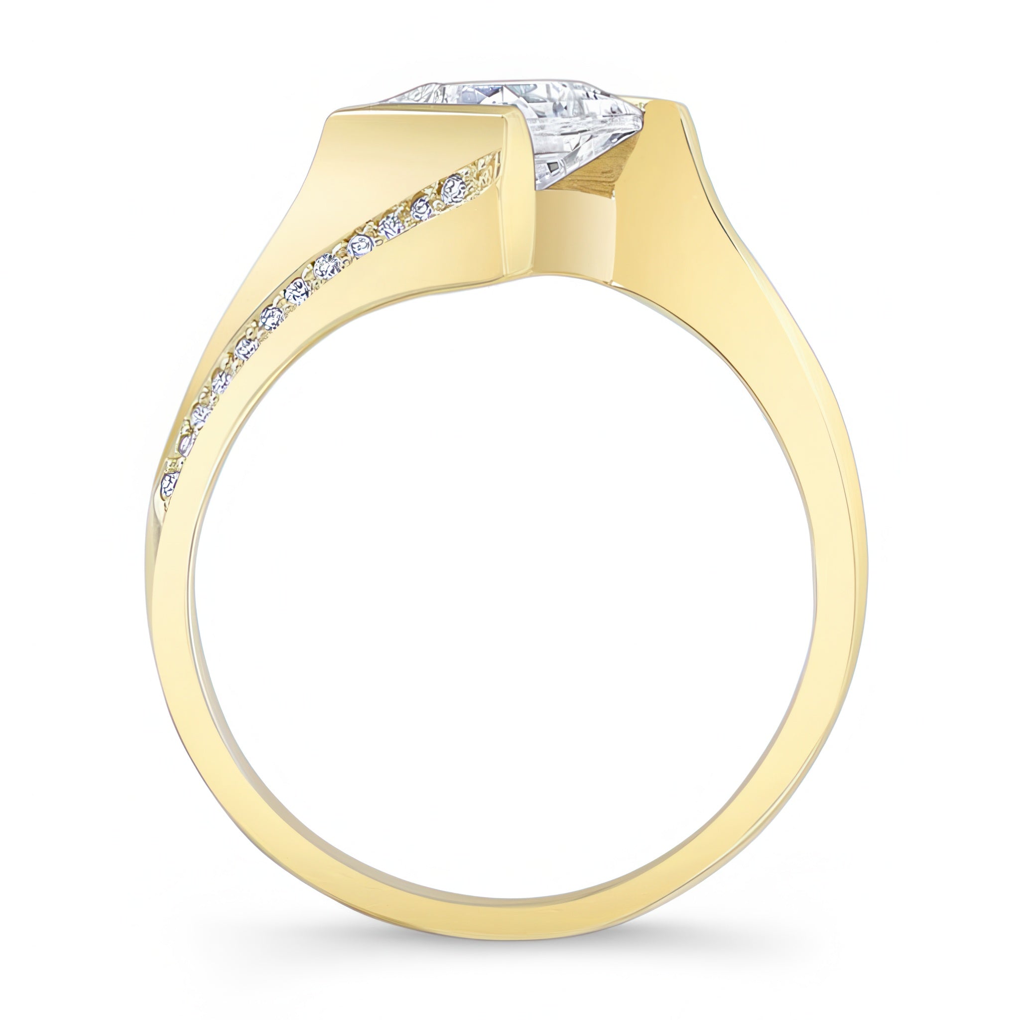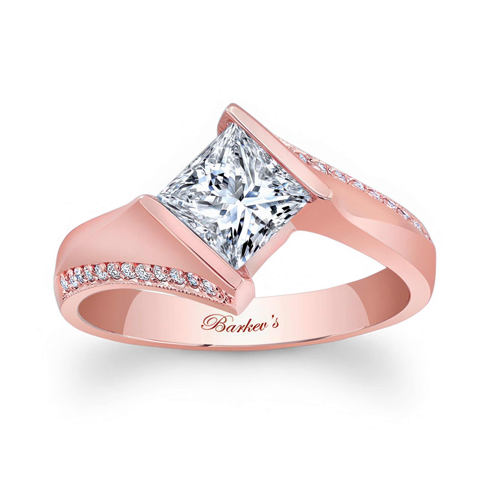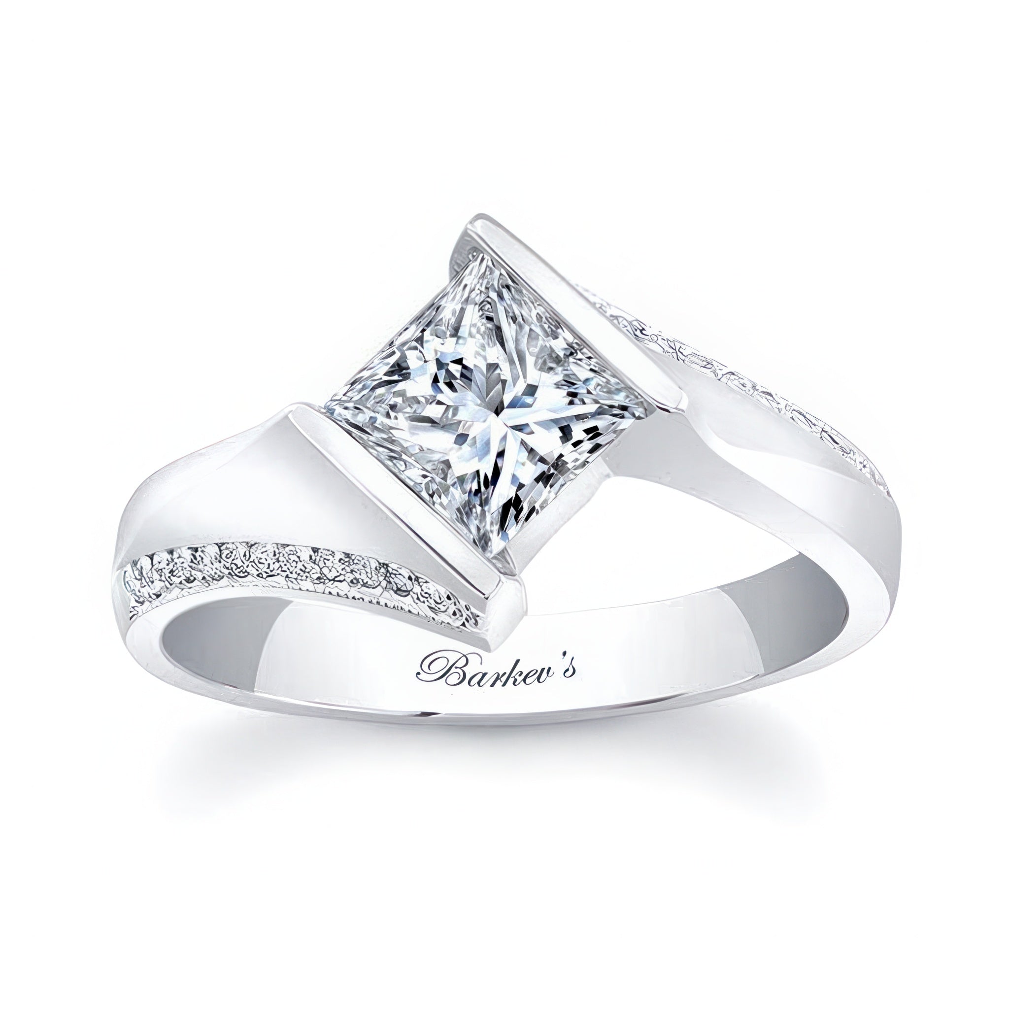 A stunning princess cut square diamond ring featuring a channel set center that's captured by the ridges while pave set melees accent the bright polished shoulders for an elegant look.