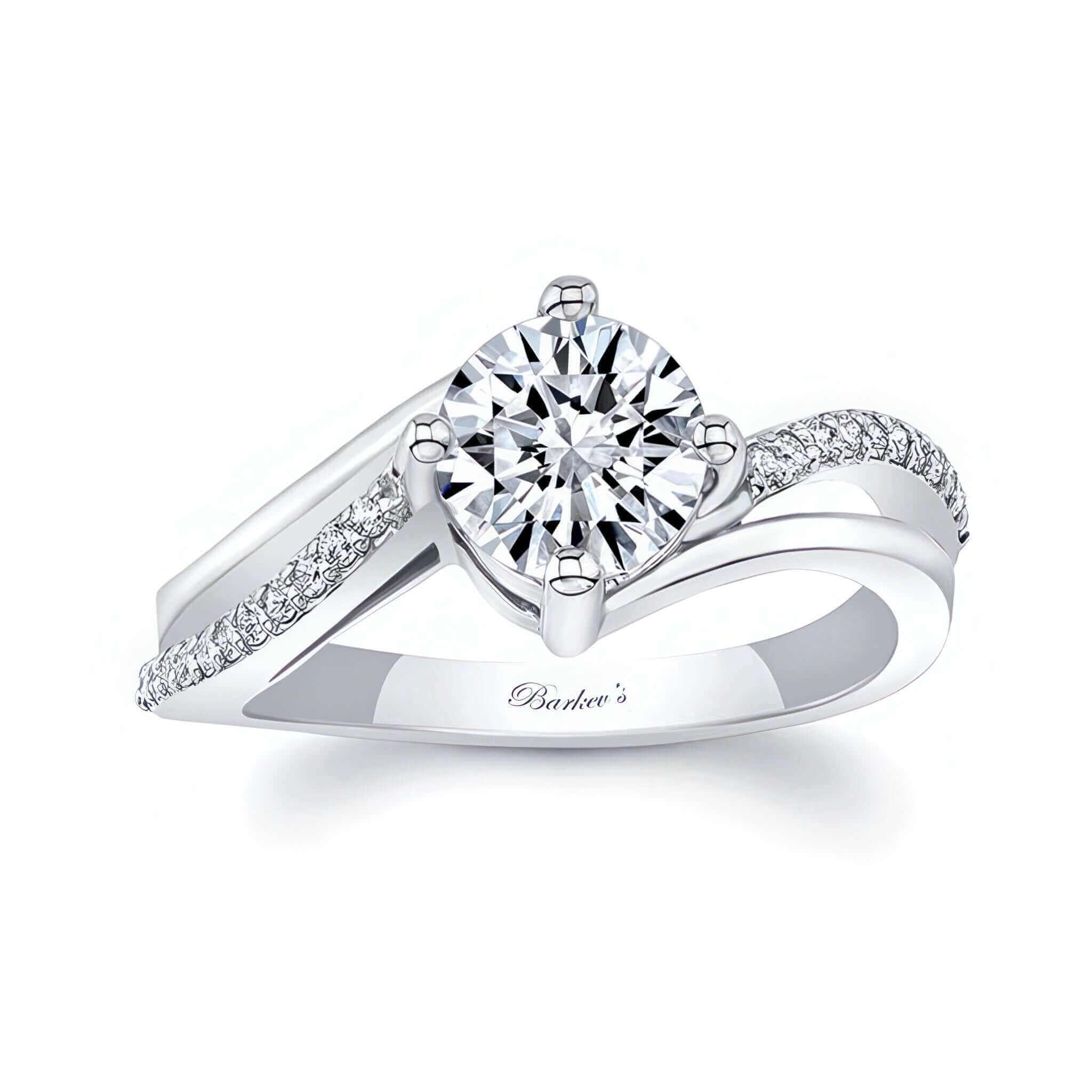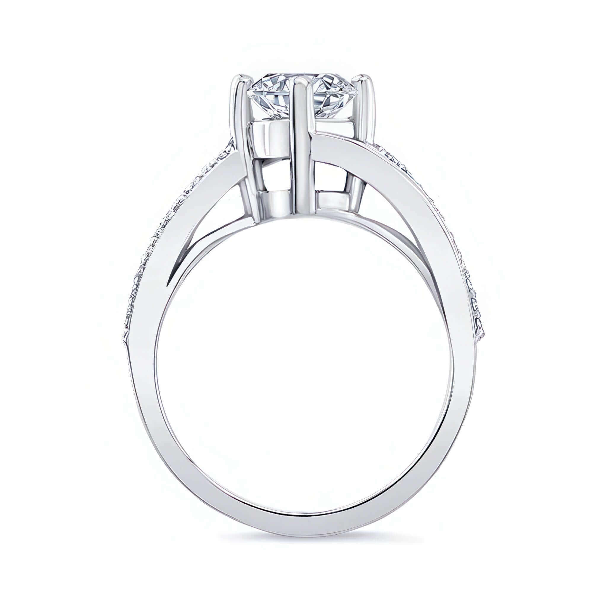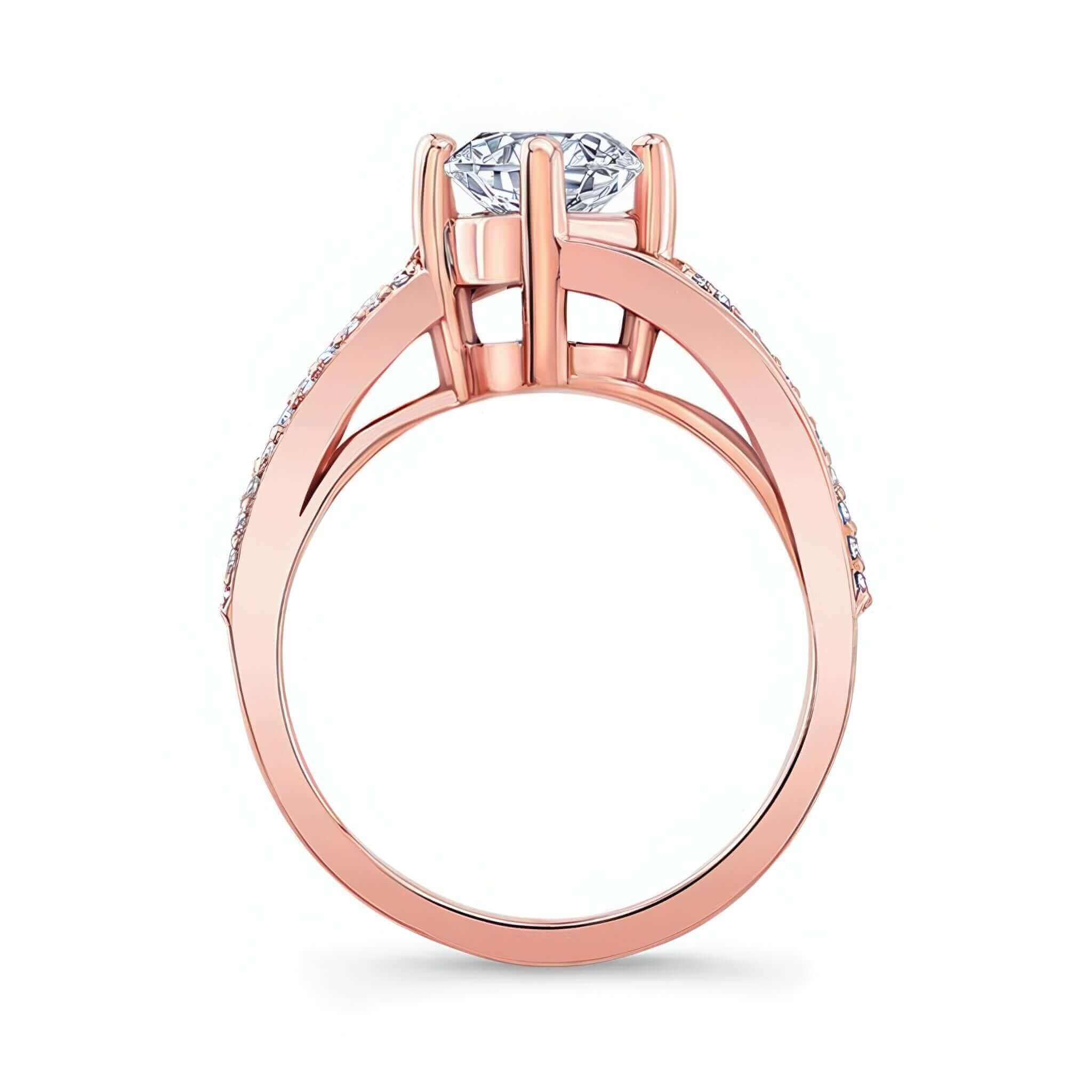 A split shank engagement ring featuring a round center nestled between separated swirls adorned with diamonds for an extra touch of brilliance.