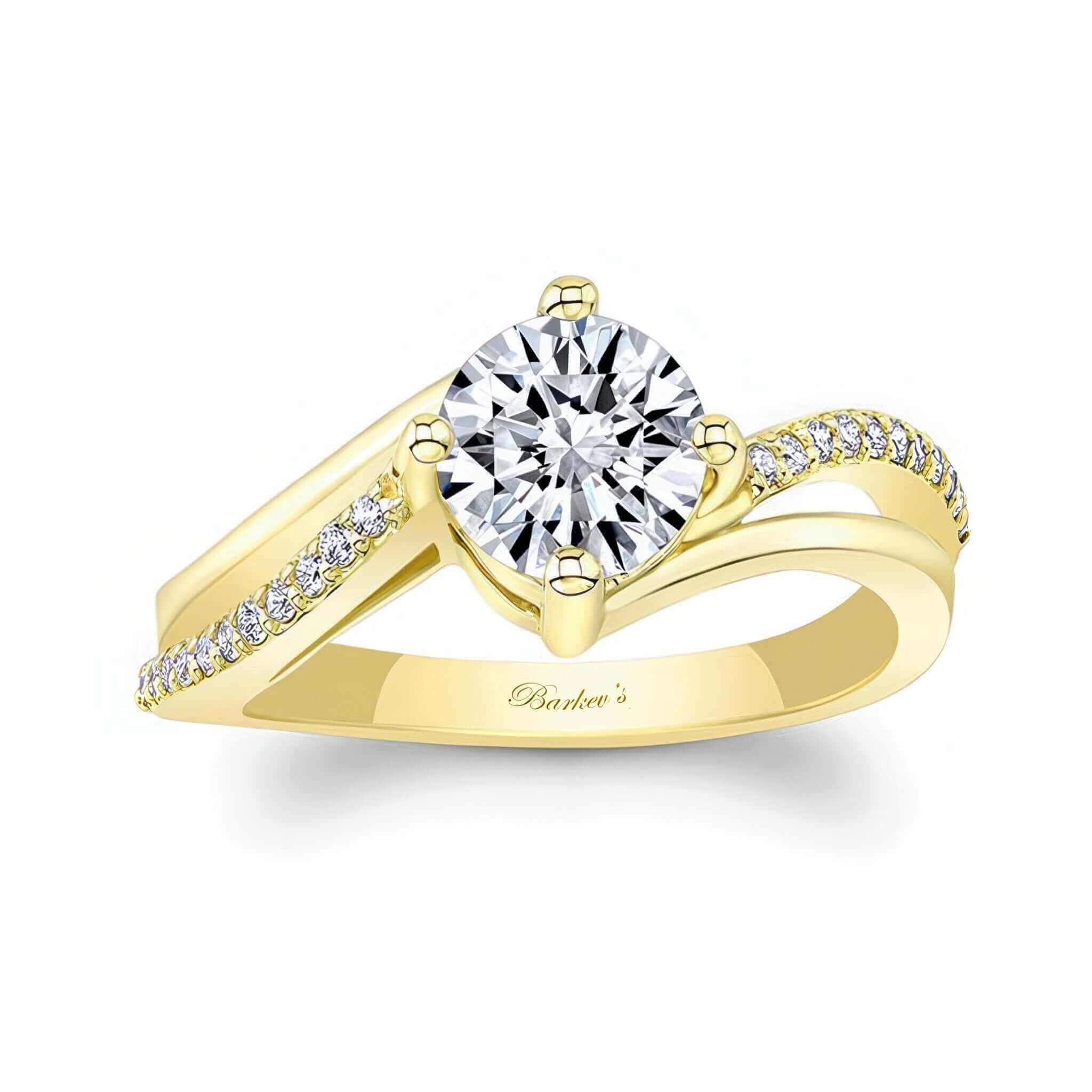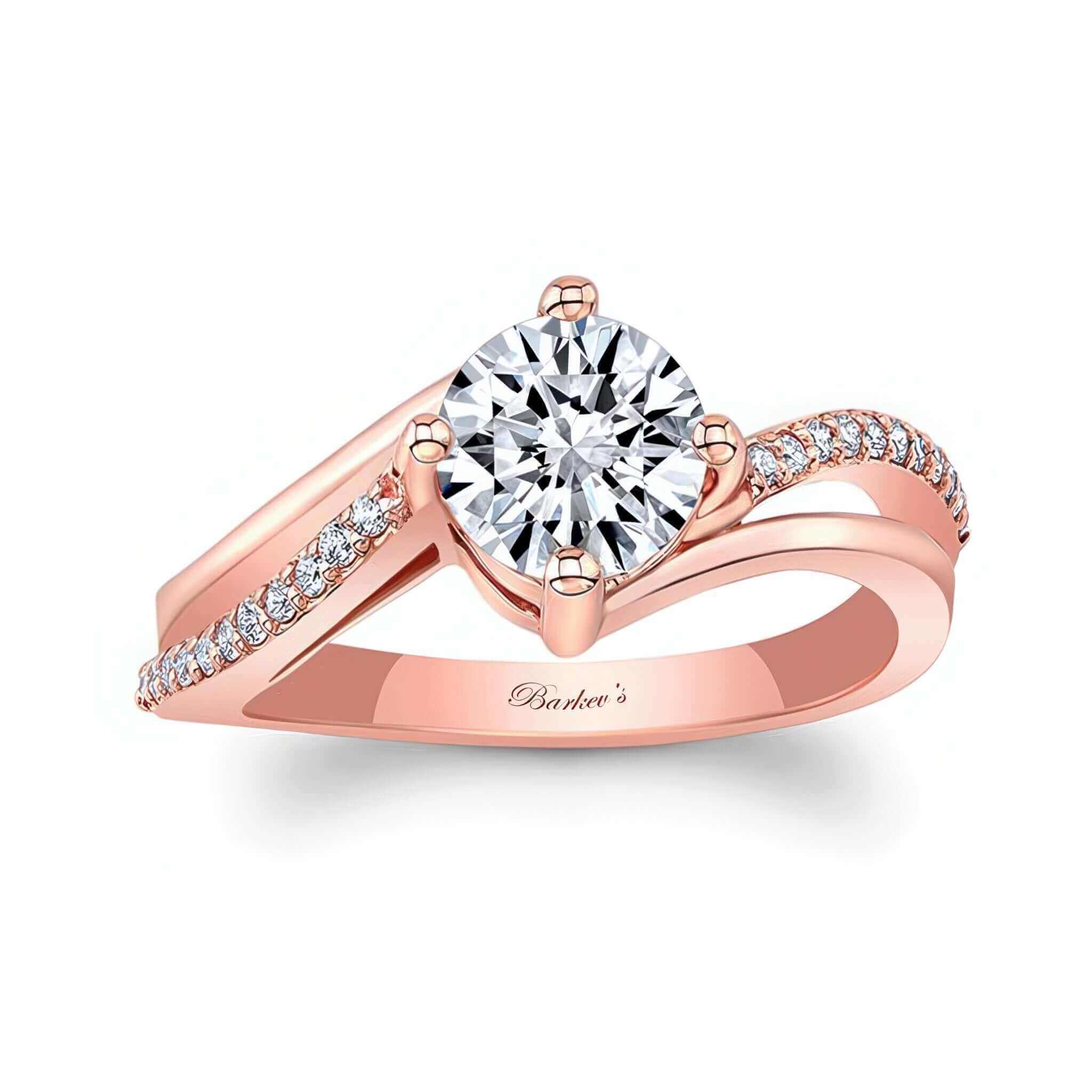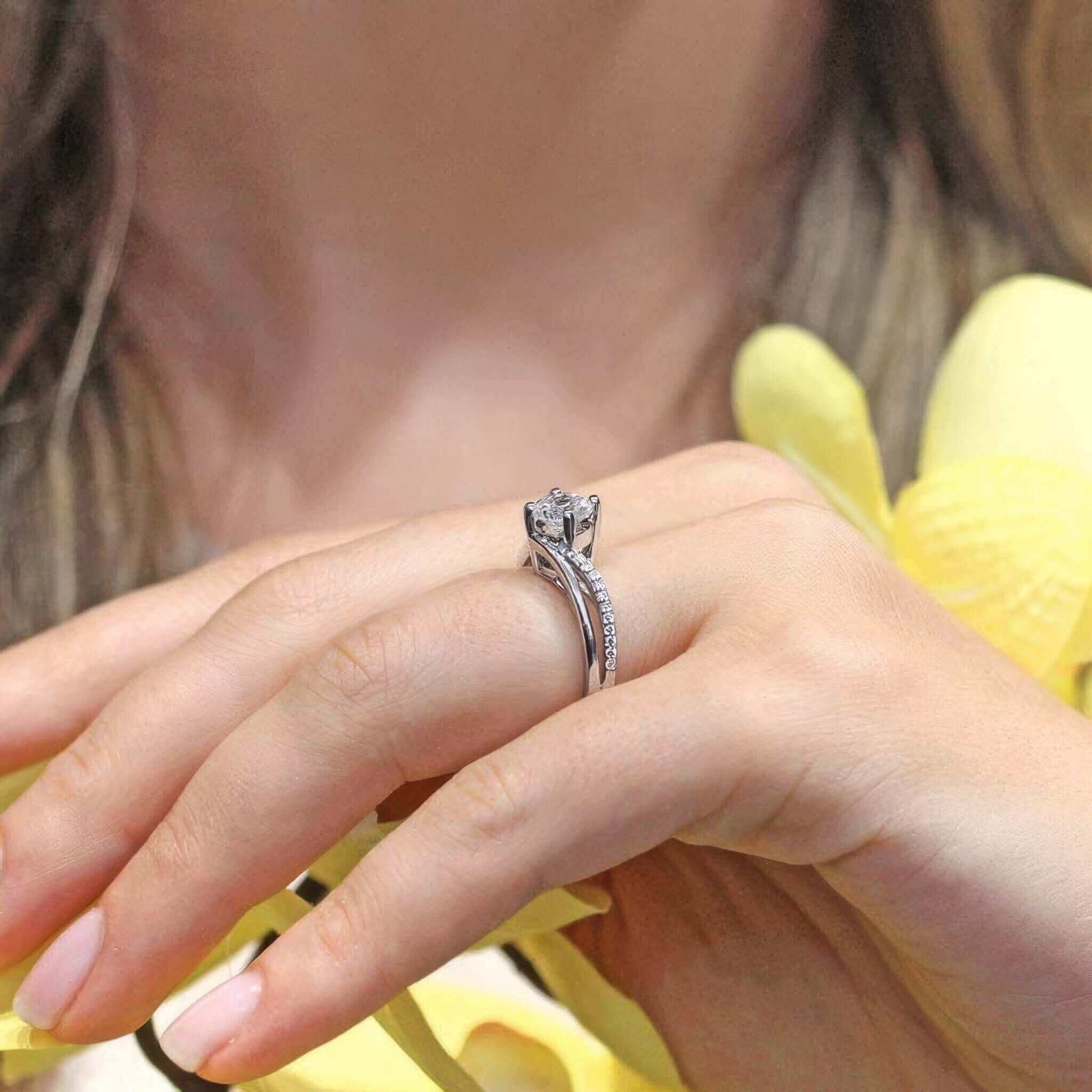 A split shank engagement ring featuring a round center nestled between separated swirls adorned with diamonds for an extra touch of brilliance.