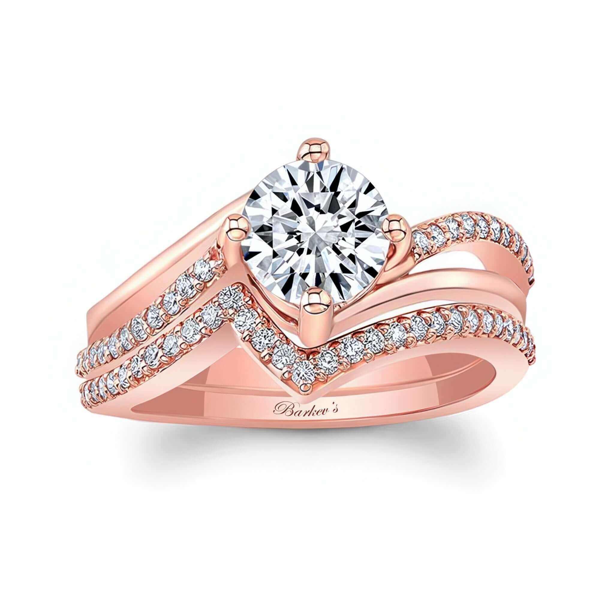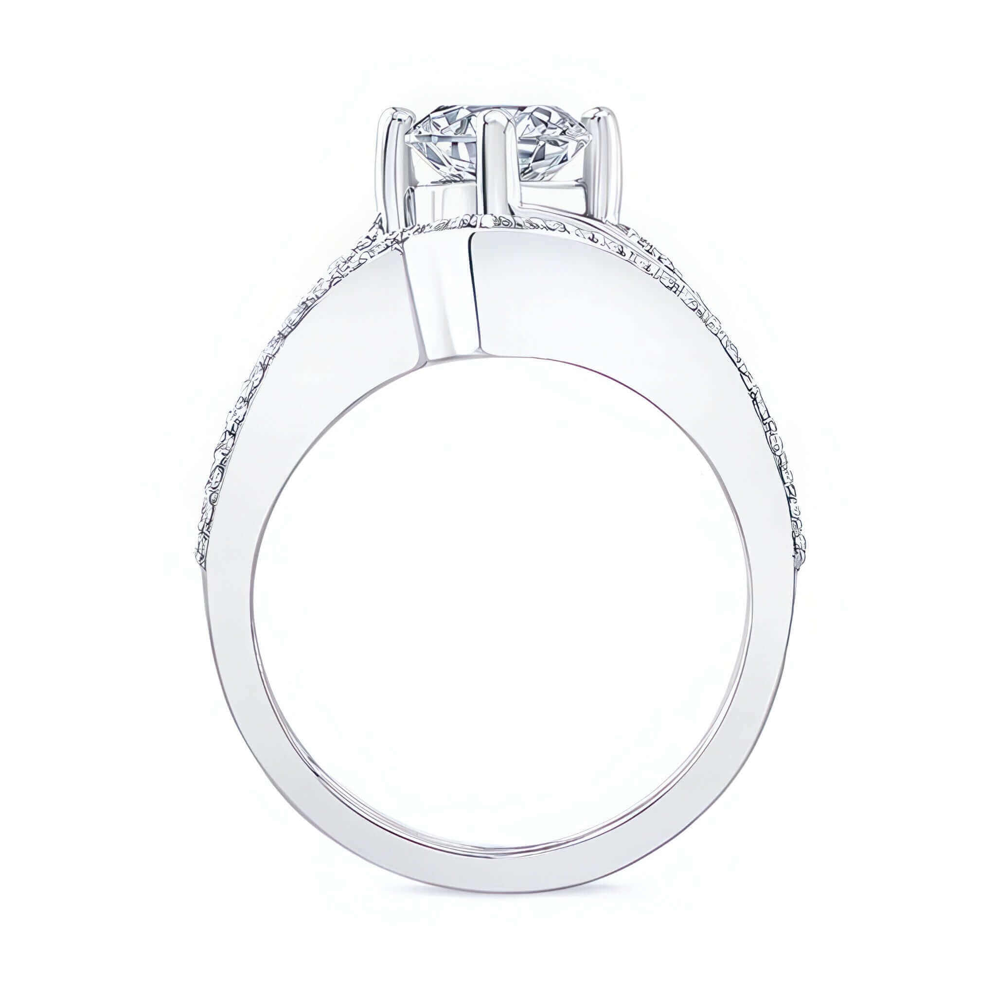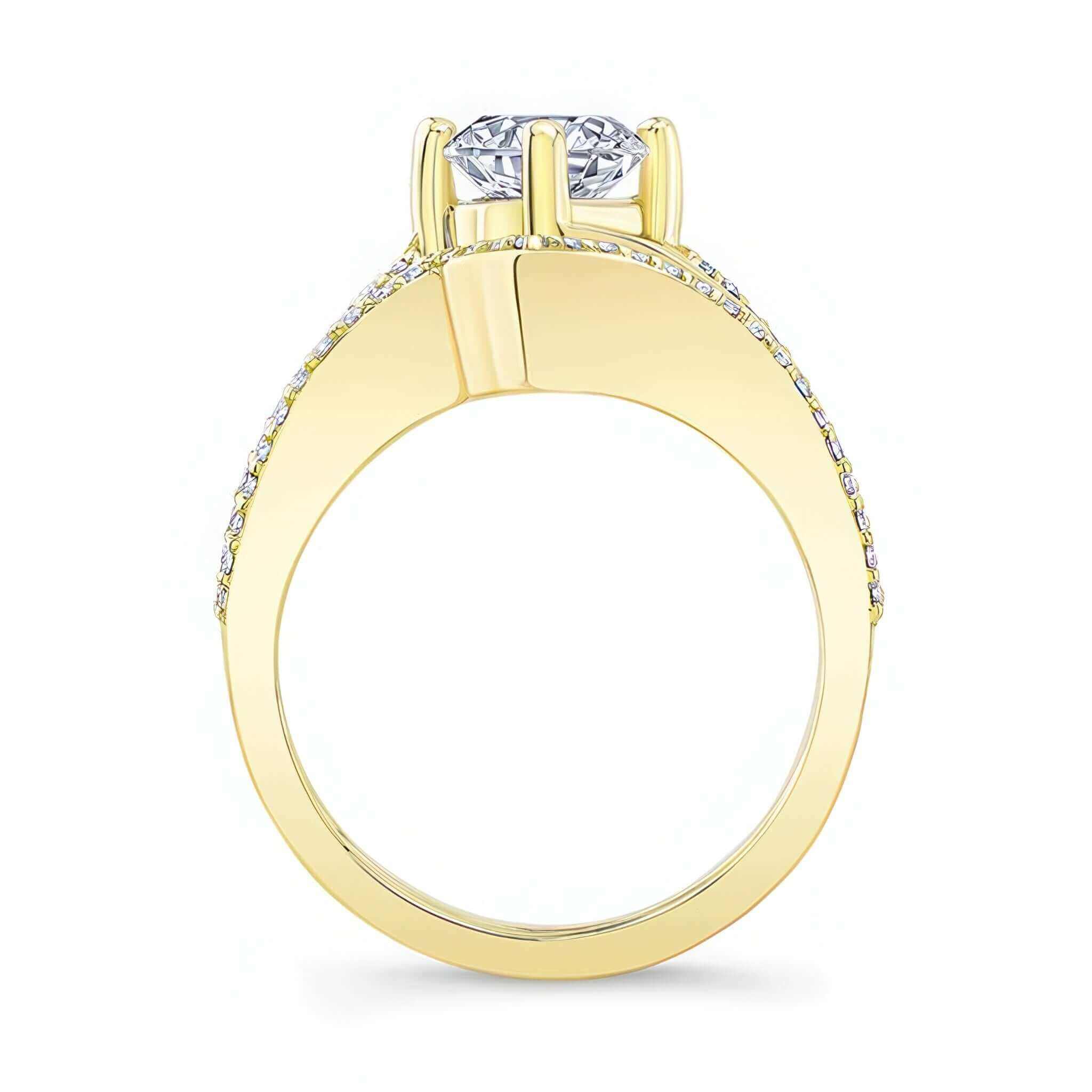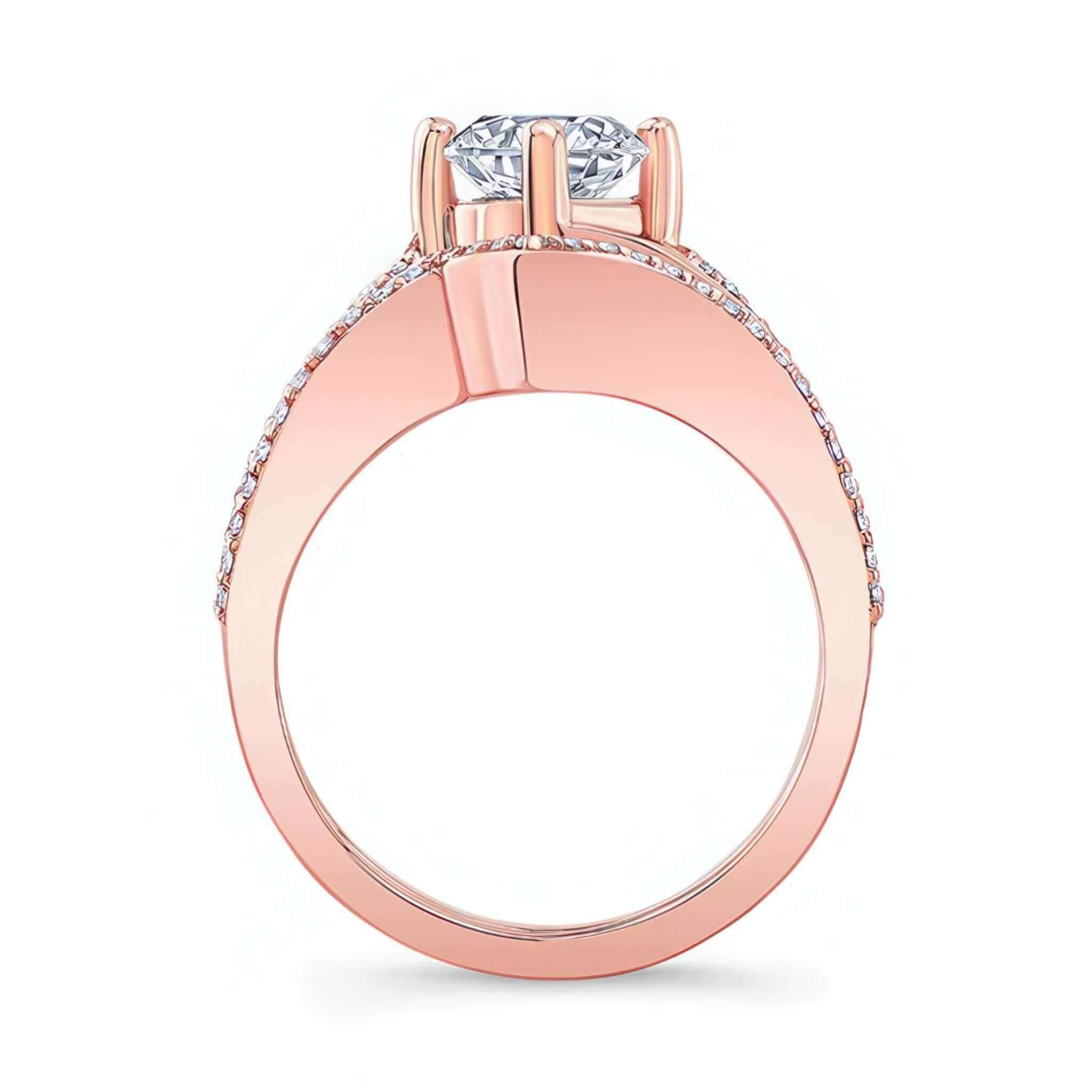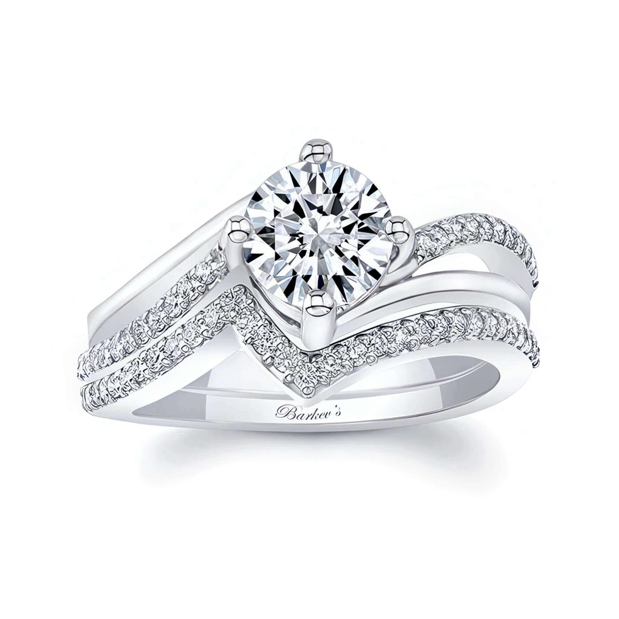 A split shank wedding set featuring a round center nestled between separated swirls adorned with diamonds for an extra touch of brilliance. Comes with a matching wedding band.