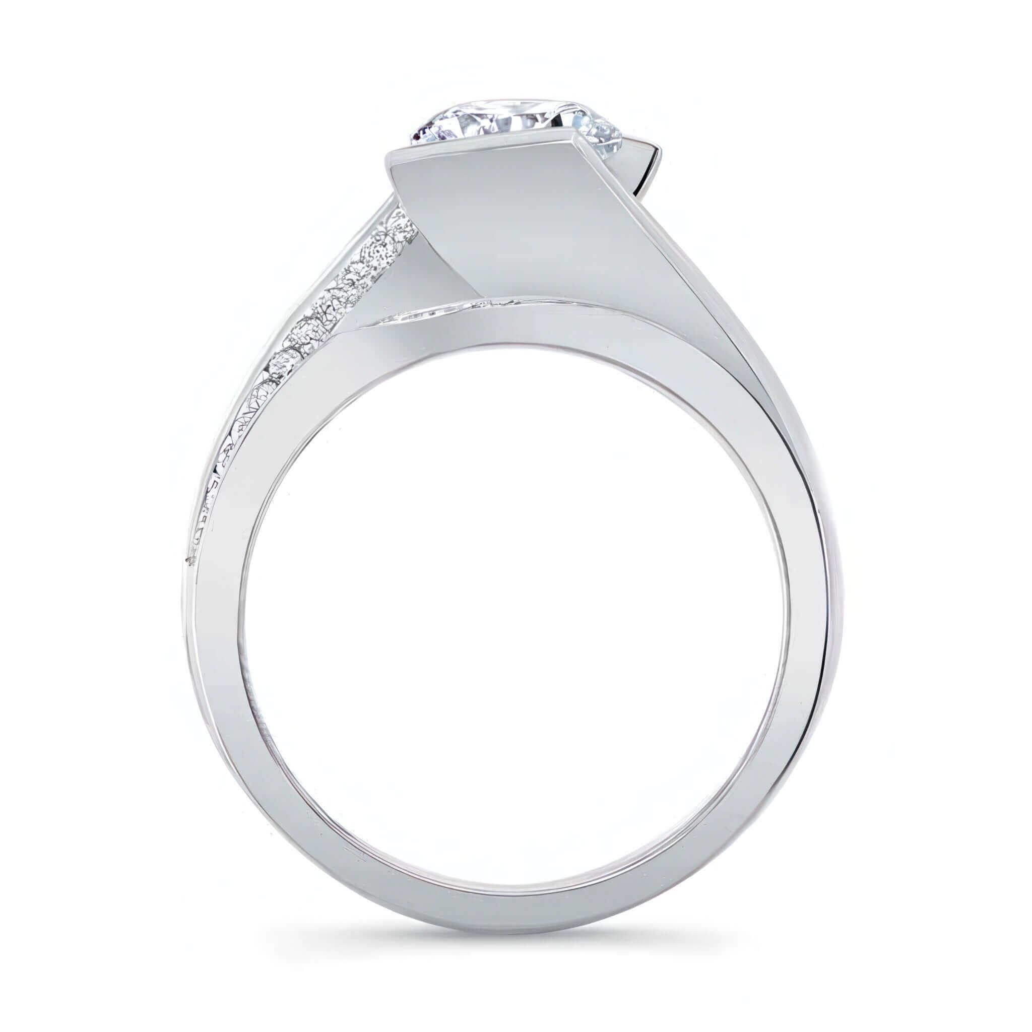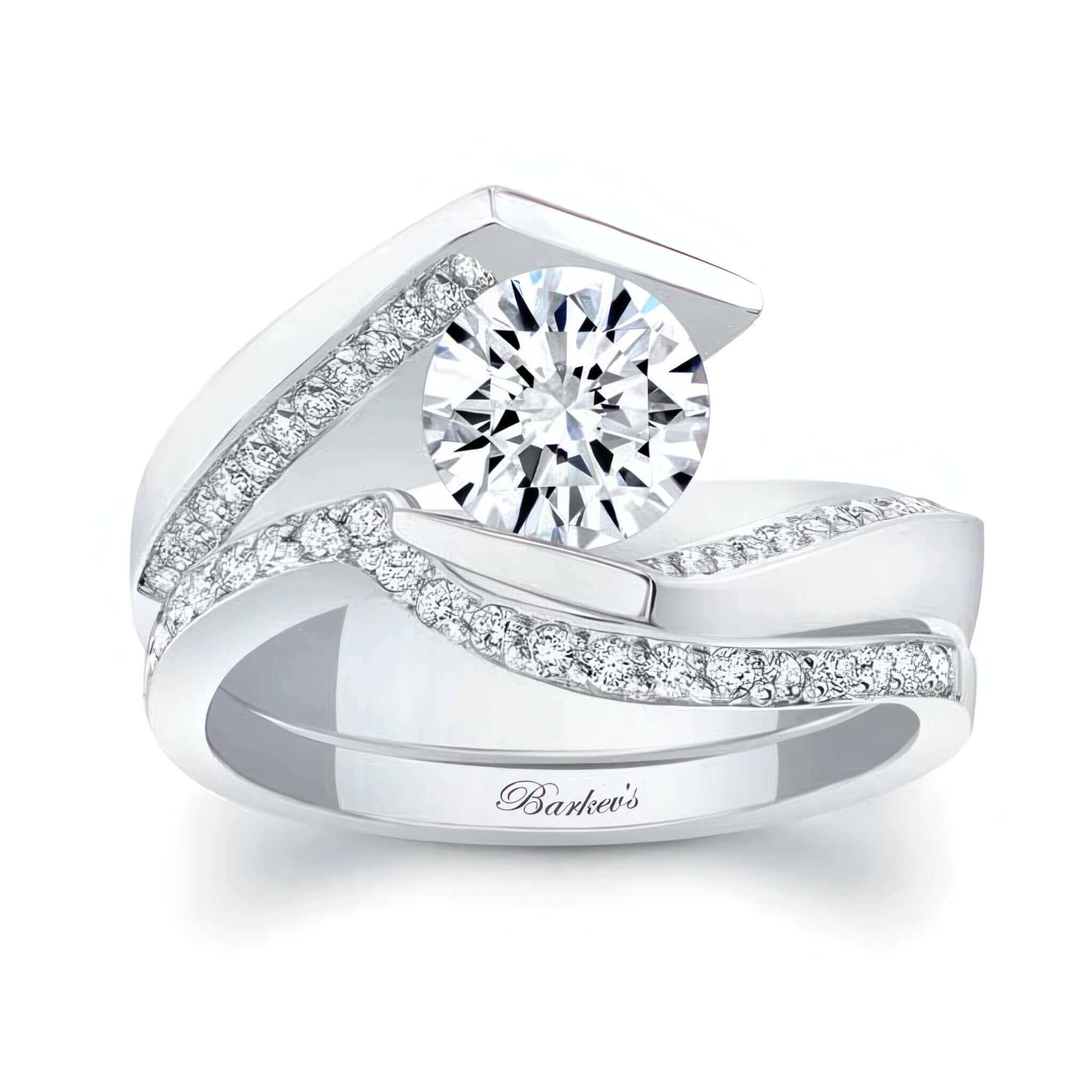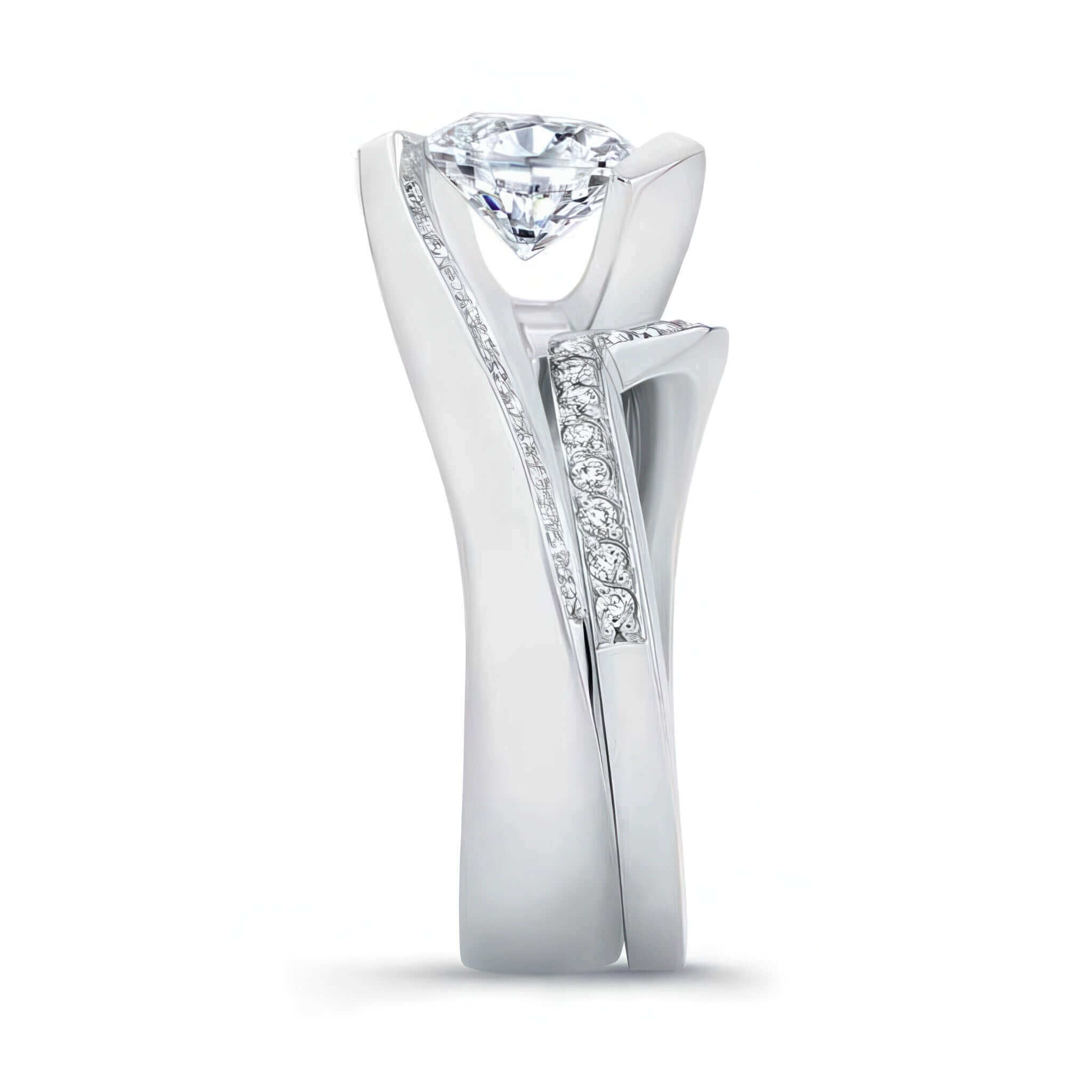 This stunning tension setting bridal set is decorated by channel set diamonds on both sides of the shank, the ring gracefully twists whilst embracing the elevated center in a tension setting. Comes with a matching diamond wedding band.