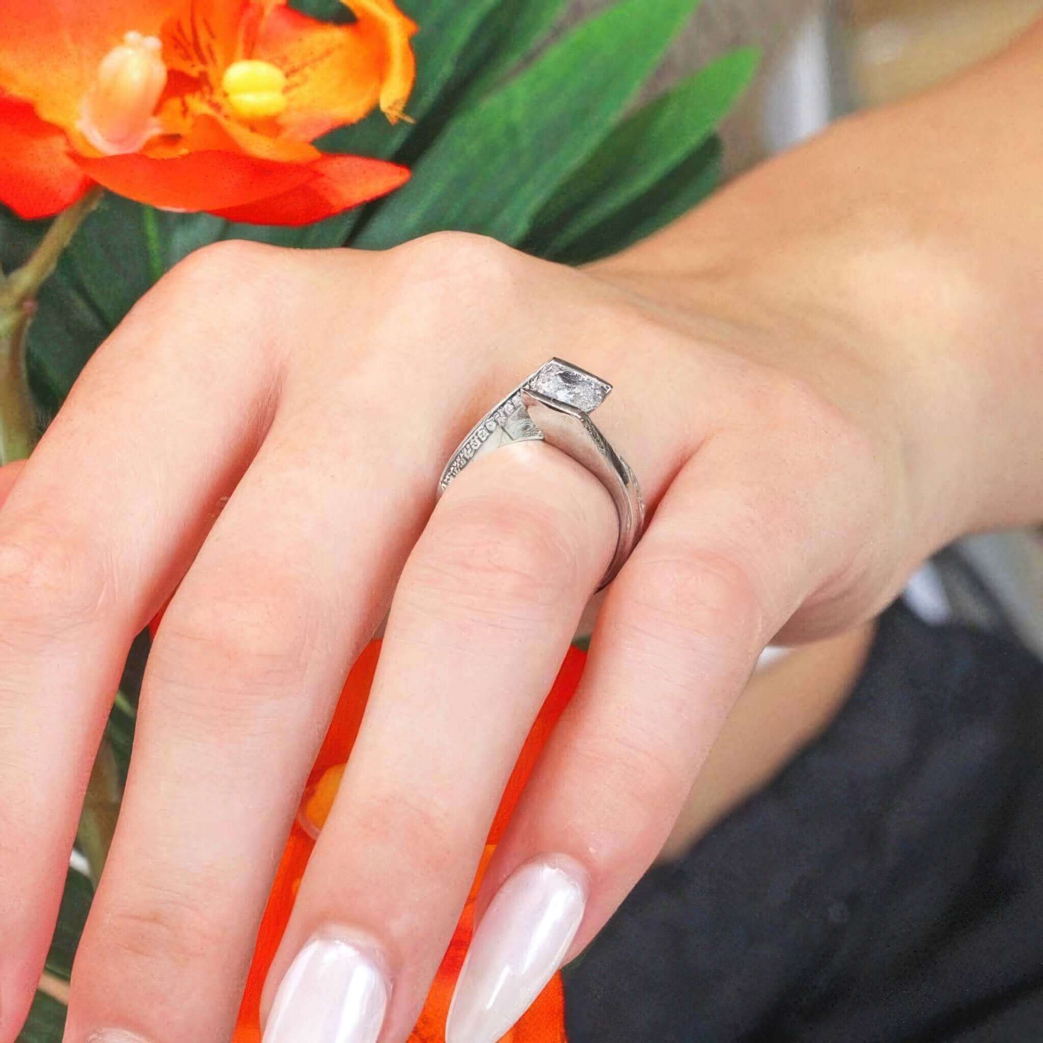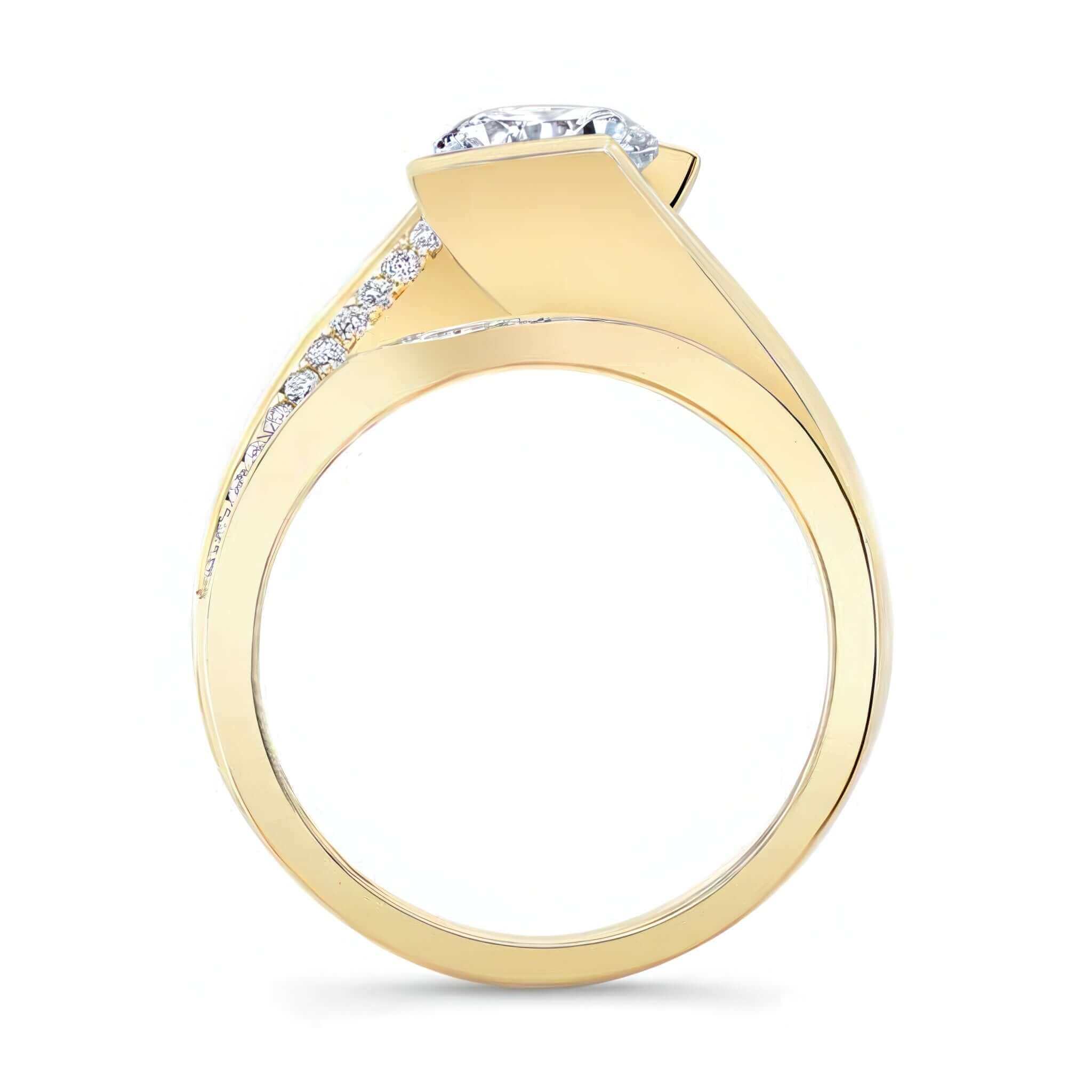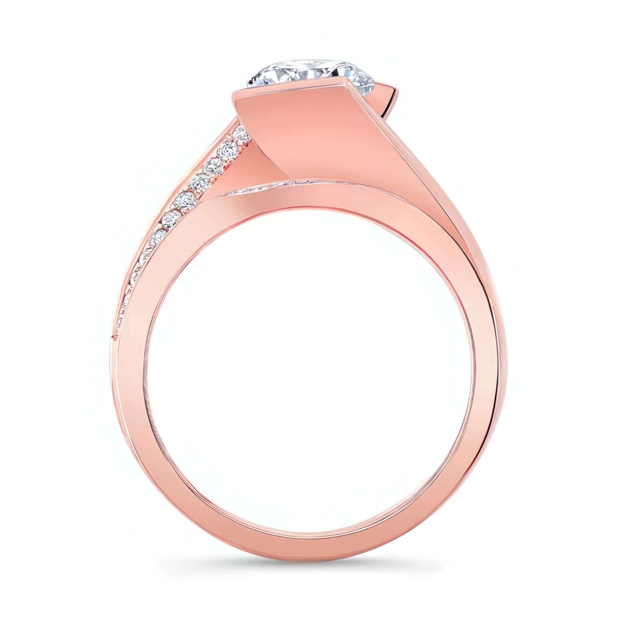This stunning tension setting bridal set is decorated by channel set diamonds on both sides of the shank, the ring gracefully twists whilst embracing the elevated center in a tension setting. Comes with a matching diamond wedding band.