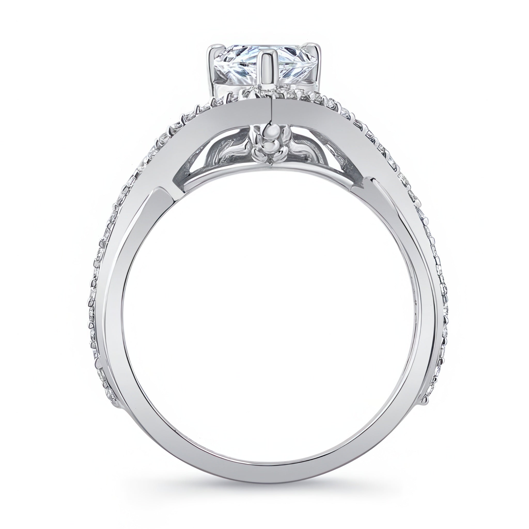 Set in a secure shared-prong setting, the ring offers a flattering lift—not too low, not too high—designed for both presence and practicality. And for an added touch of artistry, a delicate hidden flower accent is tucked beneath the center, offering a sweet detail.