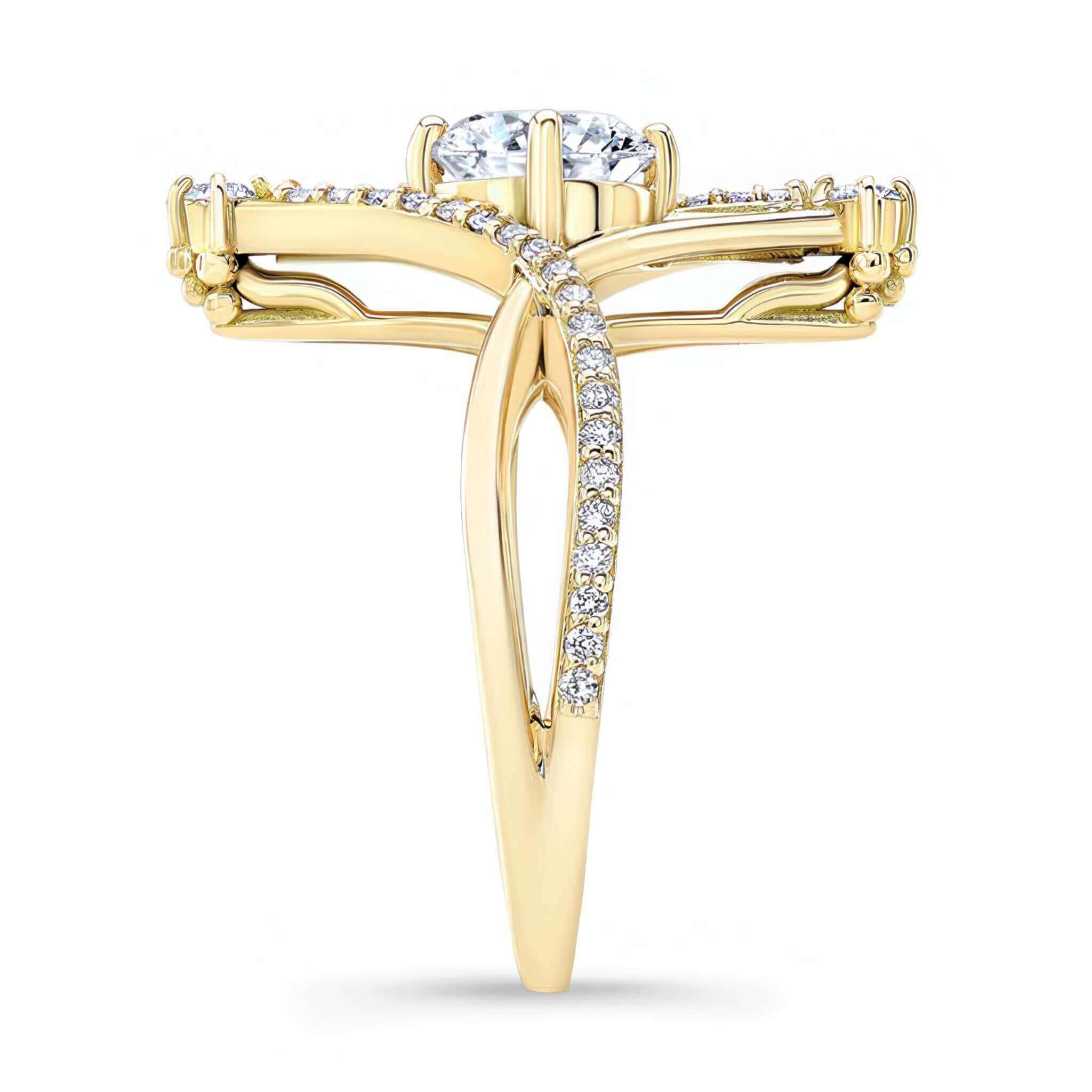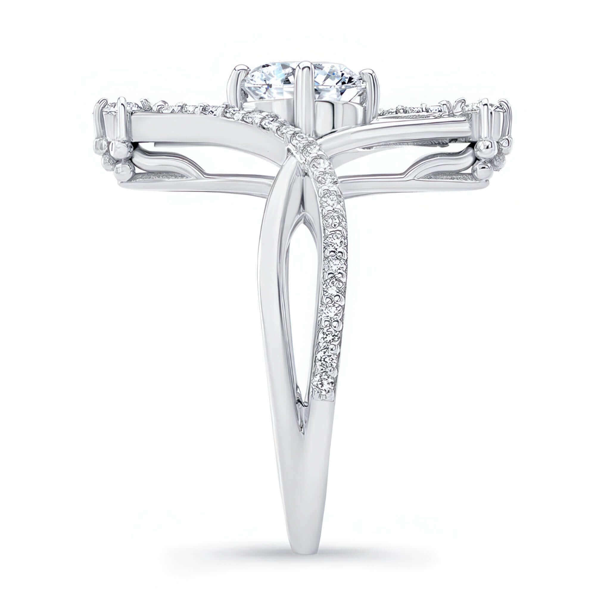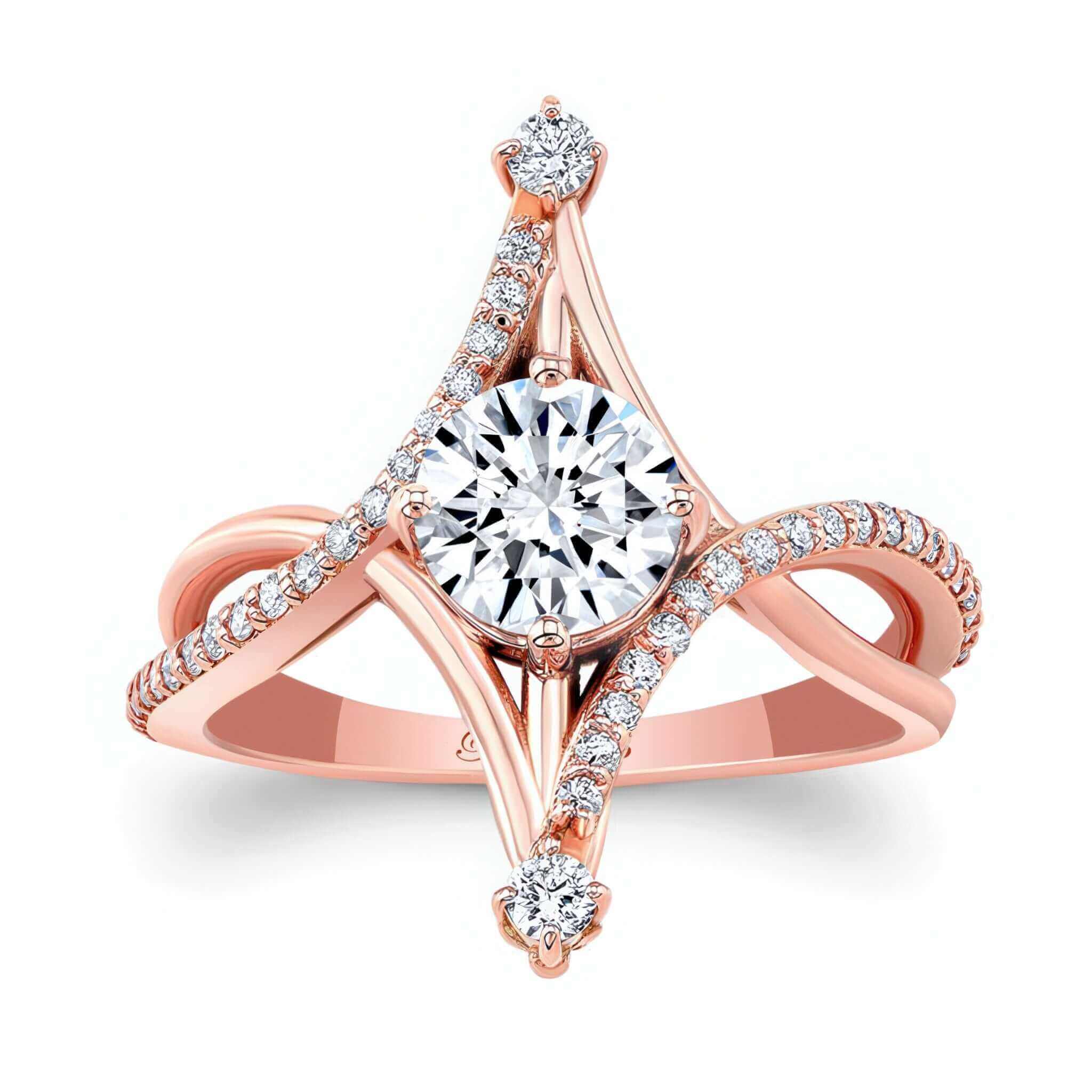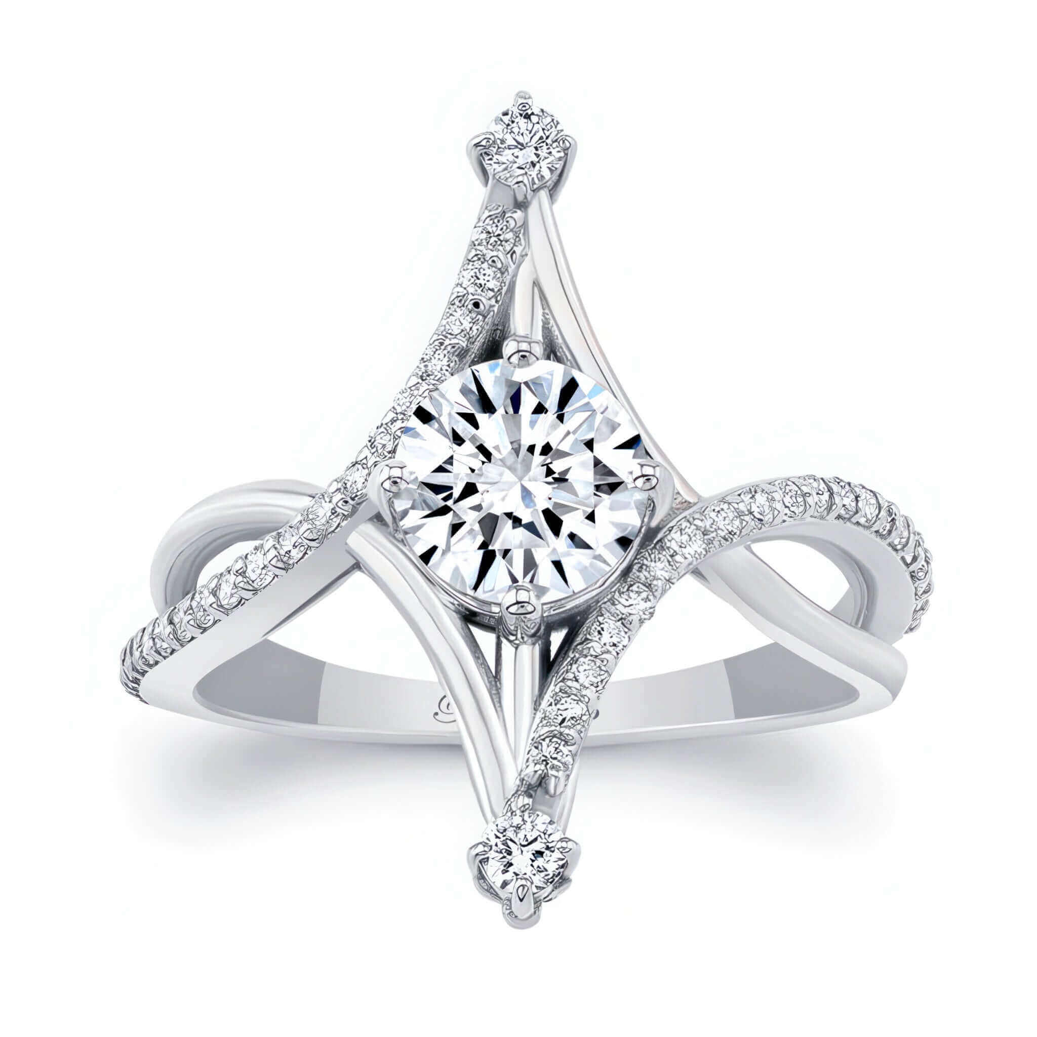 An unusual round diamond ring with it's center glorified by two smaller diamonds set at 12 and 6 o'clock while elegant diamond swirls decorate the sides for a dazzling look.