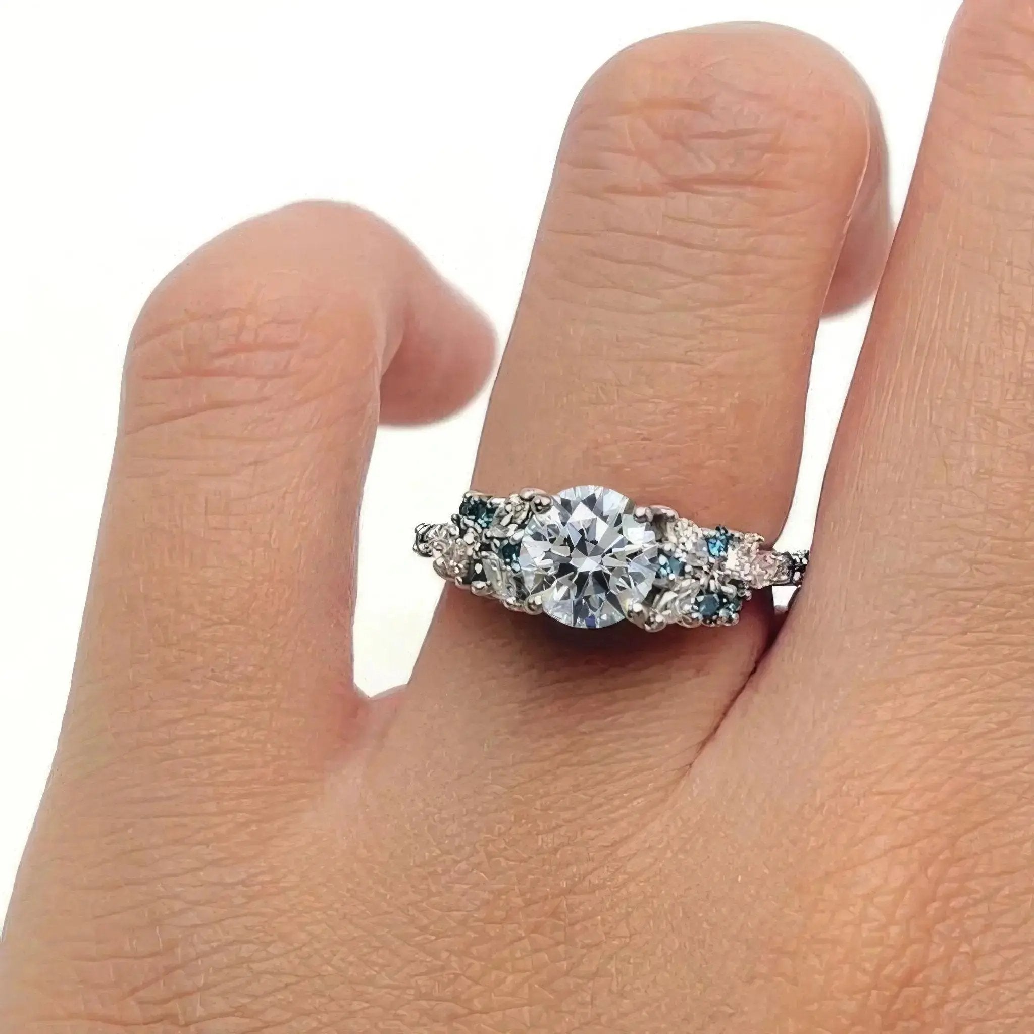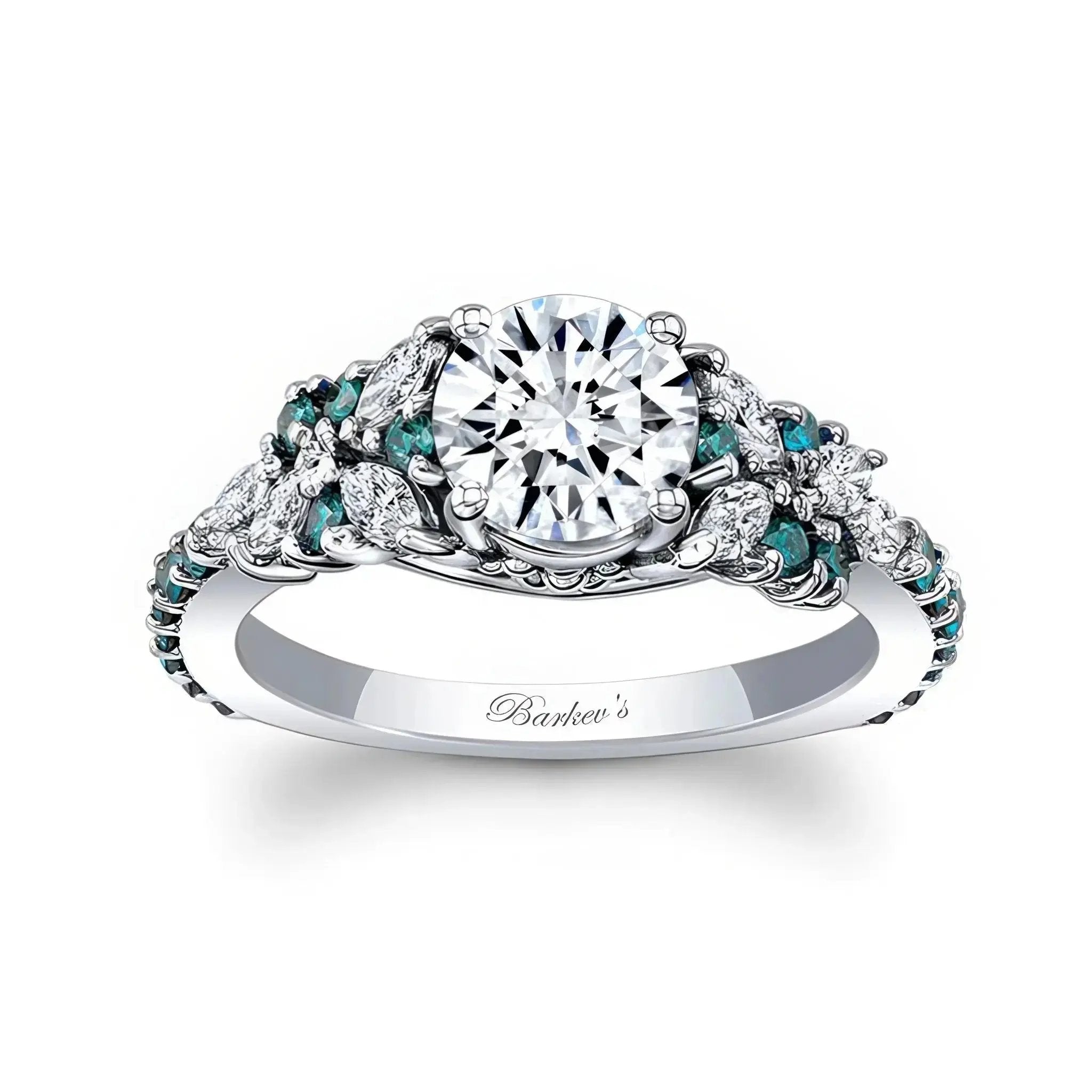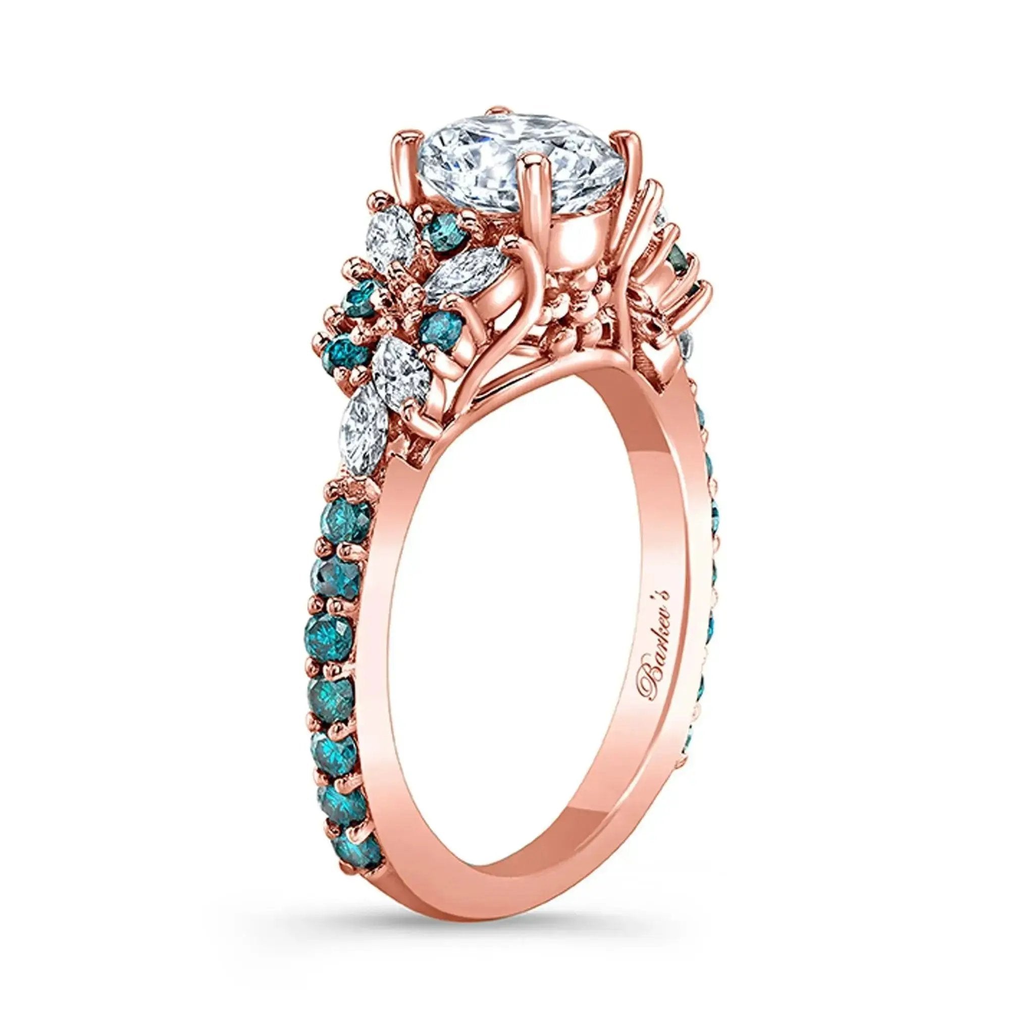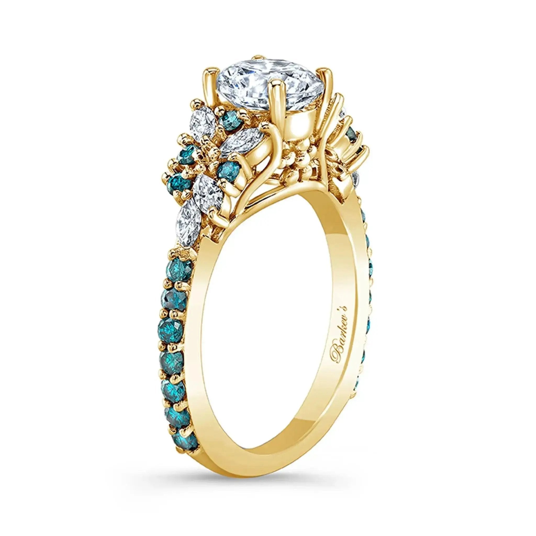An exquisite vintage marquise blue diamond accent engagement ring featuring a prong set round center and cathedral shoulders artfully adorned with marquise diamond melees and round blue diamonds.