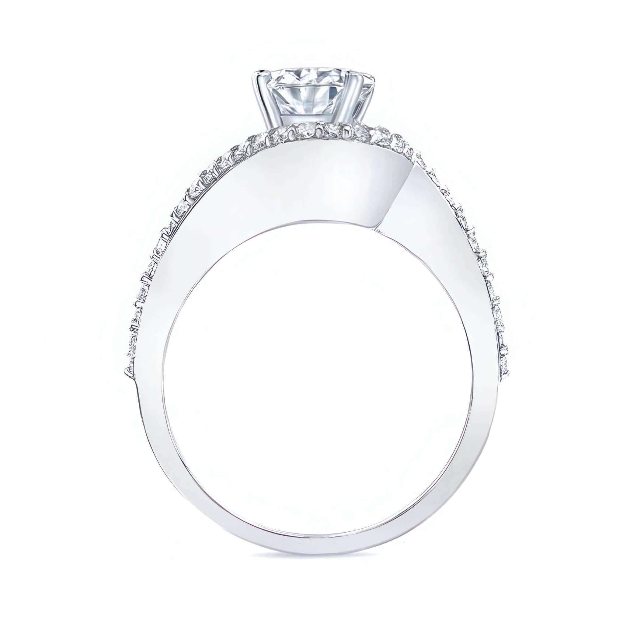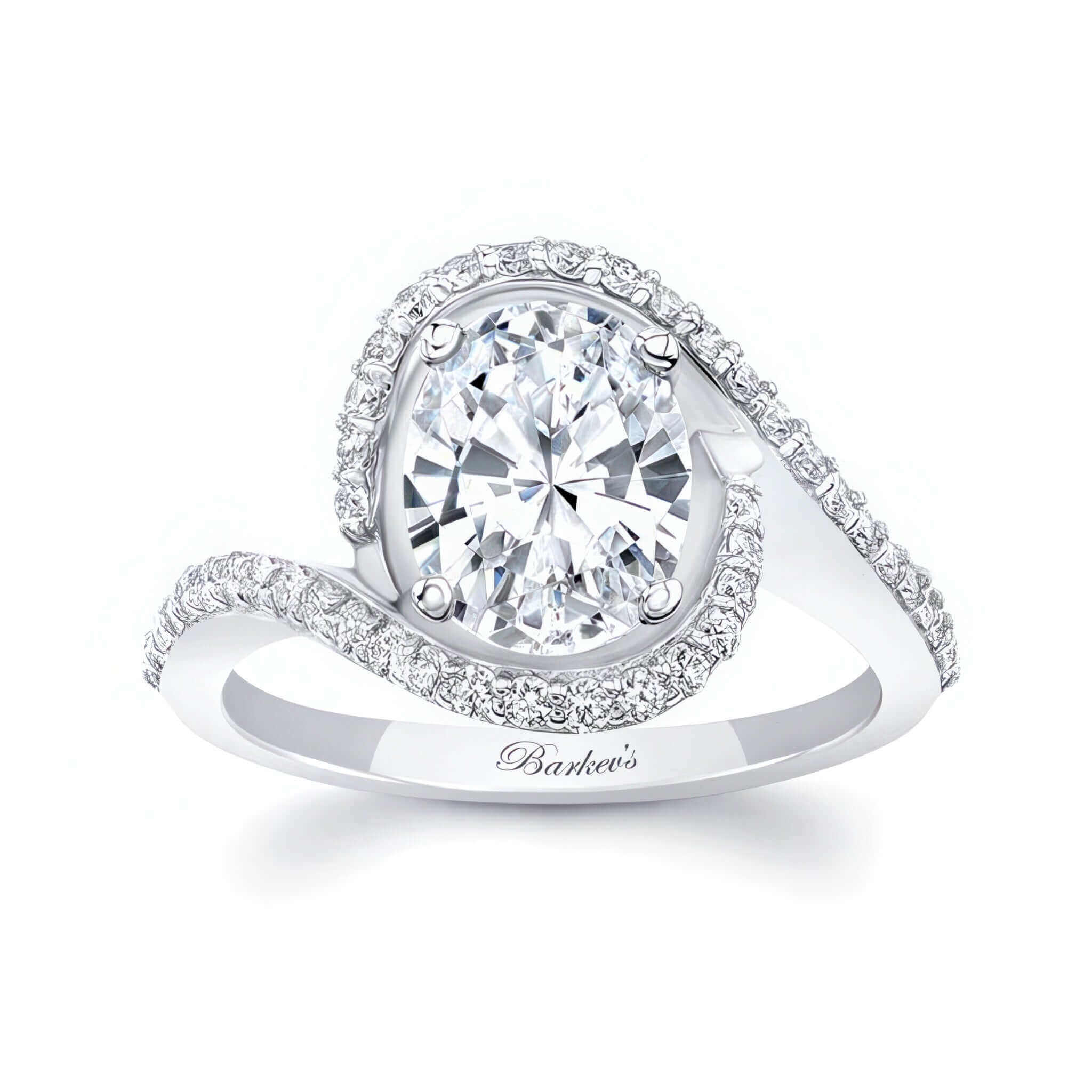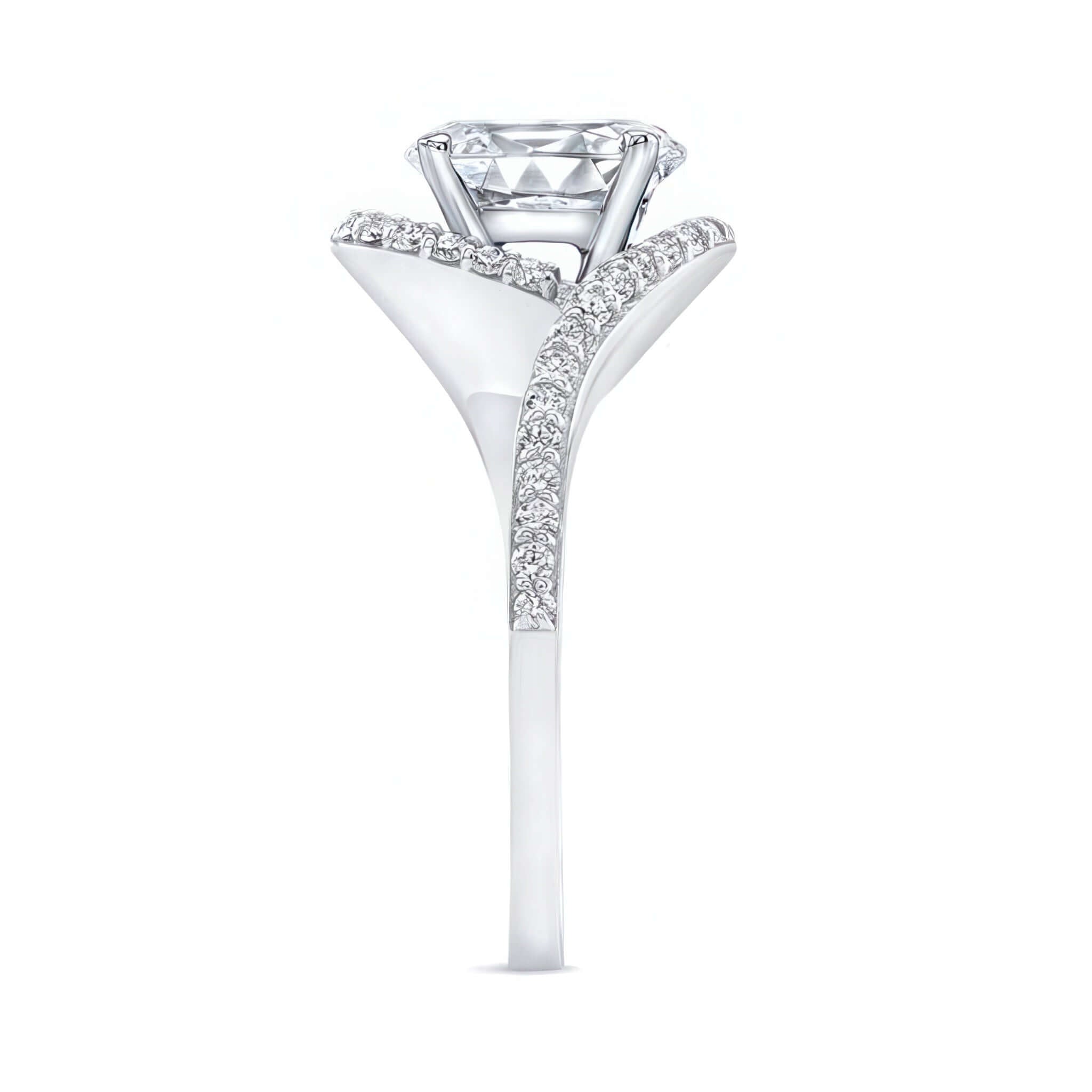 This 2 carat oval moissanite ring features a split shank that curves around the center stone, which is presented in a floating semi halo by pave diamonds that cascade down the shoulders in a swirl.