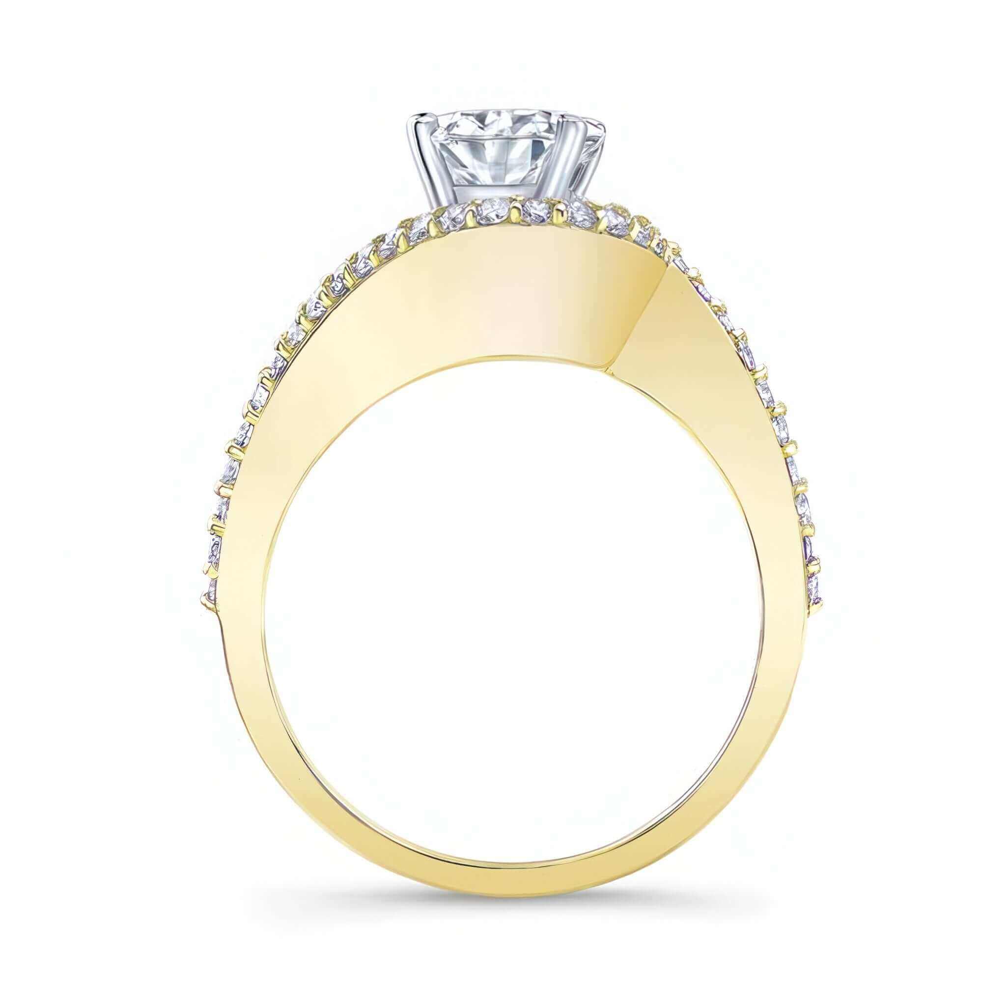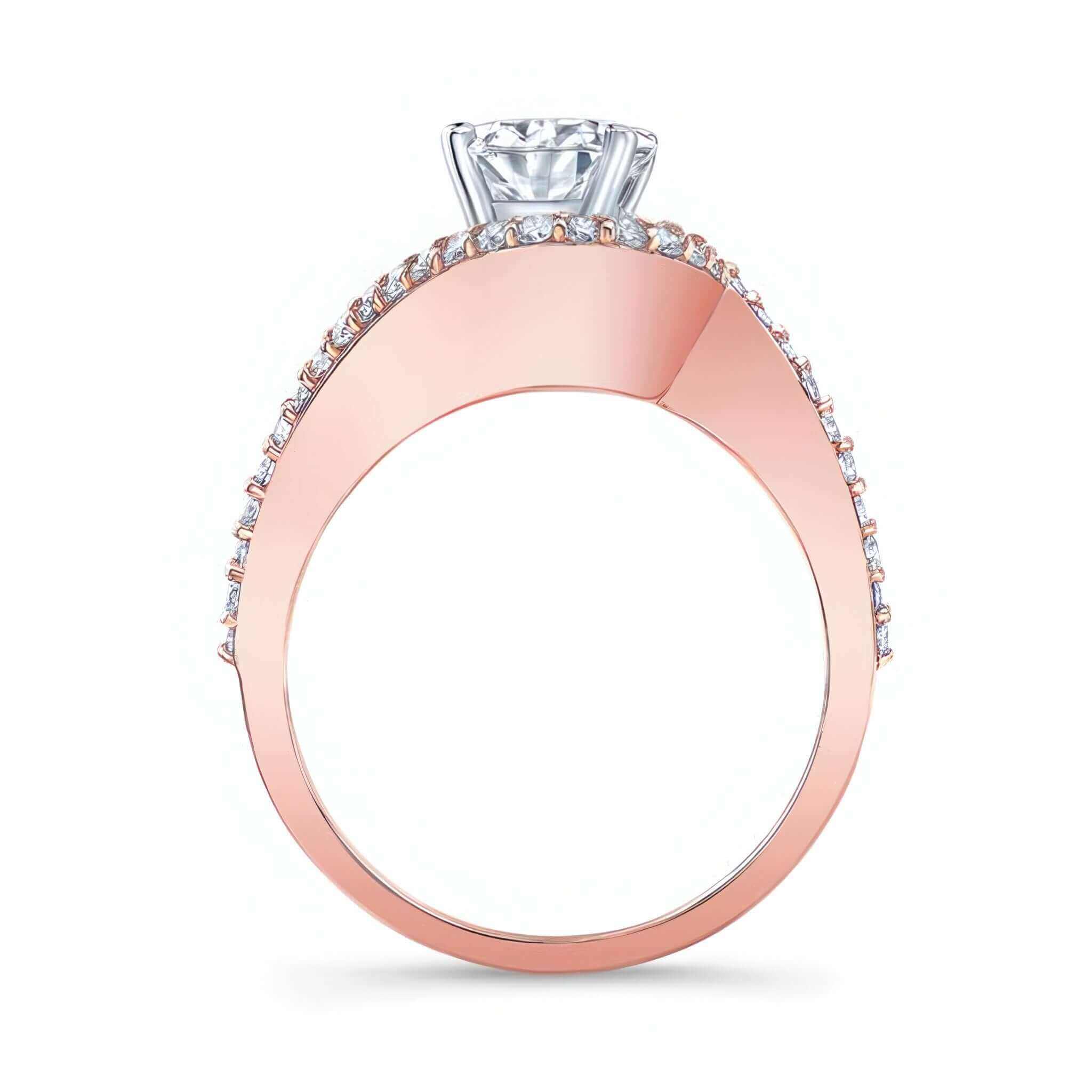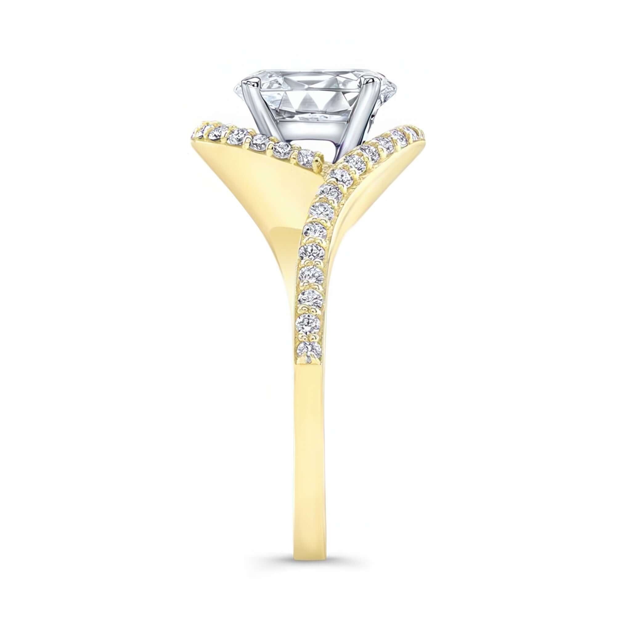 This 2 carat oval moissanite ring features a split shank that curves around the center stone, which is presented in a floating semi halo by pave diamonds that cascade down the shoulders in a swirl.
