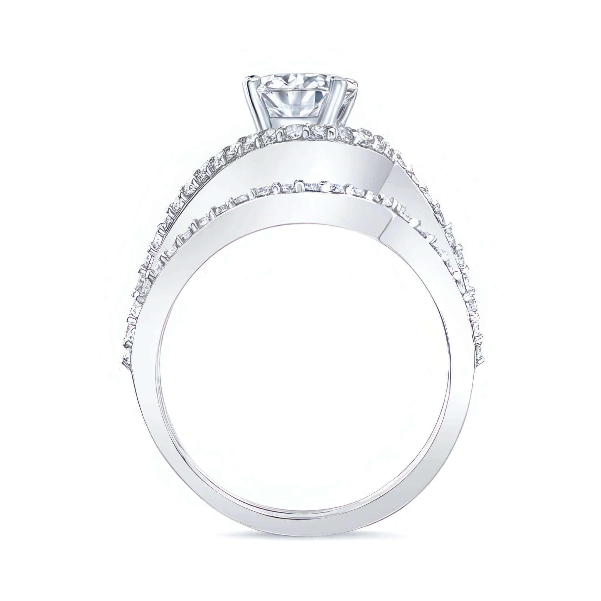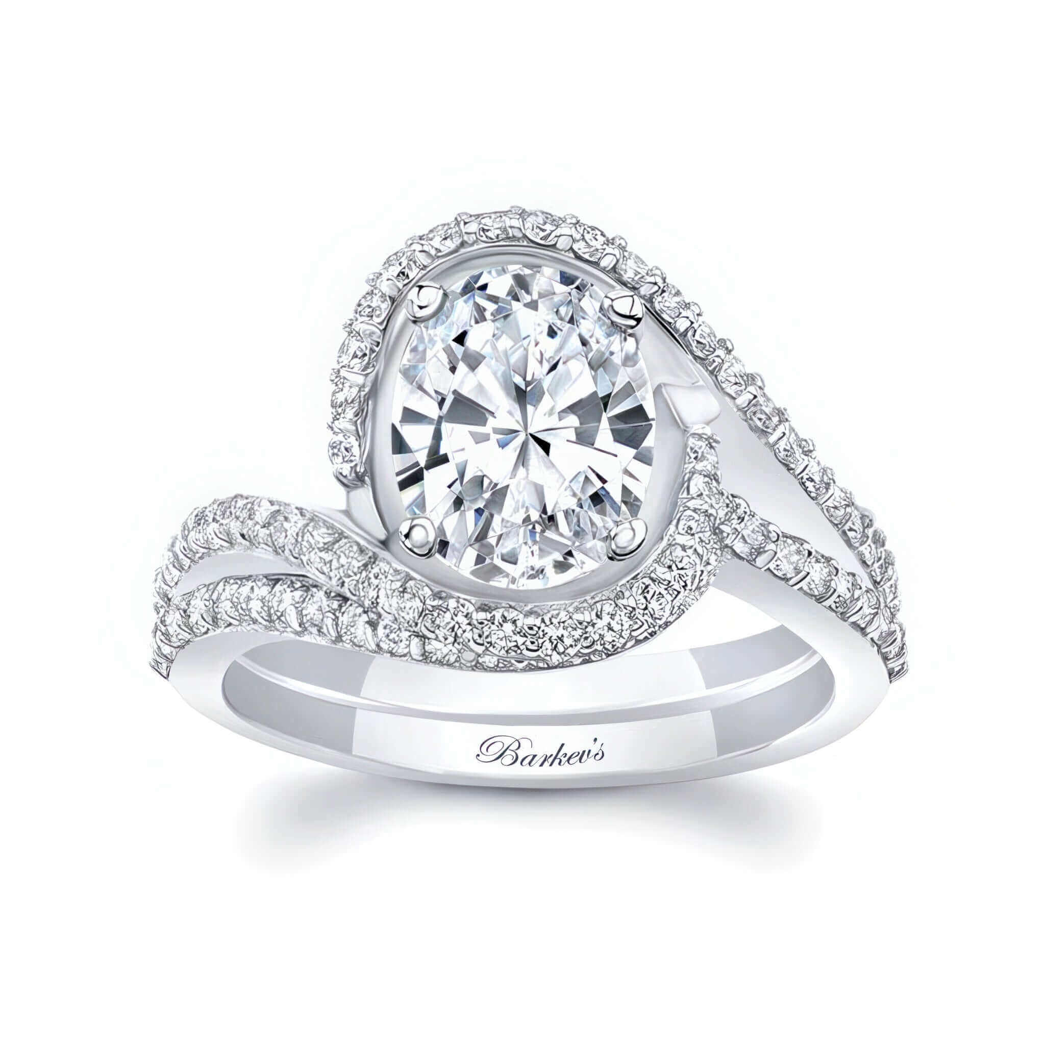 This 2 carat oval moissanite wedding ring set features a split shank that curves around the center stone, which is presented in a floating semi halo by pave diamonds that cascade down the shoulders in a swirl.