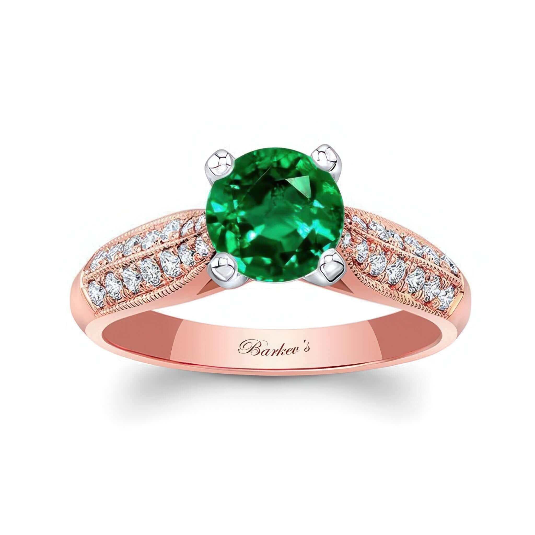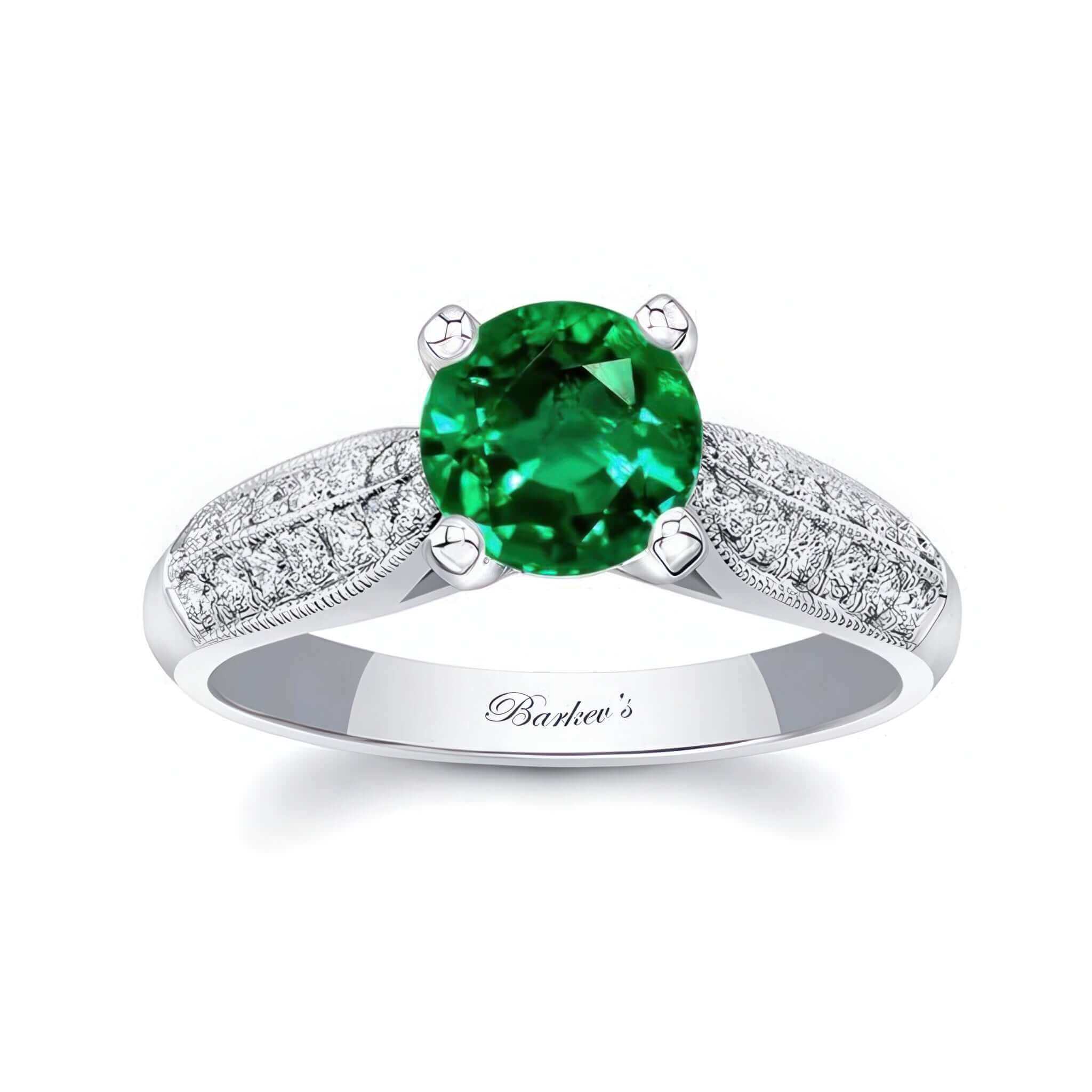 A beautiful 2 row emerald and diamond ring featuring two rows of diamonds neatly set into the band and a brilliant 1 carat round center made to impress onlookers.