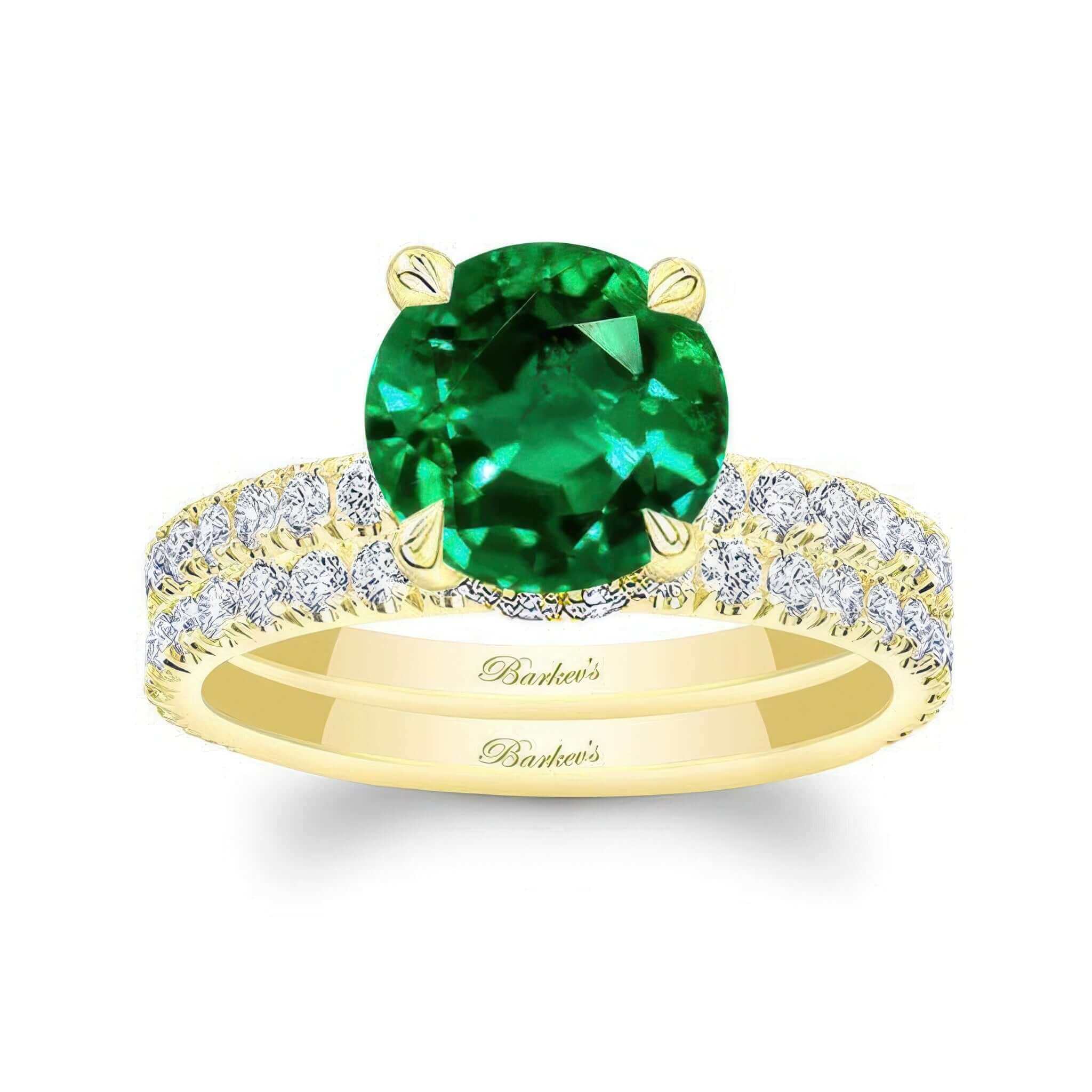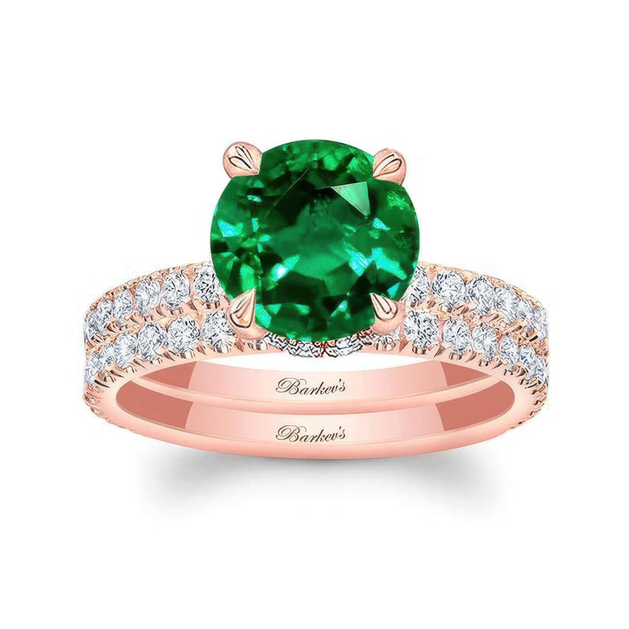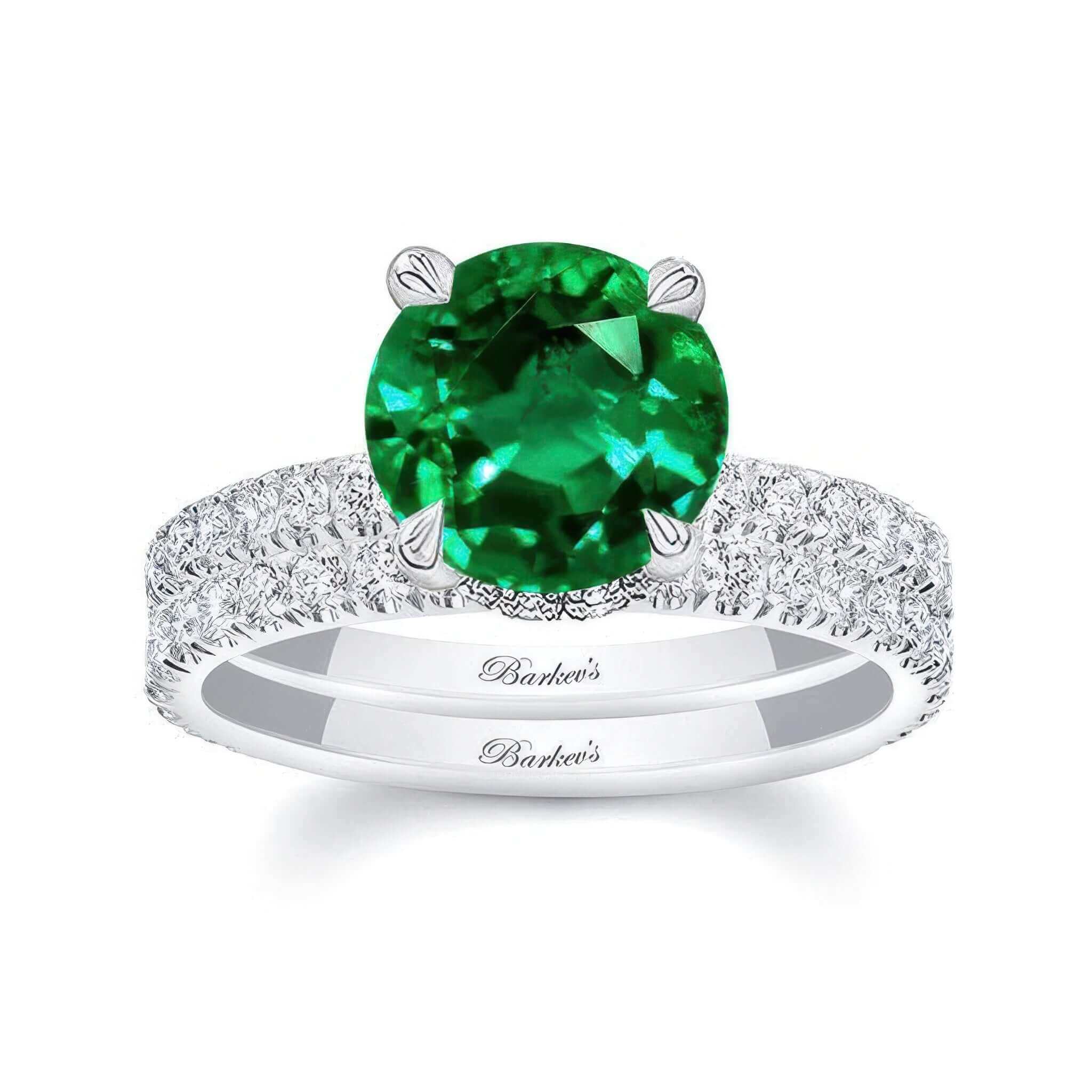 A brilliant 3 carat emerald and diamond halo wedding set featuring a prong set round center with a french cut pave diamond halo underneath it and more diamonds cascading down the shank. Comes with a matching diamond wedding band.