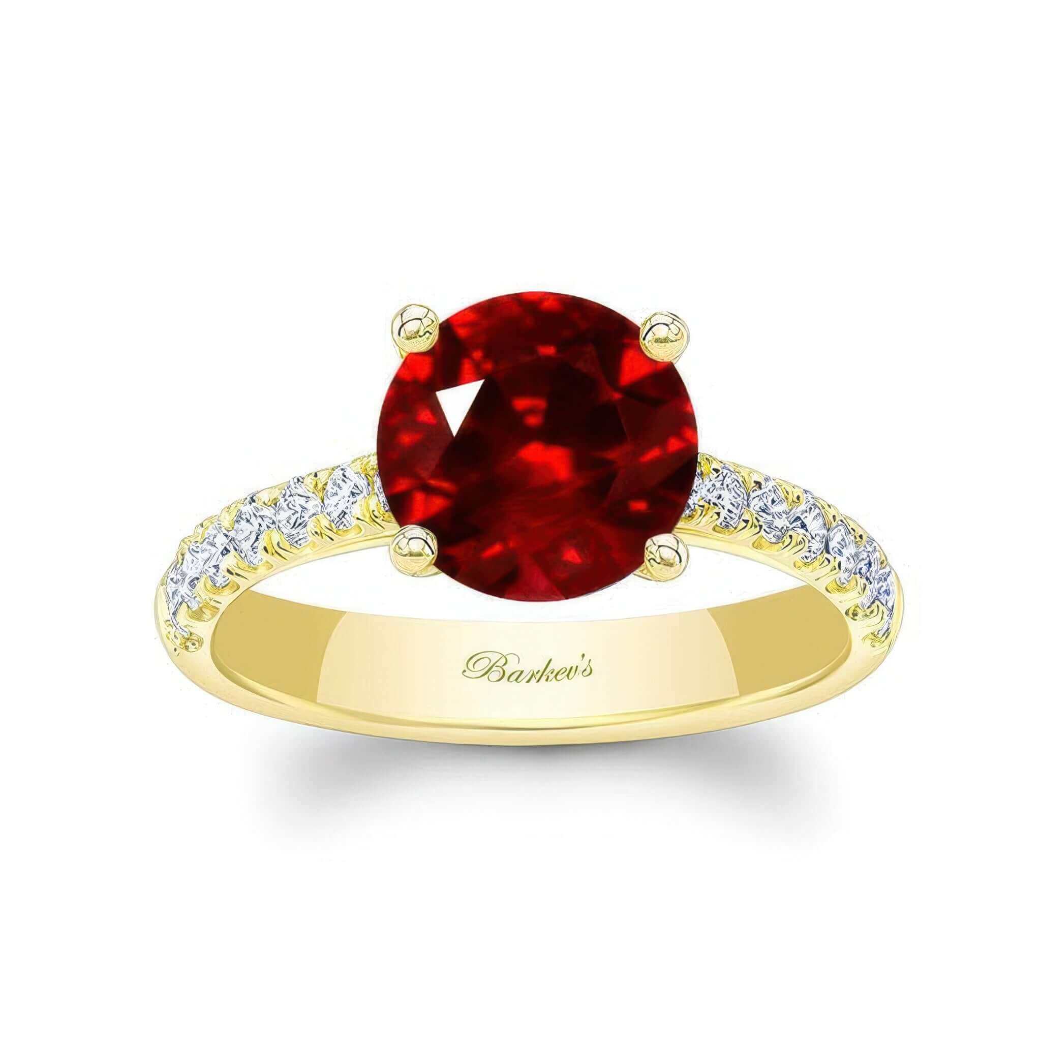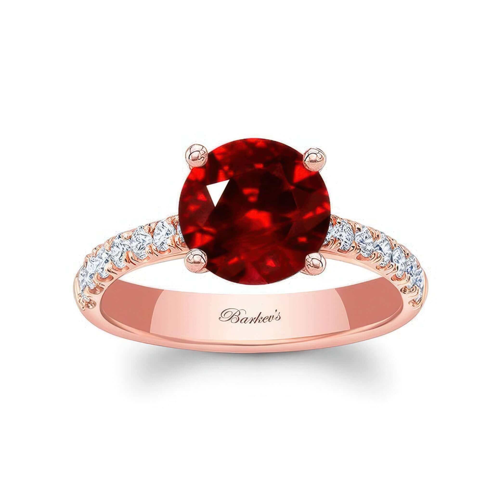 A beautiful 3 carat round ruby and diamond engagement ring featuring a prong set round center with french cut pave set diamonds on the sides for extra sparkle.