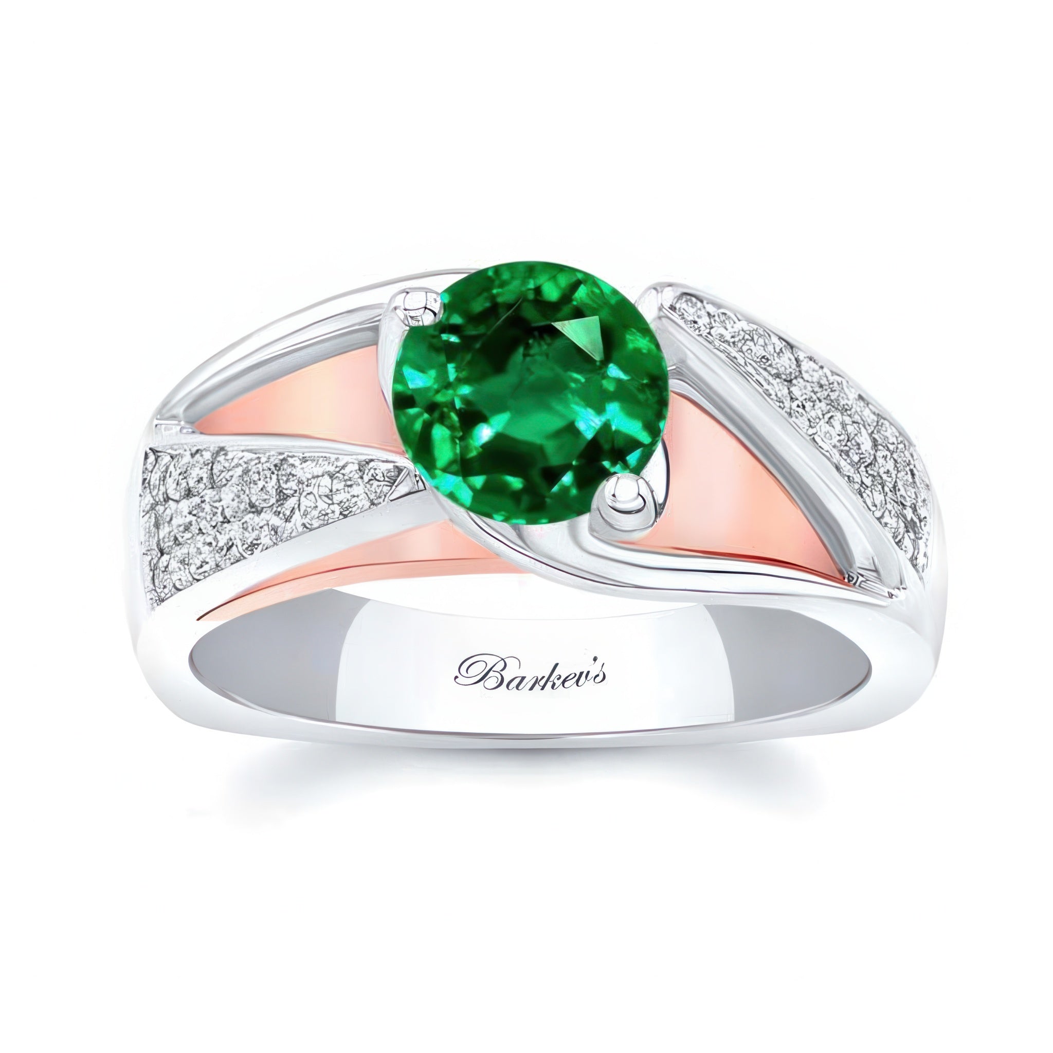 This 3 row emerald and diamond ring is artfully designed with cathedral shoulders that rise up to the prong set center. Three bold rows of pave set diamonds decorate both sides making a statement that will catch the eye of many admirers.