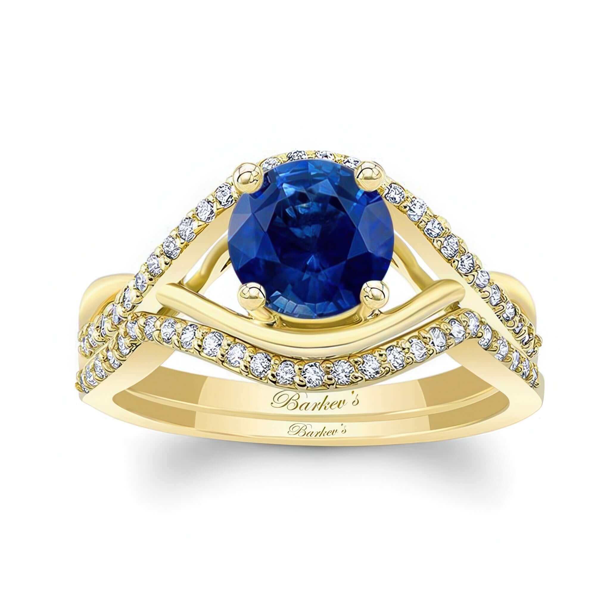 A beautiful blue sapphire and diamond criss cross ring set featuring a curving shank, shared prong set diamond melees and a round center stone. Also comes with a wedding band.