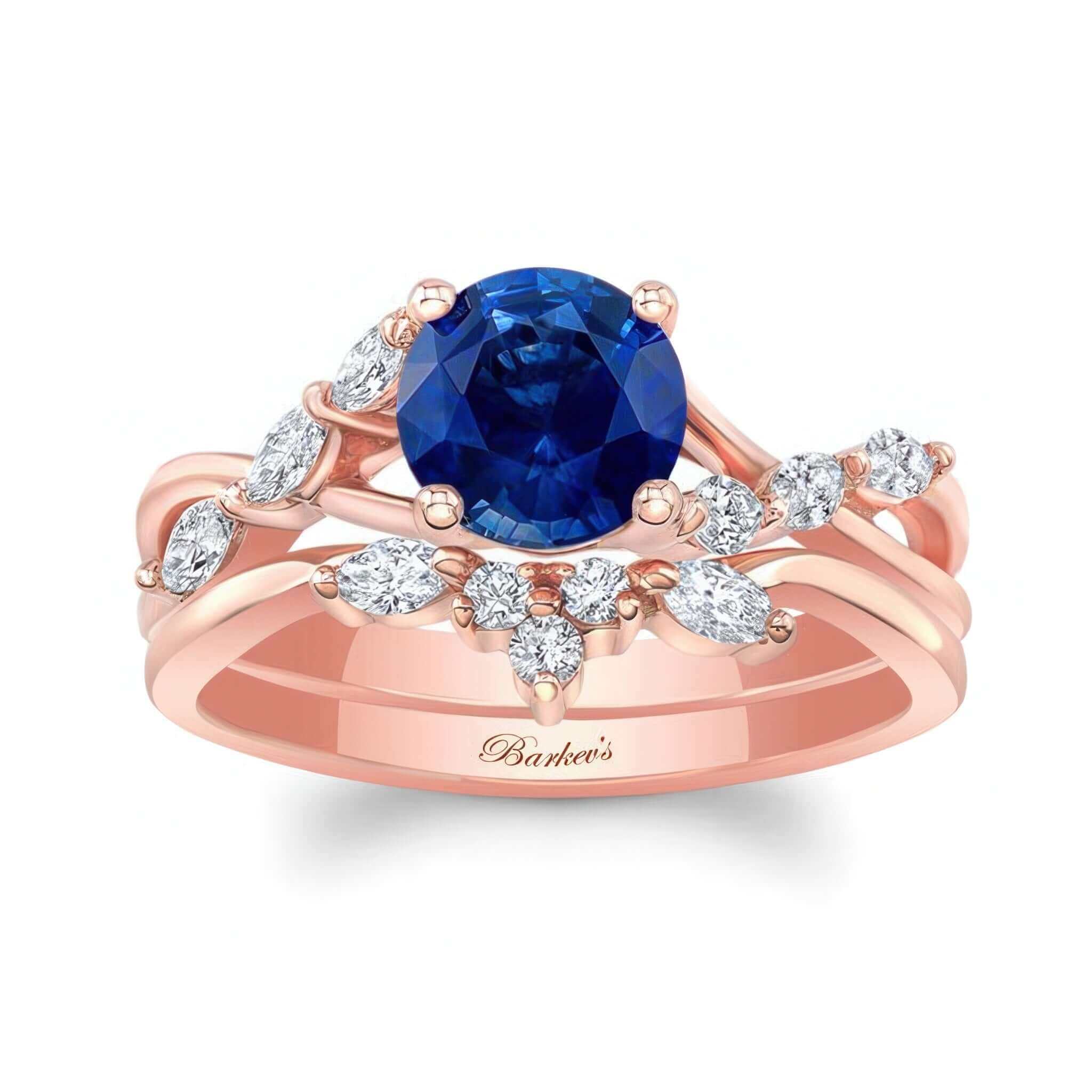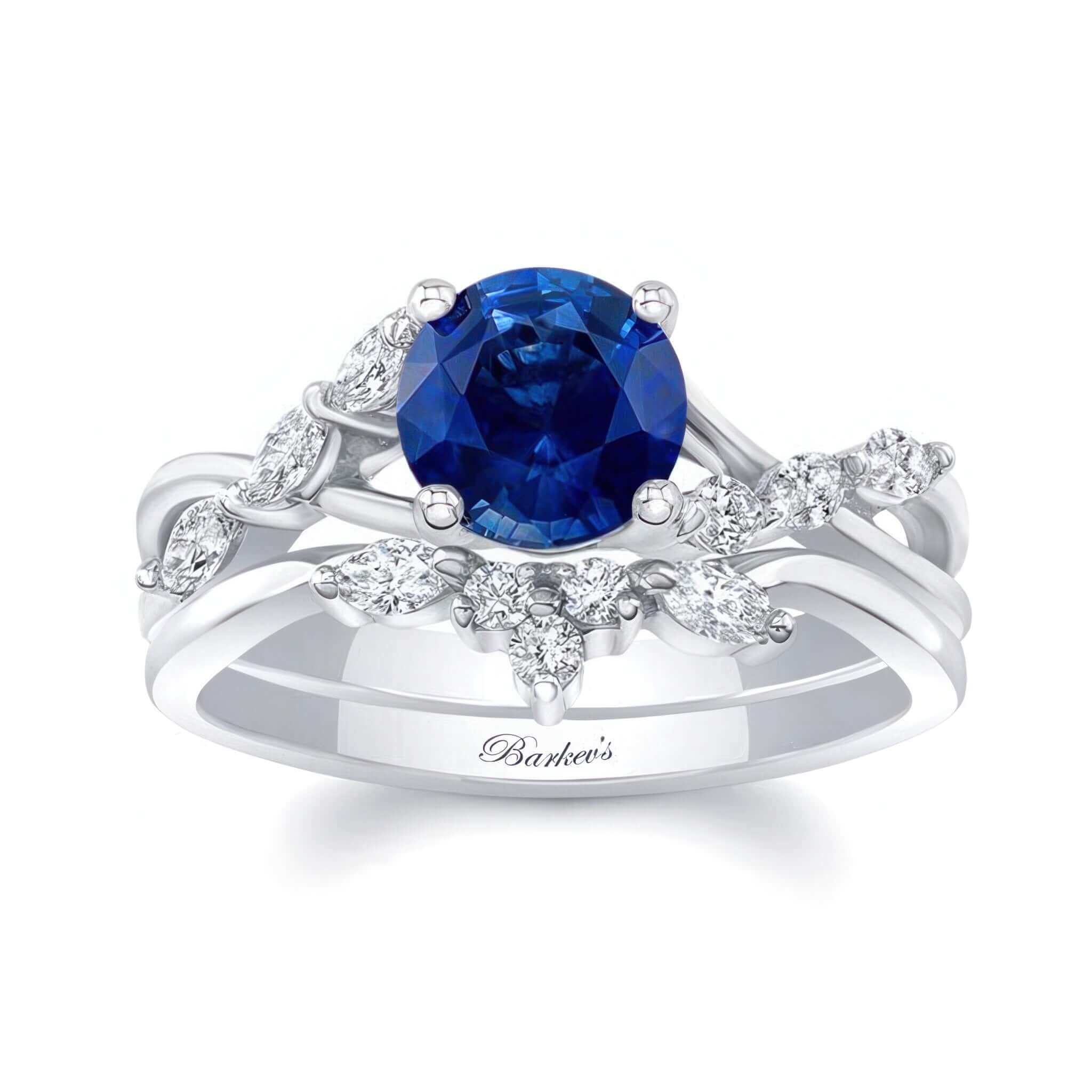 This blue sapphire and diamond marquise accent wedding set gives off a classic vibe, with a round diamond center, diamonds adorning the sides and a sparkling wedding band with an elegant curve of diamonds.