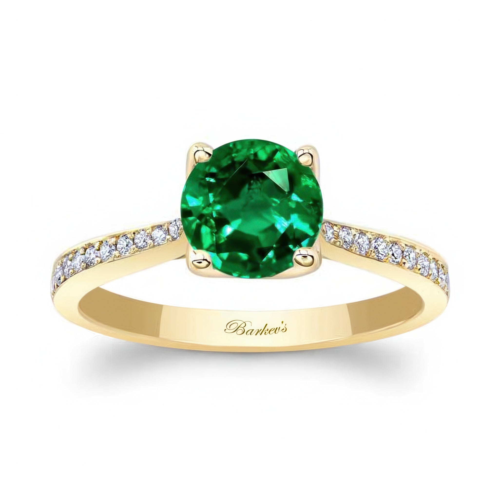 This classic emerald and diamond engagement ring is graced with a delicate shank that meets the prong set round center with glamorous pave set diamonds on the sides adding a final touch of brilliance.