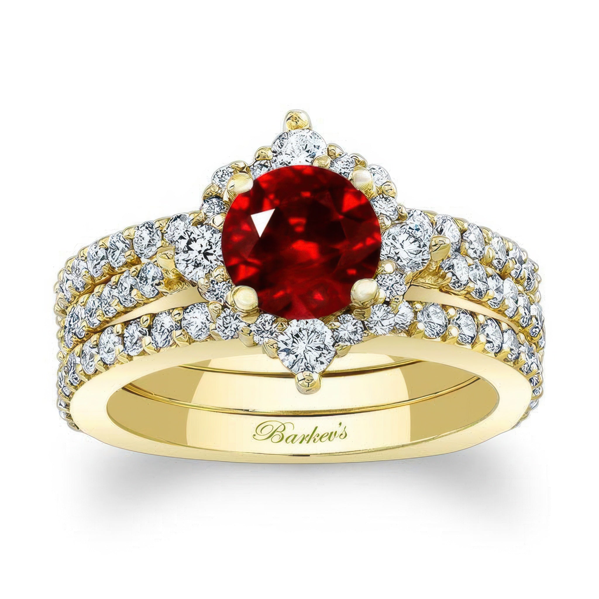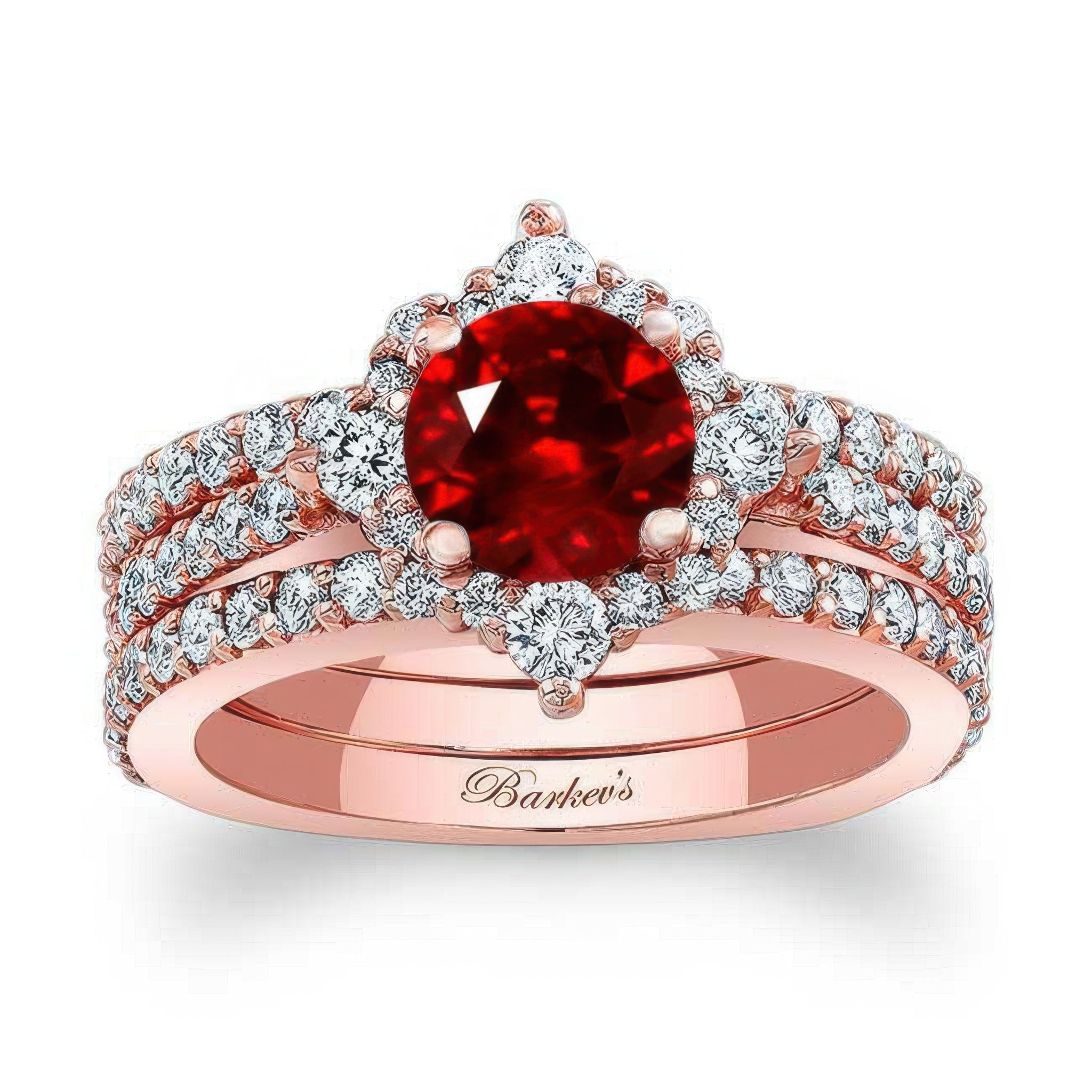 Classic Halo Ruby And Diamond Bridal Set With 2 Bands