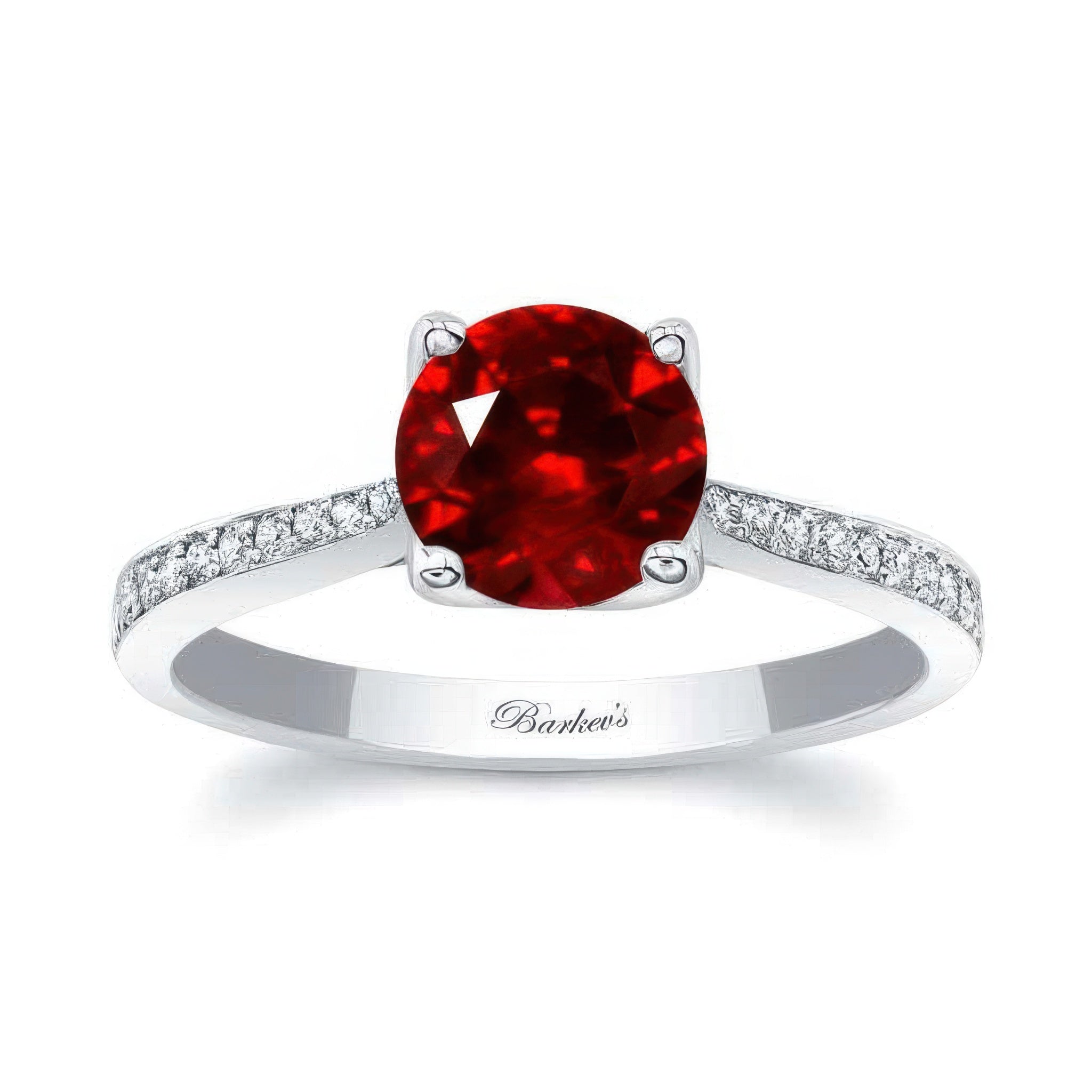 This classic ruby and diamond engagement ring is graced with a delicate shank that meets the prong set round center with glamorous pave set diamonds on the sides adding a final touch of brilliance.