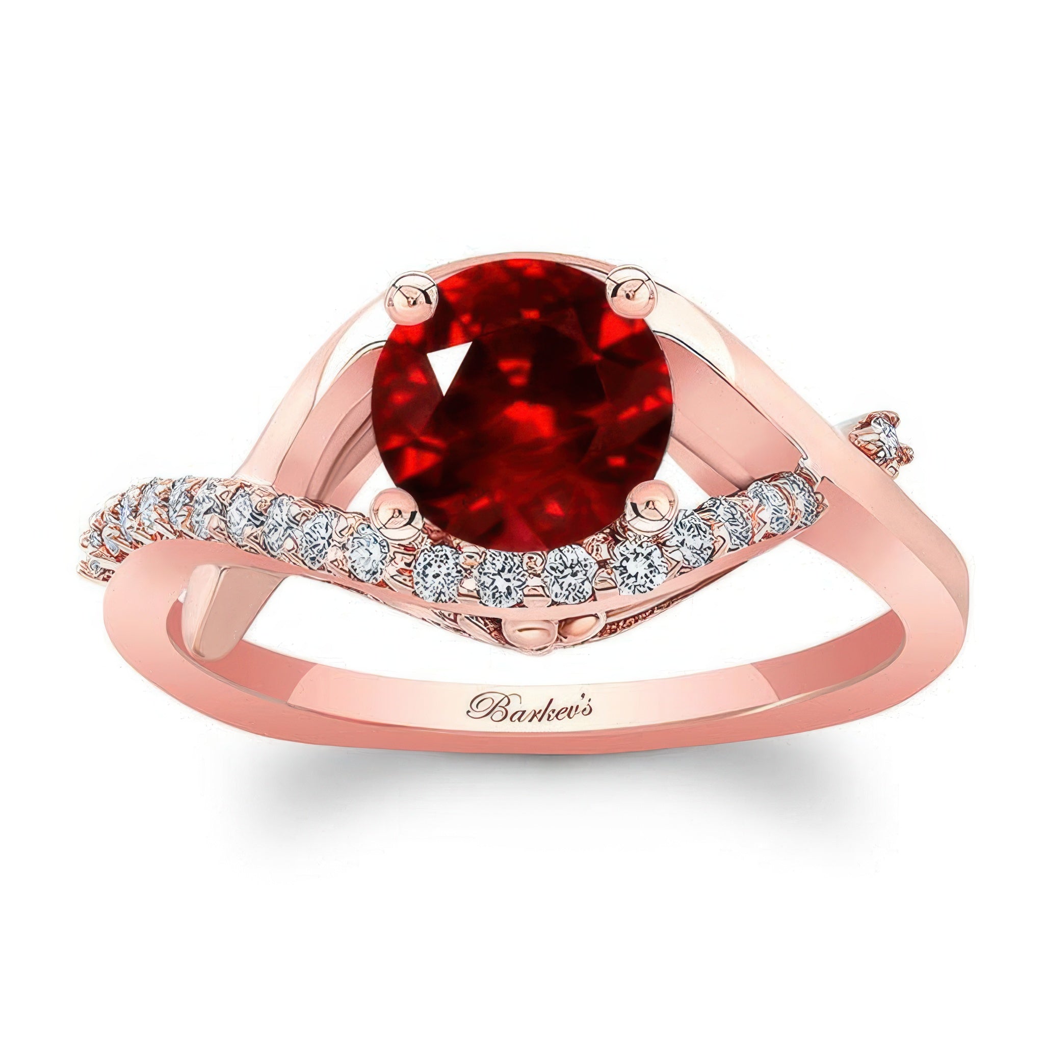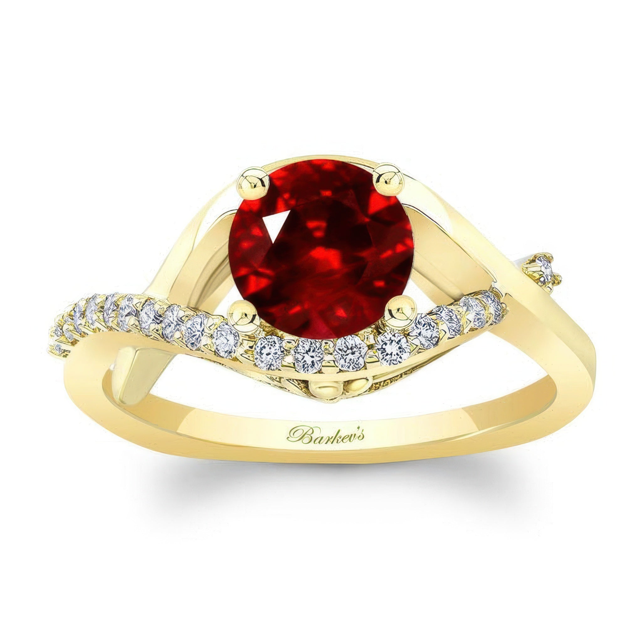 This criss cross ruby and diamond engagement ring features a prong set round center that stands gracefully in the middle of the curving open frame with one of the curves adorned with shared prong set diamonds for a dazzling work of art.