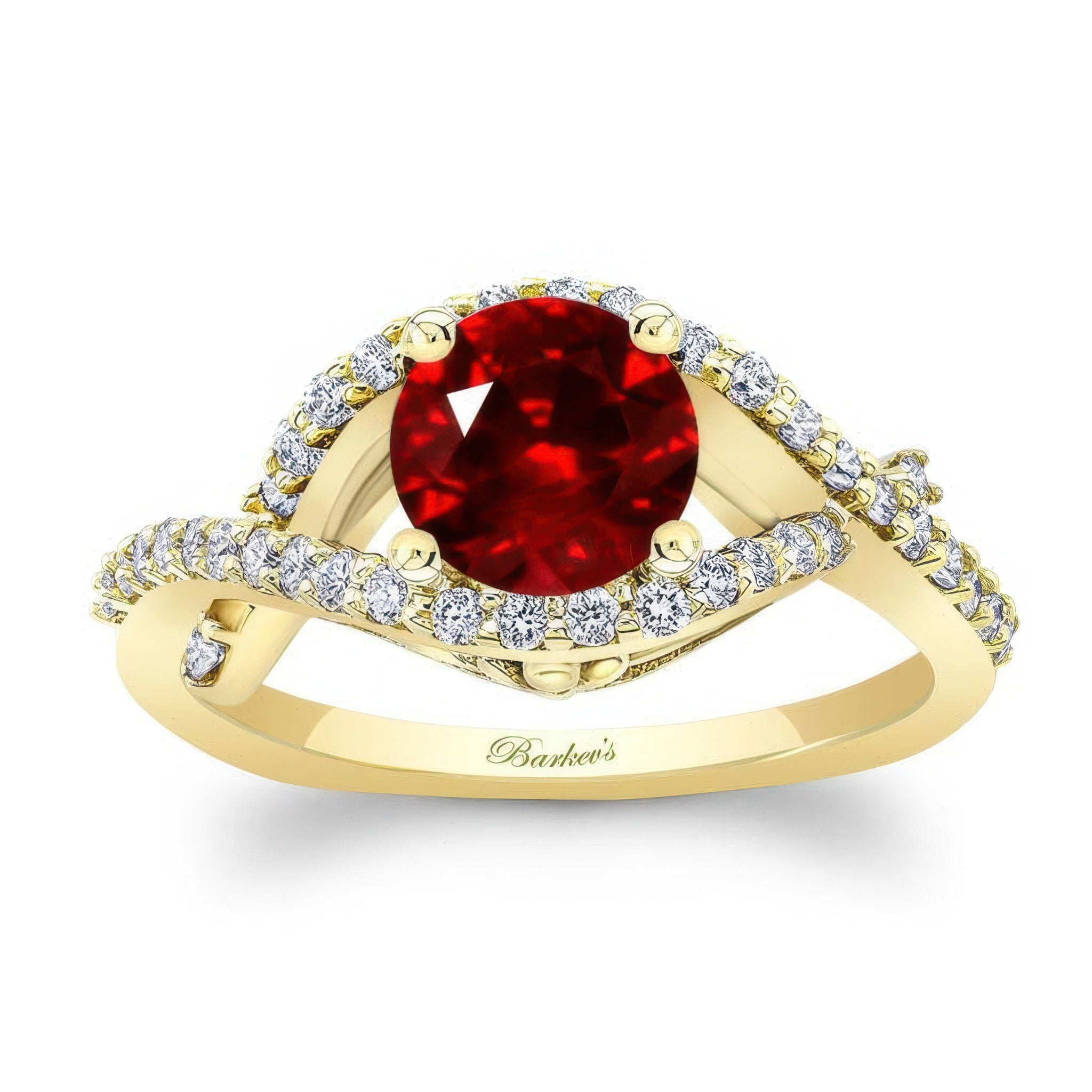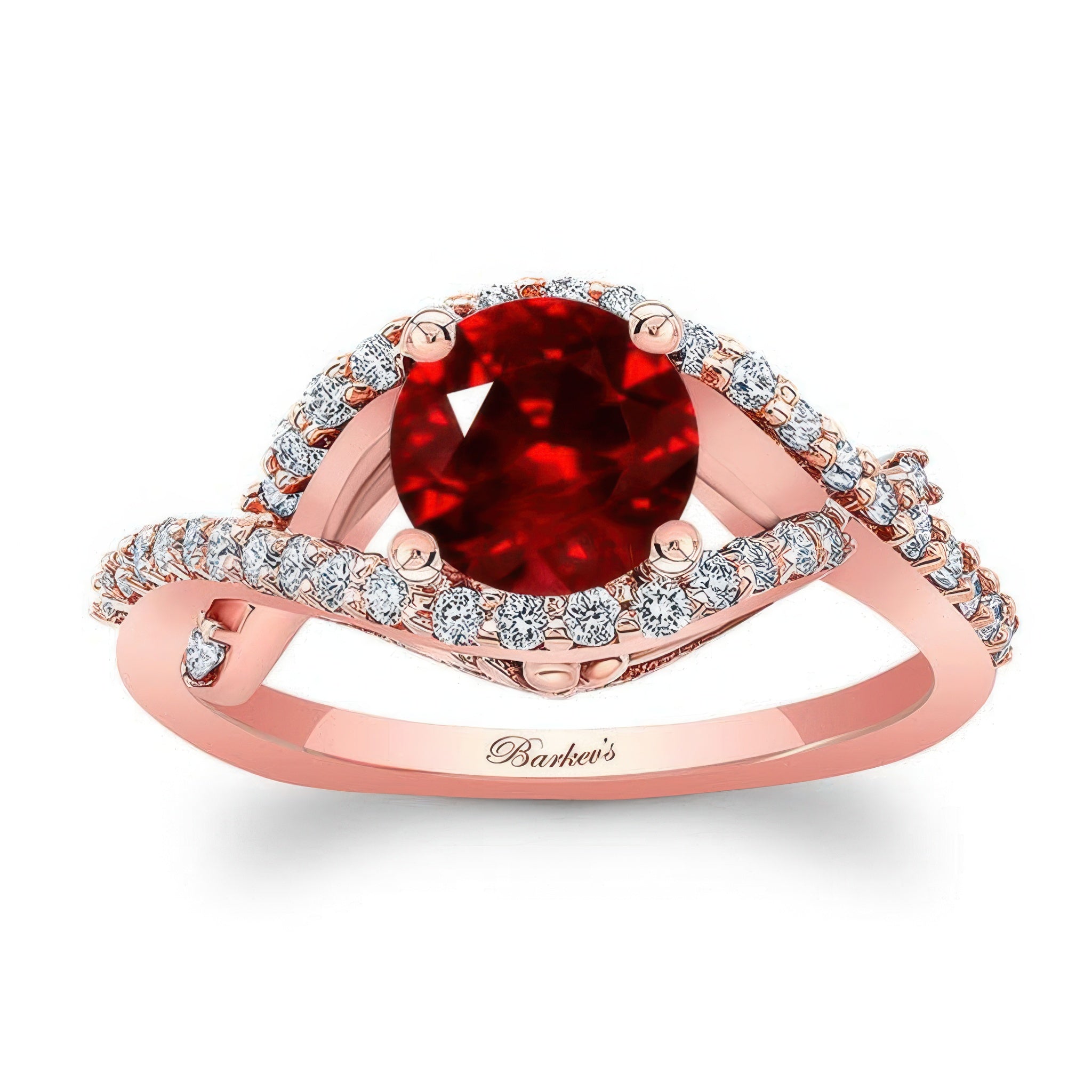 This criss cross ruby and diamond ring features a prong set round center with an open curving frame that's adorned with shared prong set diamonds for a sparkling work of art.
