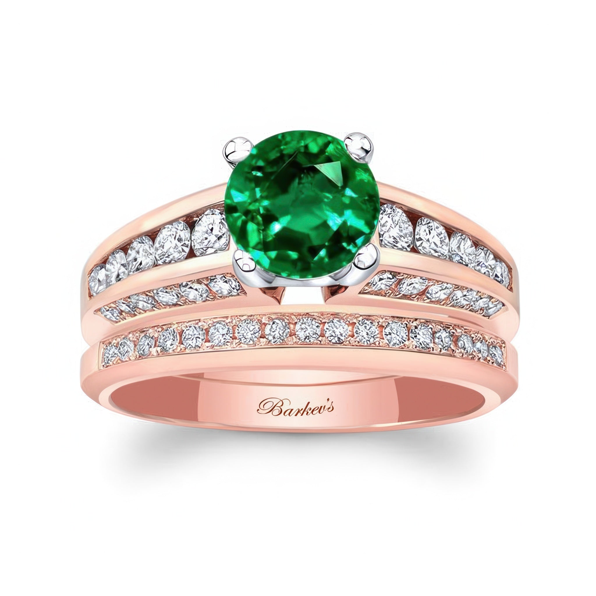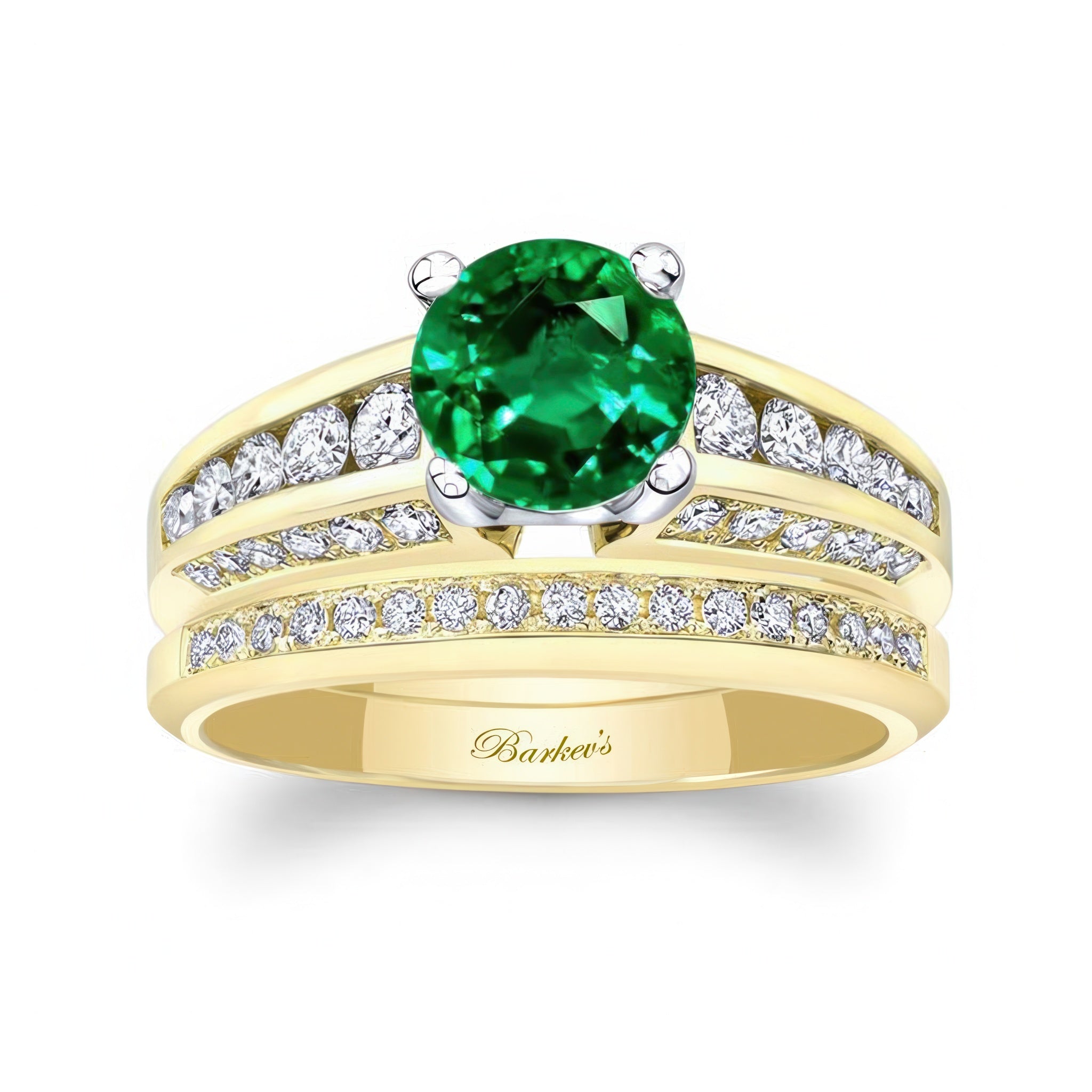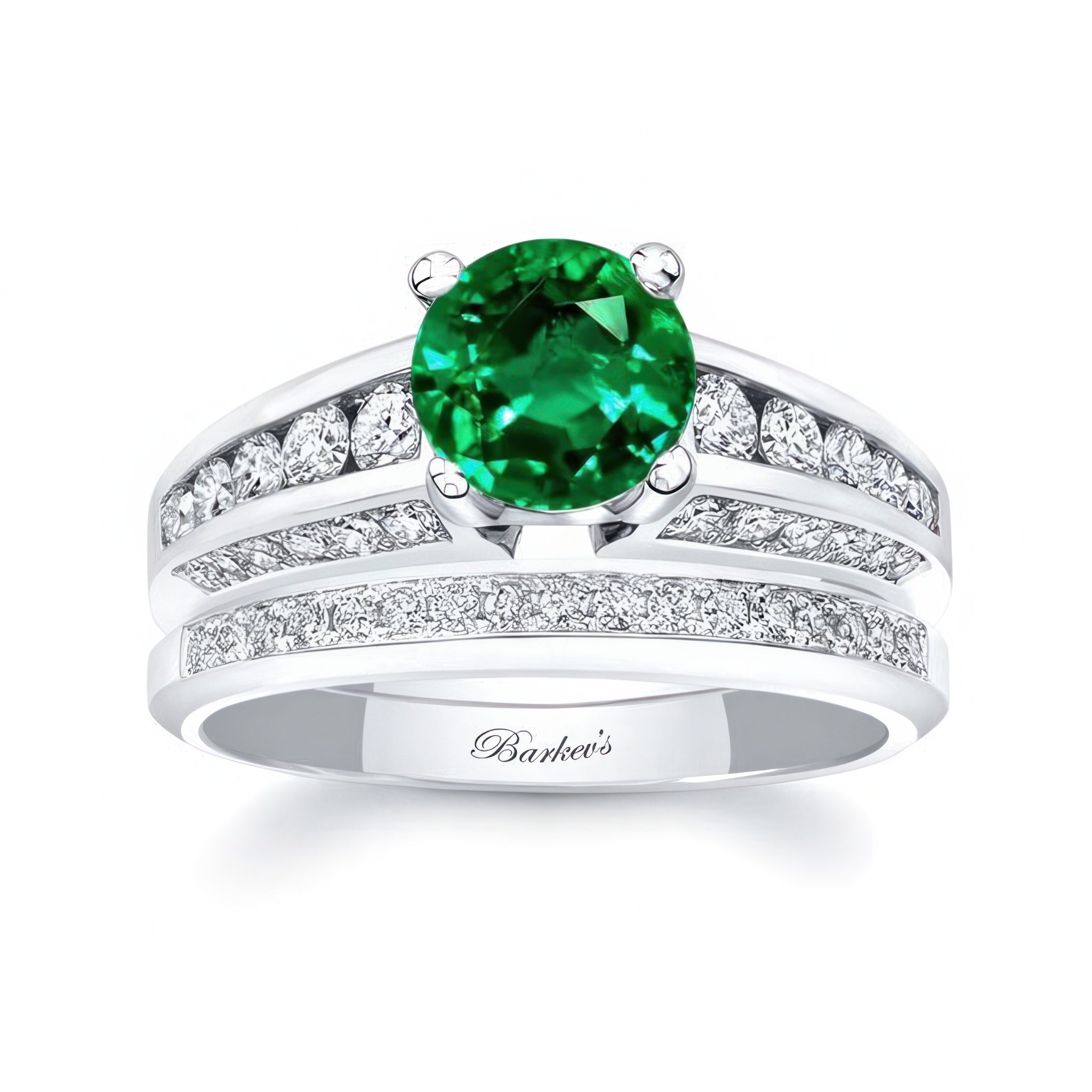 This magnificent emerald and diamond channel set wedding ring set boasts with sparkle from every angle featuring beveled edges and a round center that is met by a row of channel and pave diamonds adorning not only the top, but also each side of the shank. Adding to this brilliance, the diamond wedding band fits snuggly close to the engagement ring for an unparalleled look.