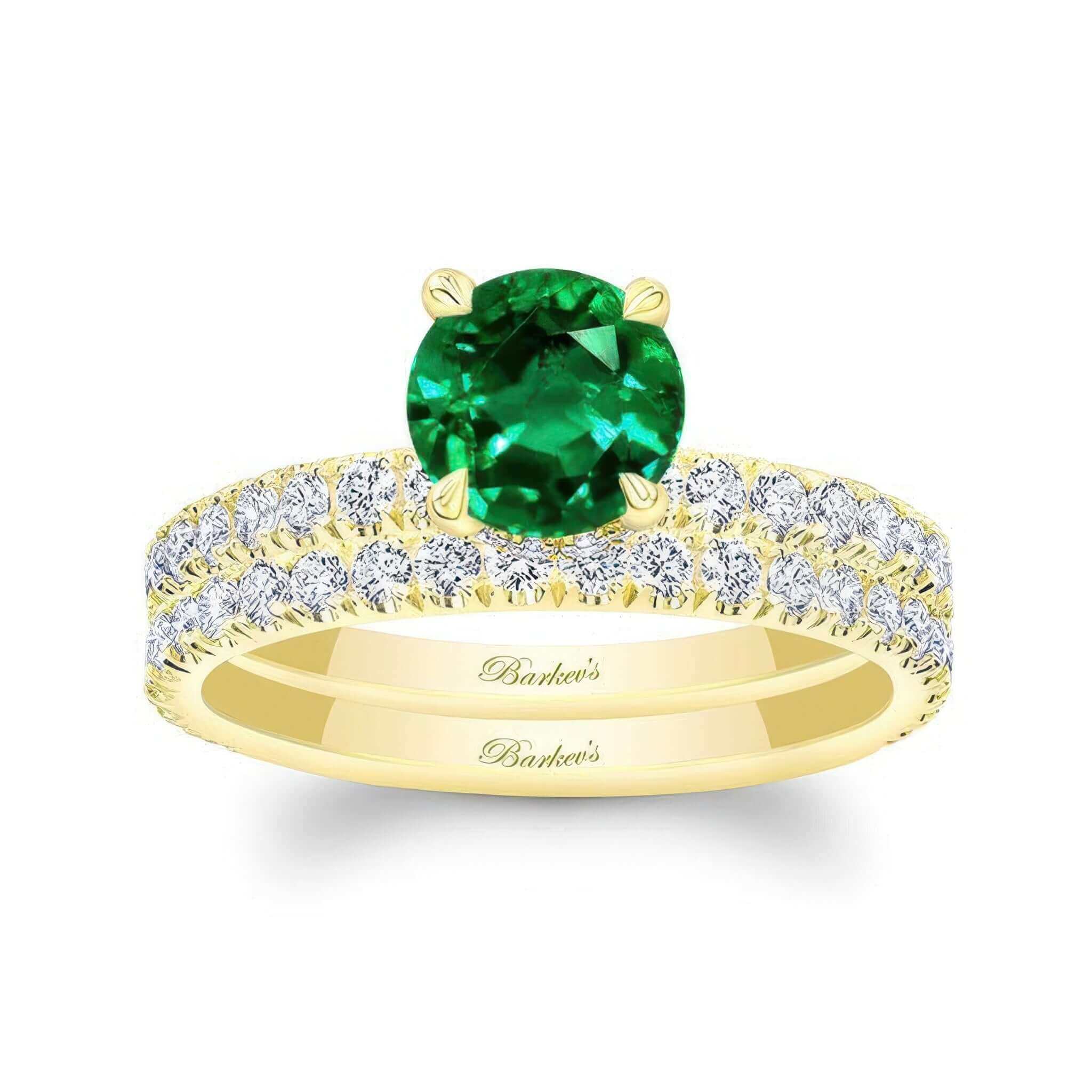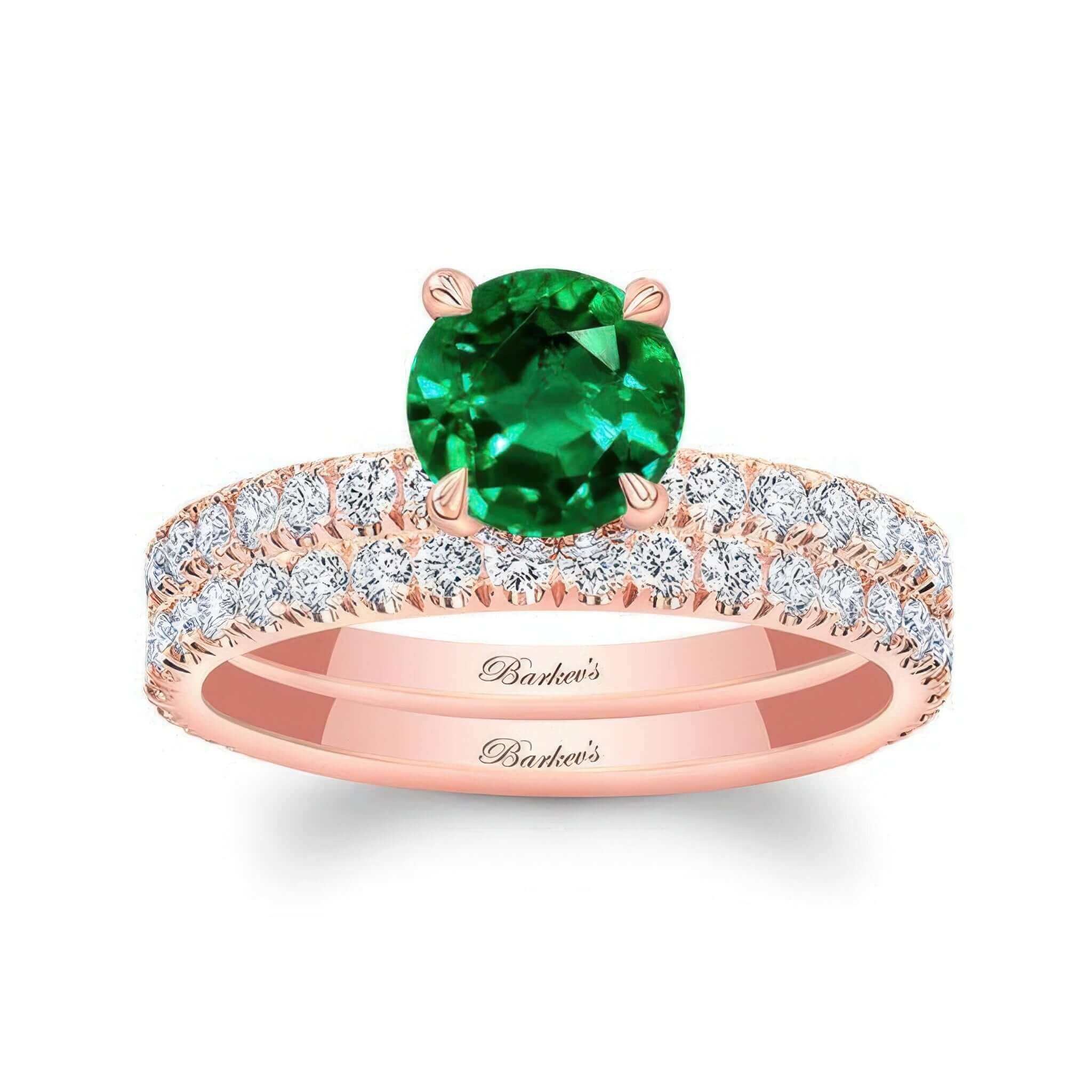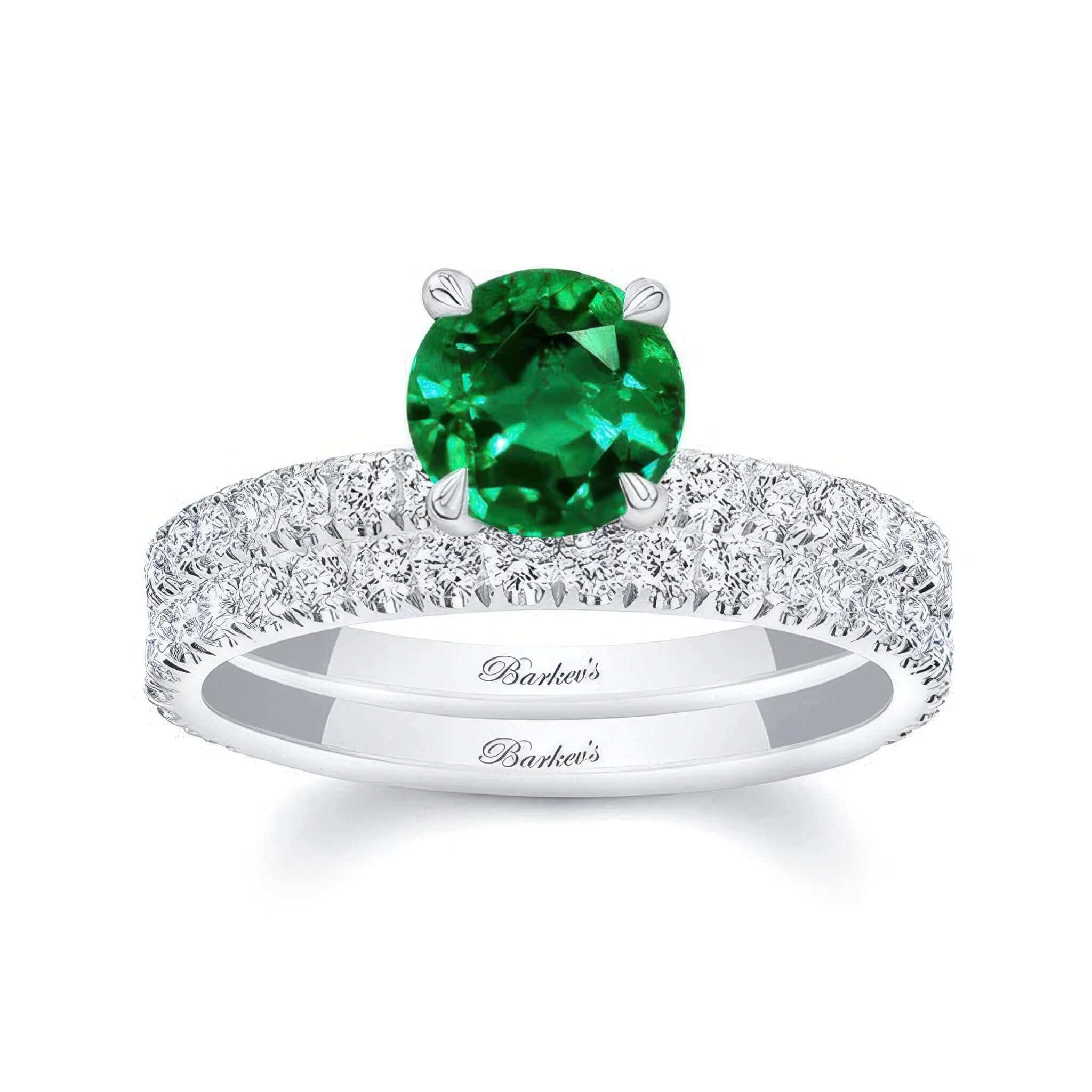 A brilliant emerald and diamond halo wedding set featuring a prong set round center with a french cut pave diamond halo underneath it and more diamonds cascading down the shank. Comes with a matching diamond wedding band.