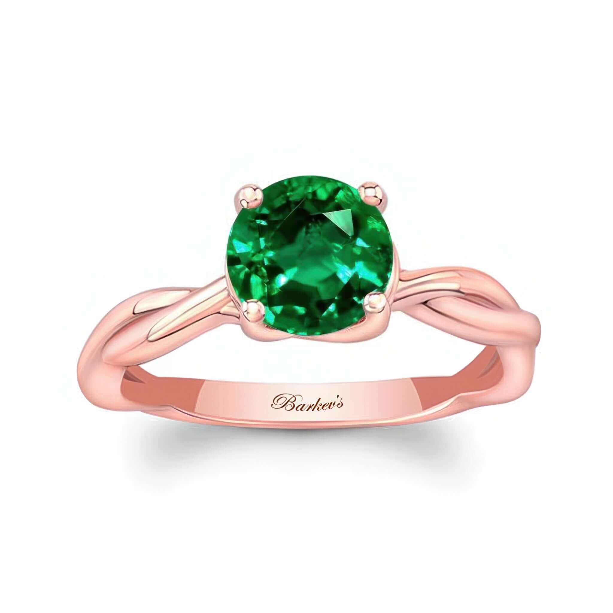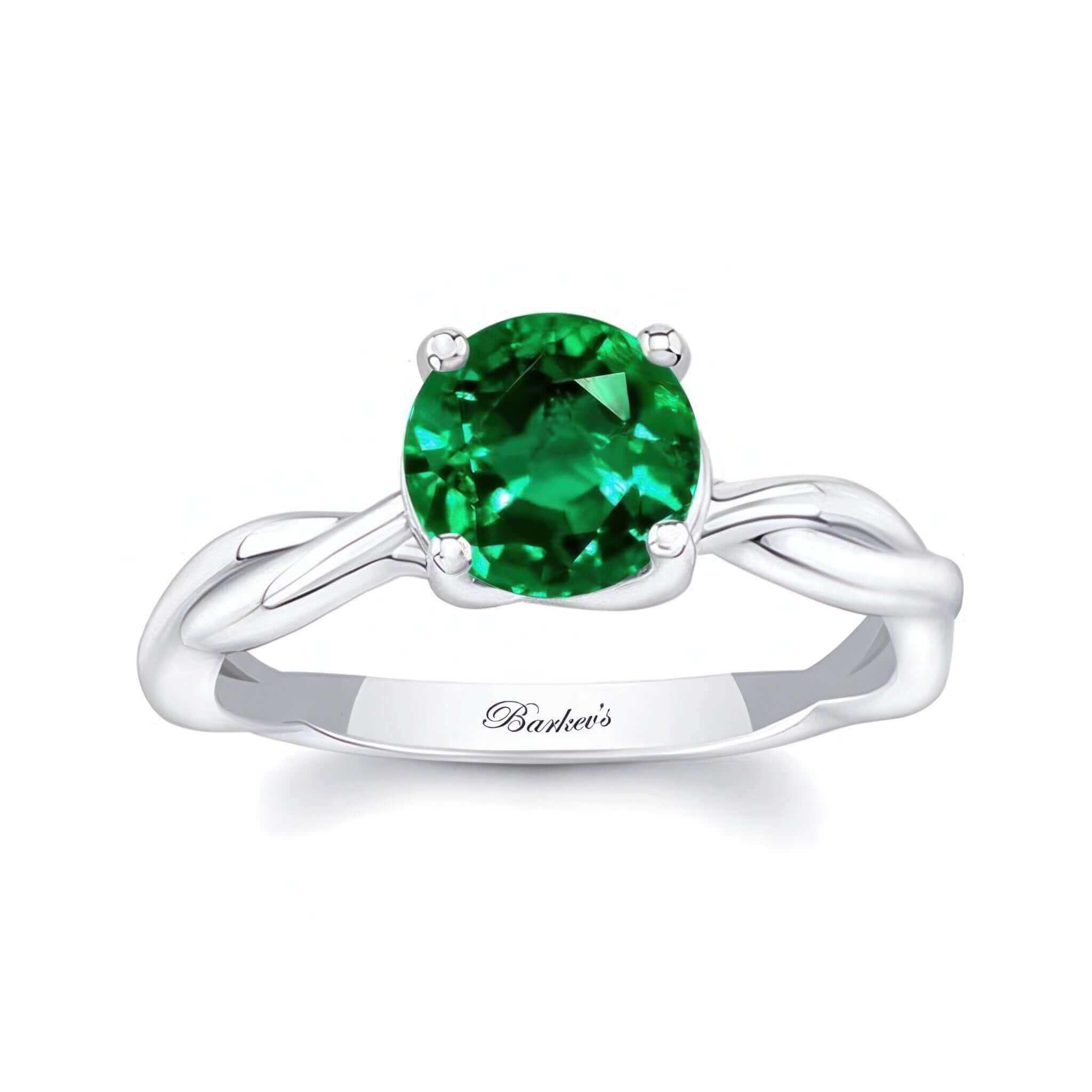 A beautiful emerald twist solitaire engagement ring featuring a unique curving and twisting shank with a prong set round center.